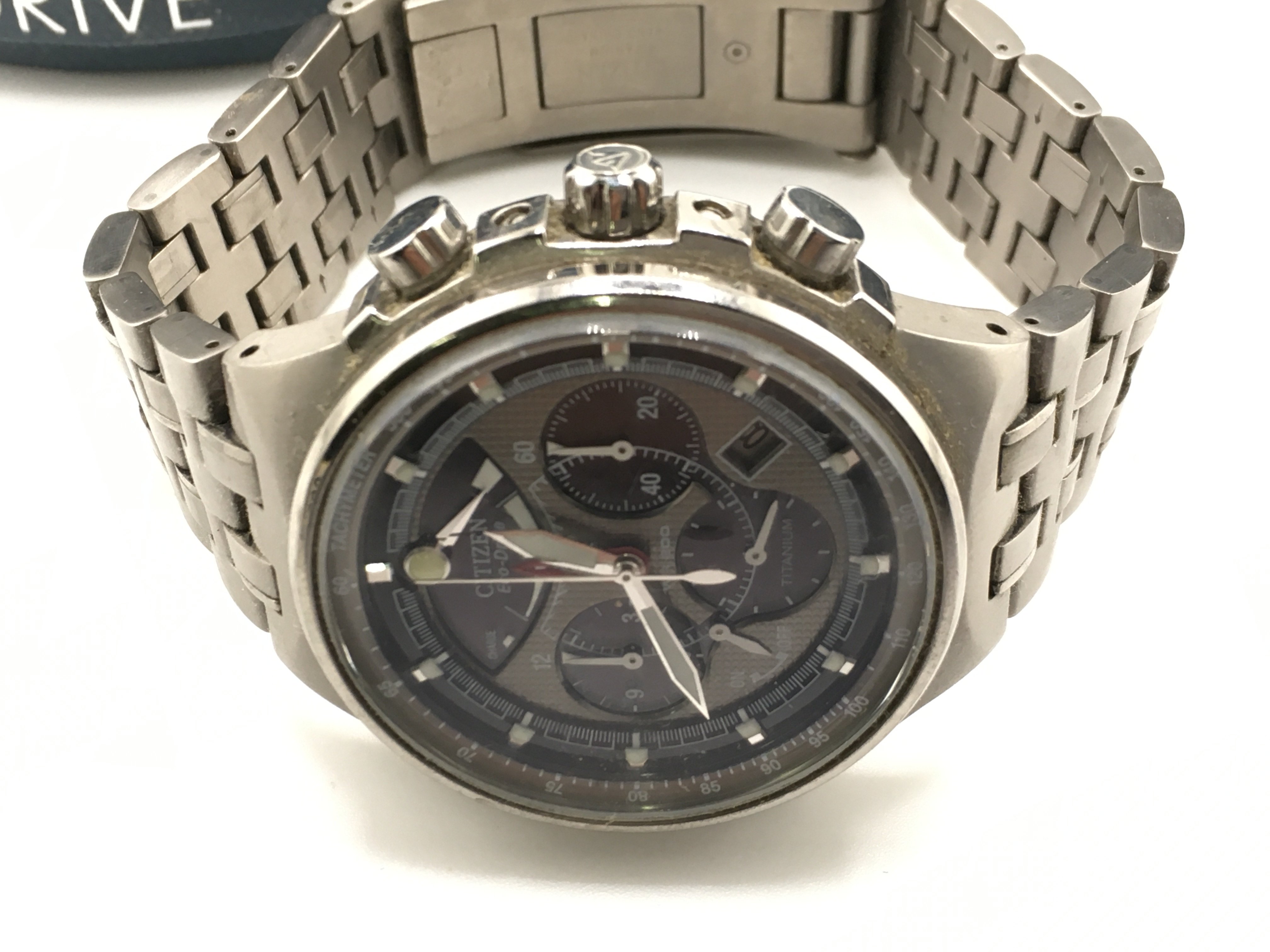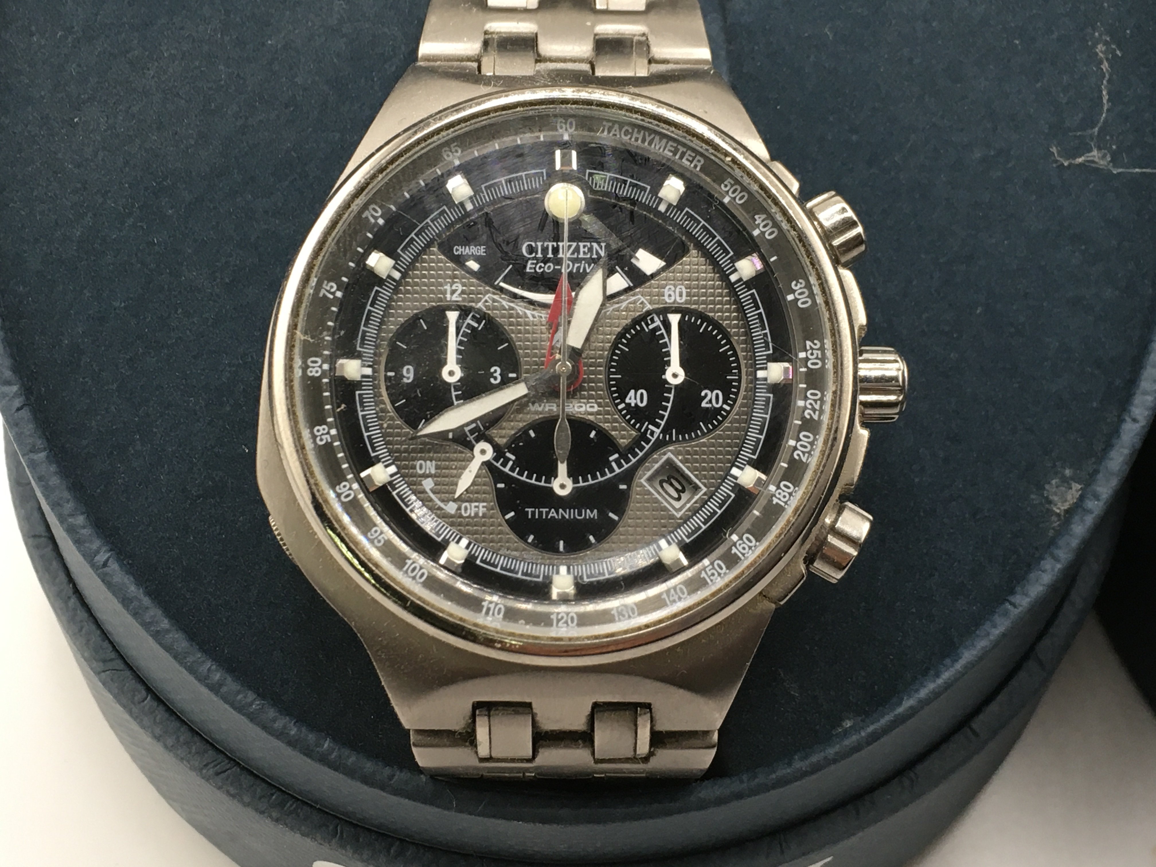 A boxed citizen eco drive wrist watch. Seen running. Approximately 45mm case. Postage B