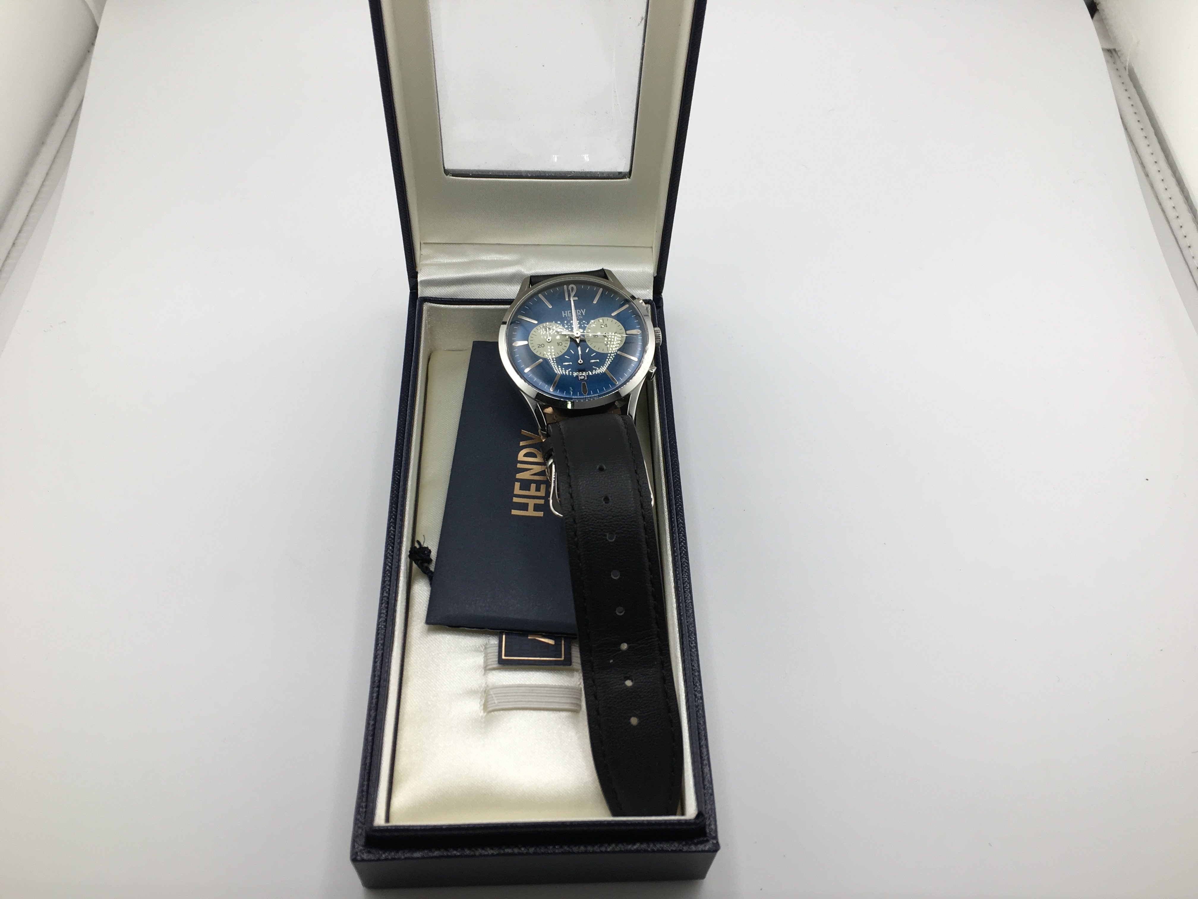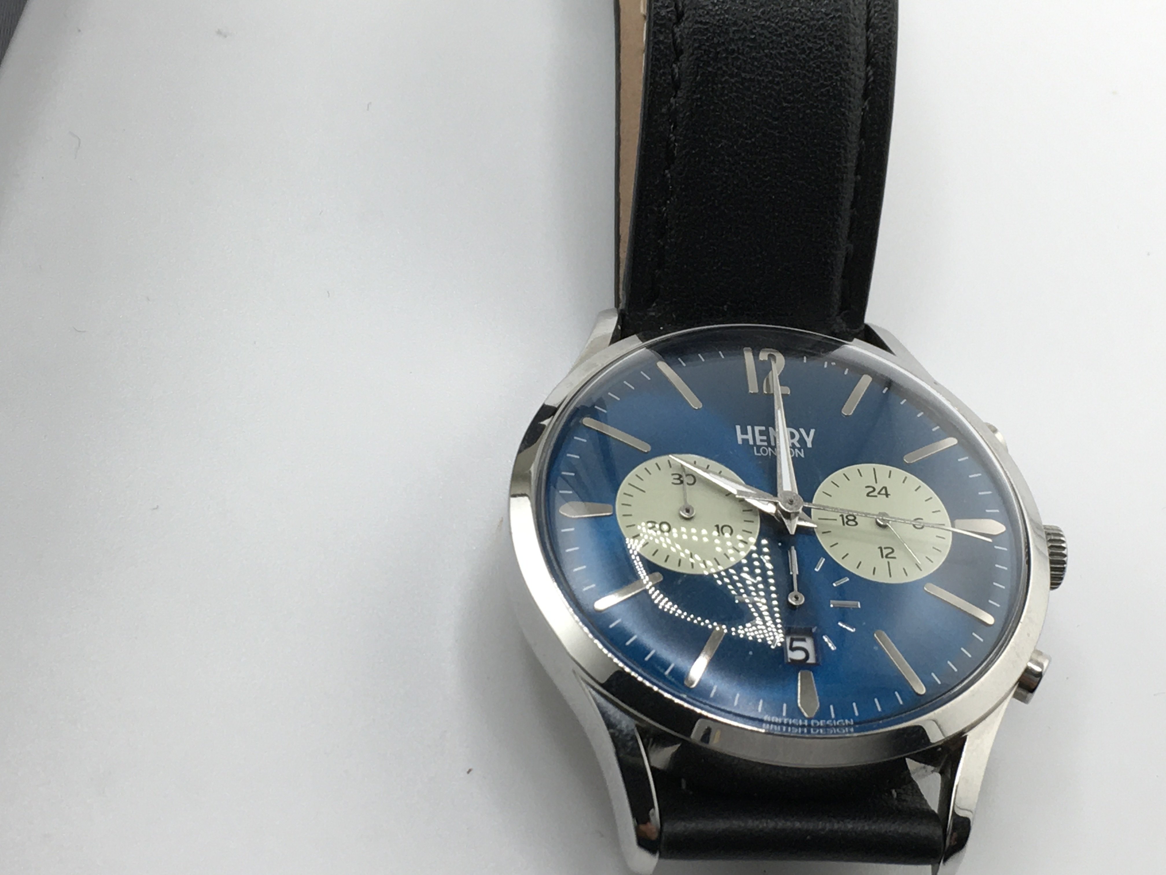 A Henry of london gents chronograph watch with box. Not seen running. Approximately 42mm including crown.