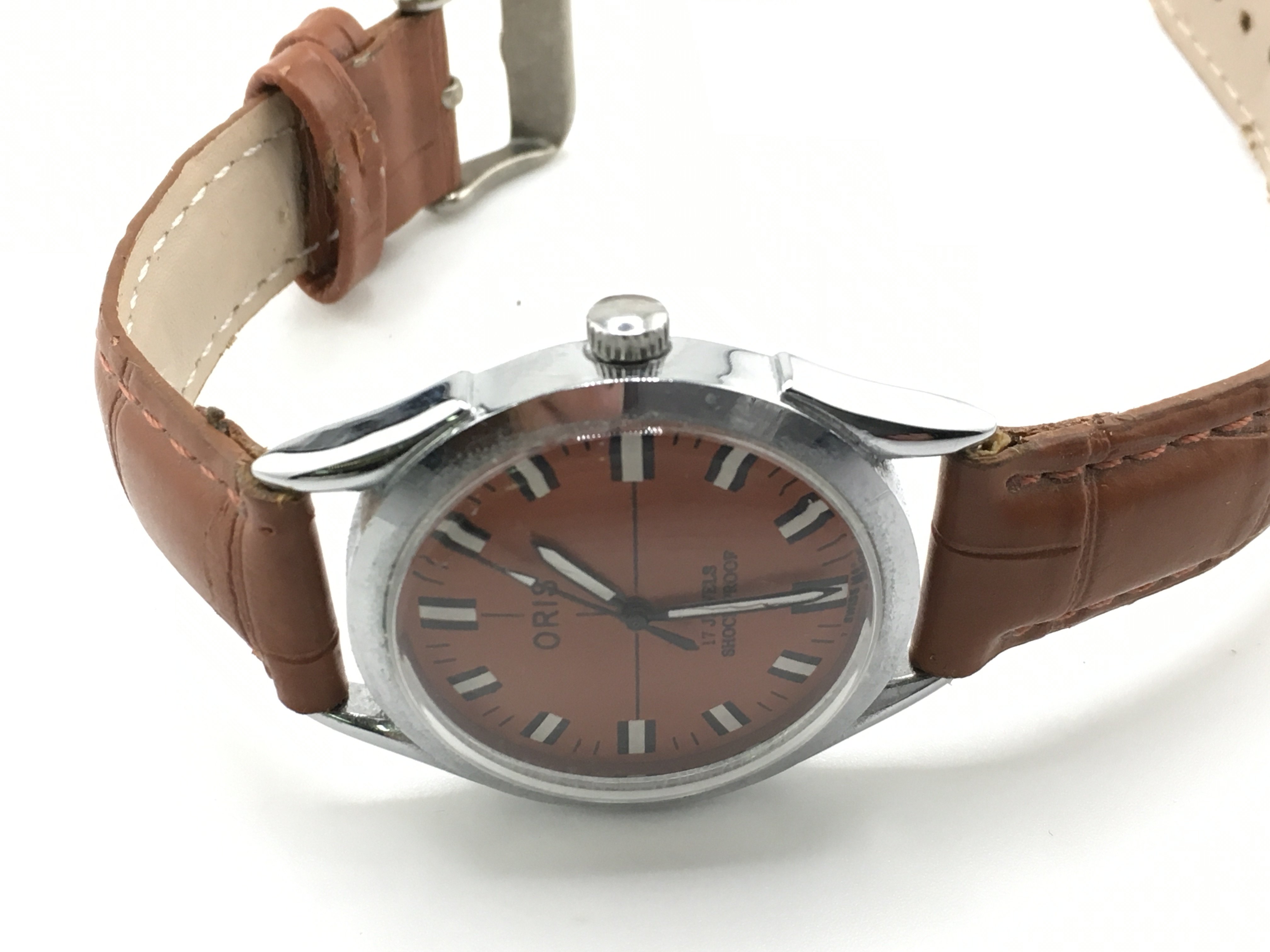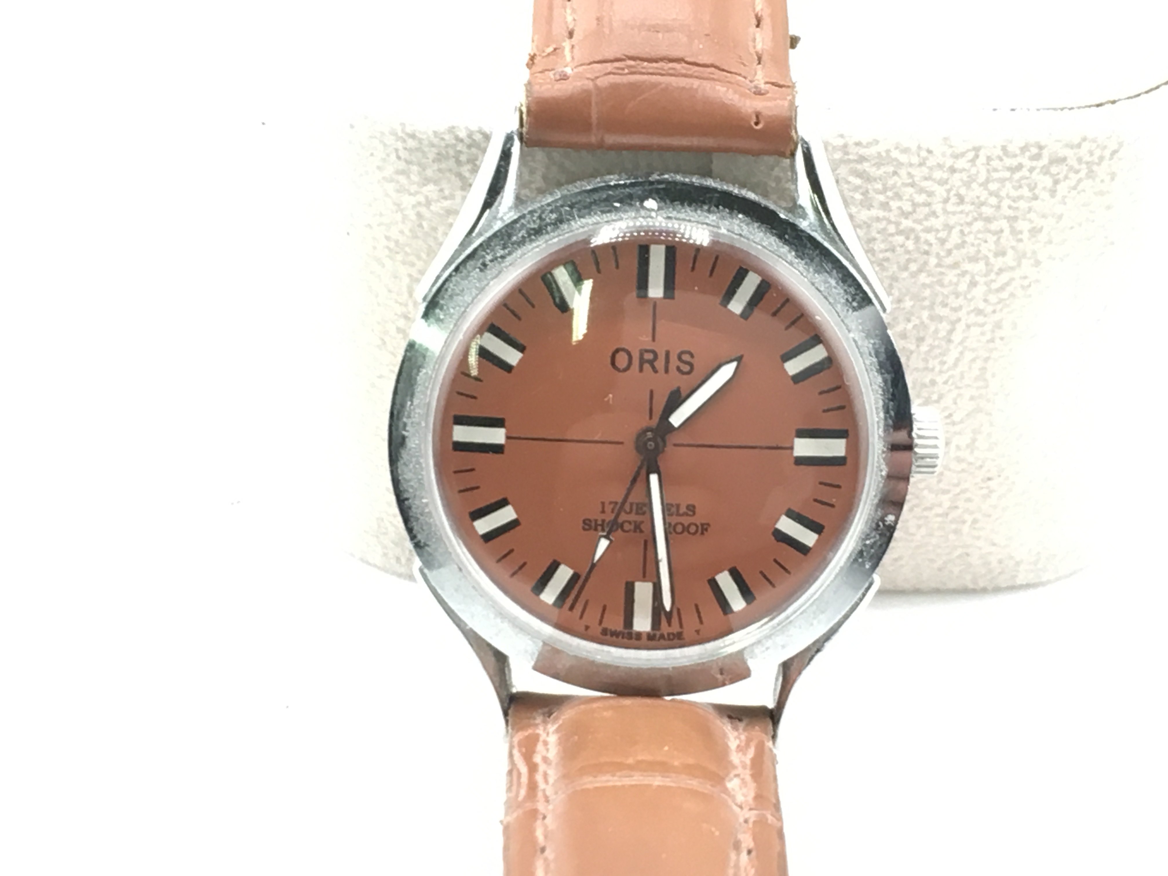 A gents Oris wrist watch. Red dial and 36mm case. Seen running. Postage B