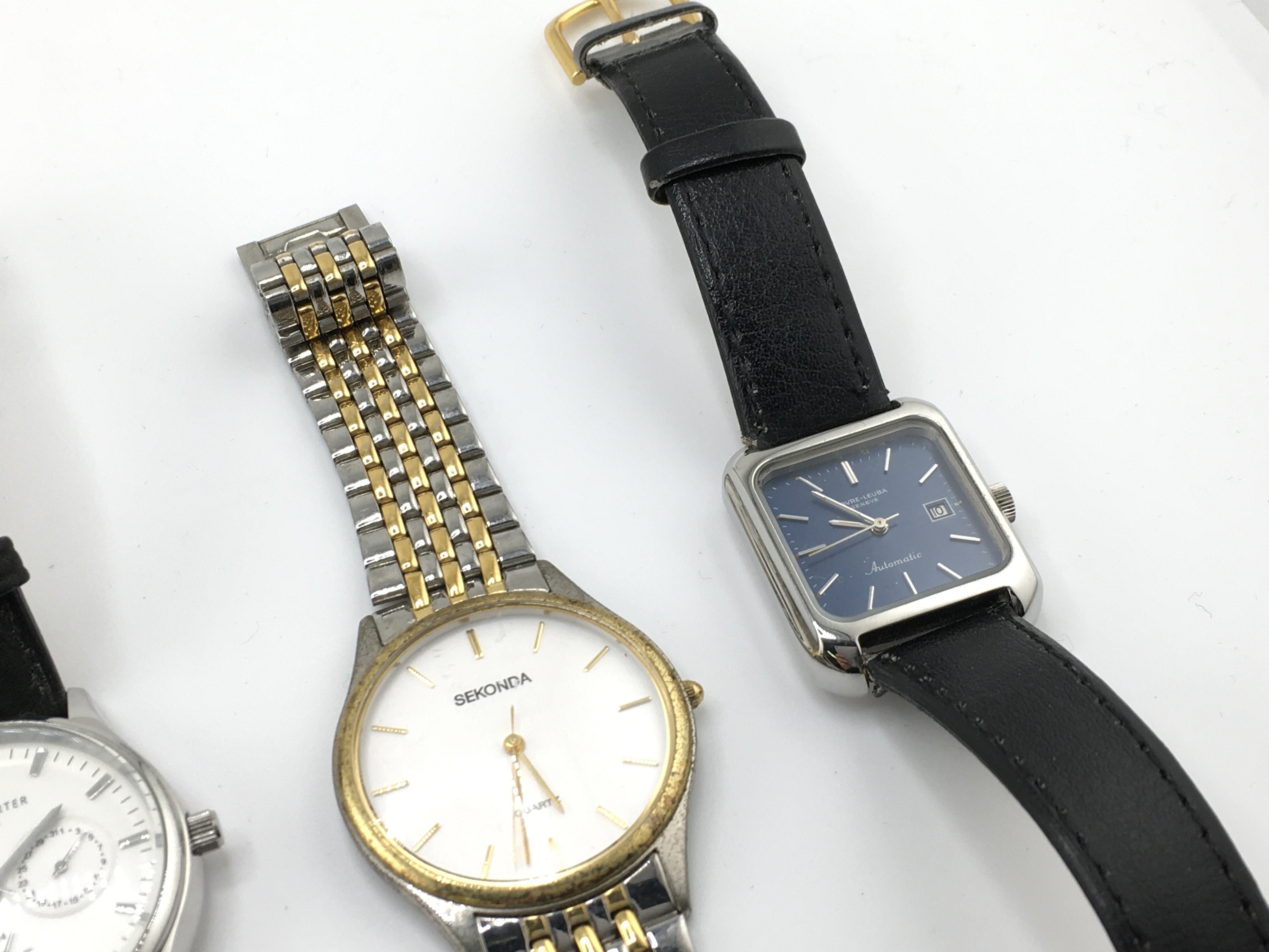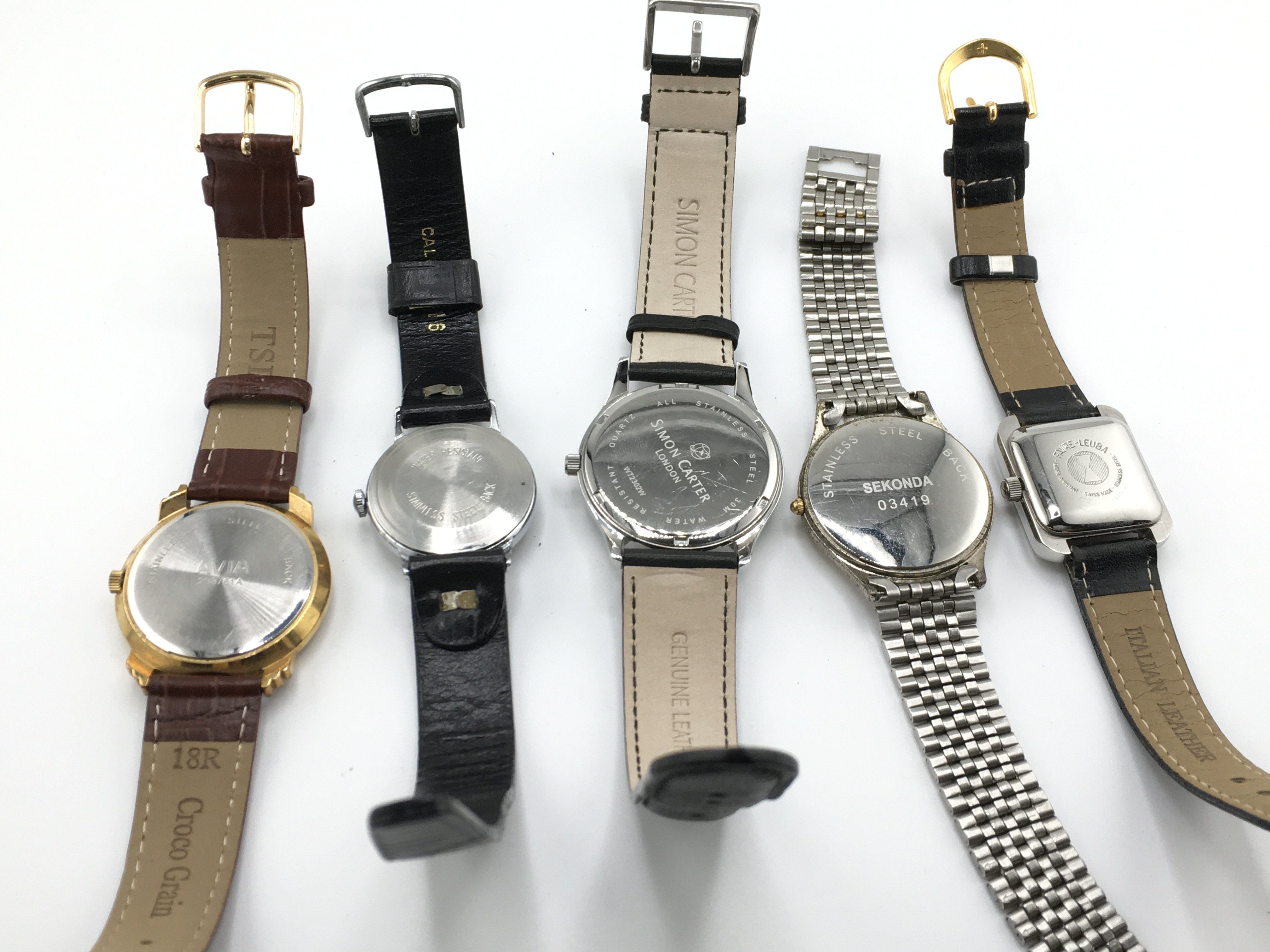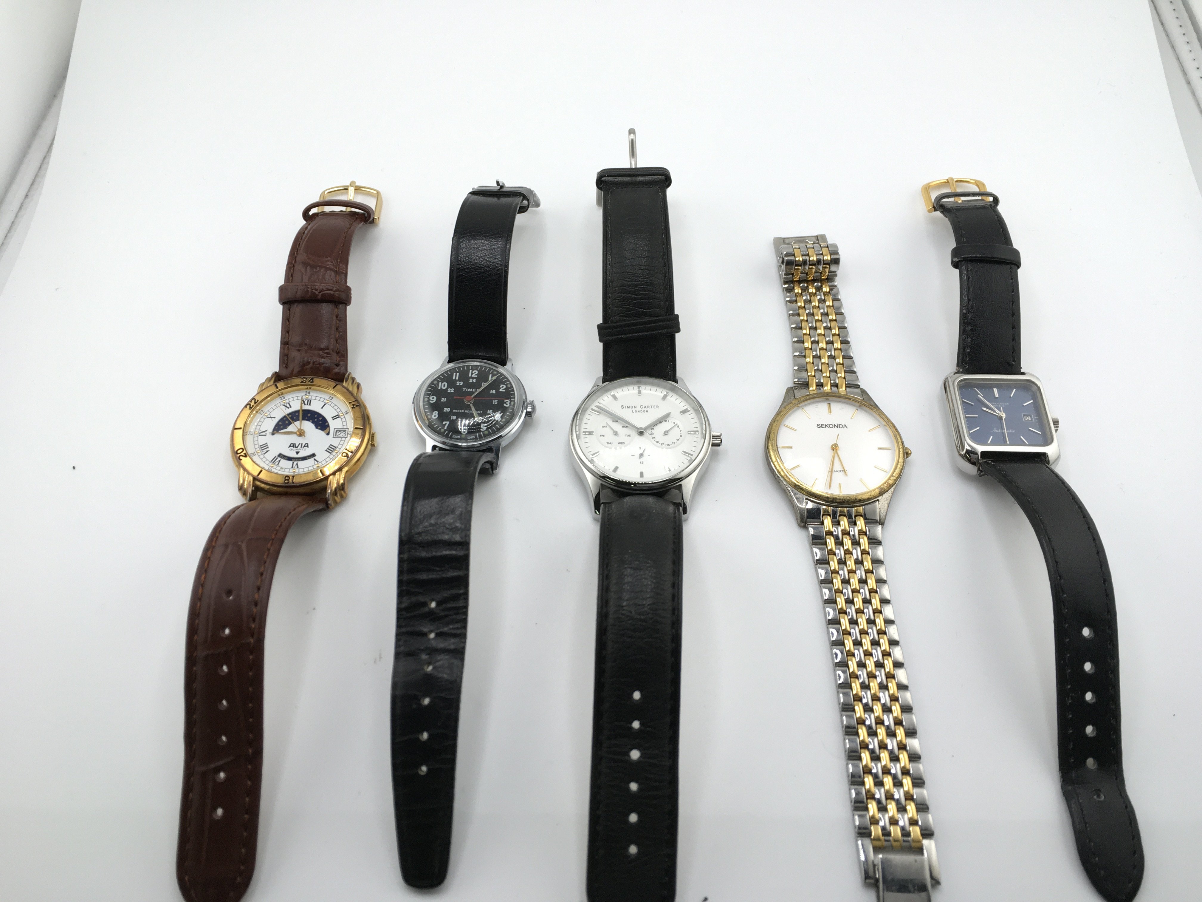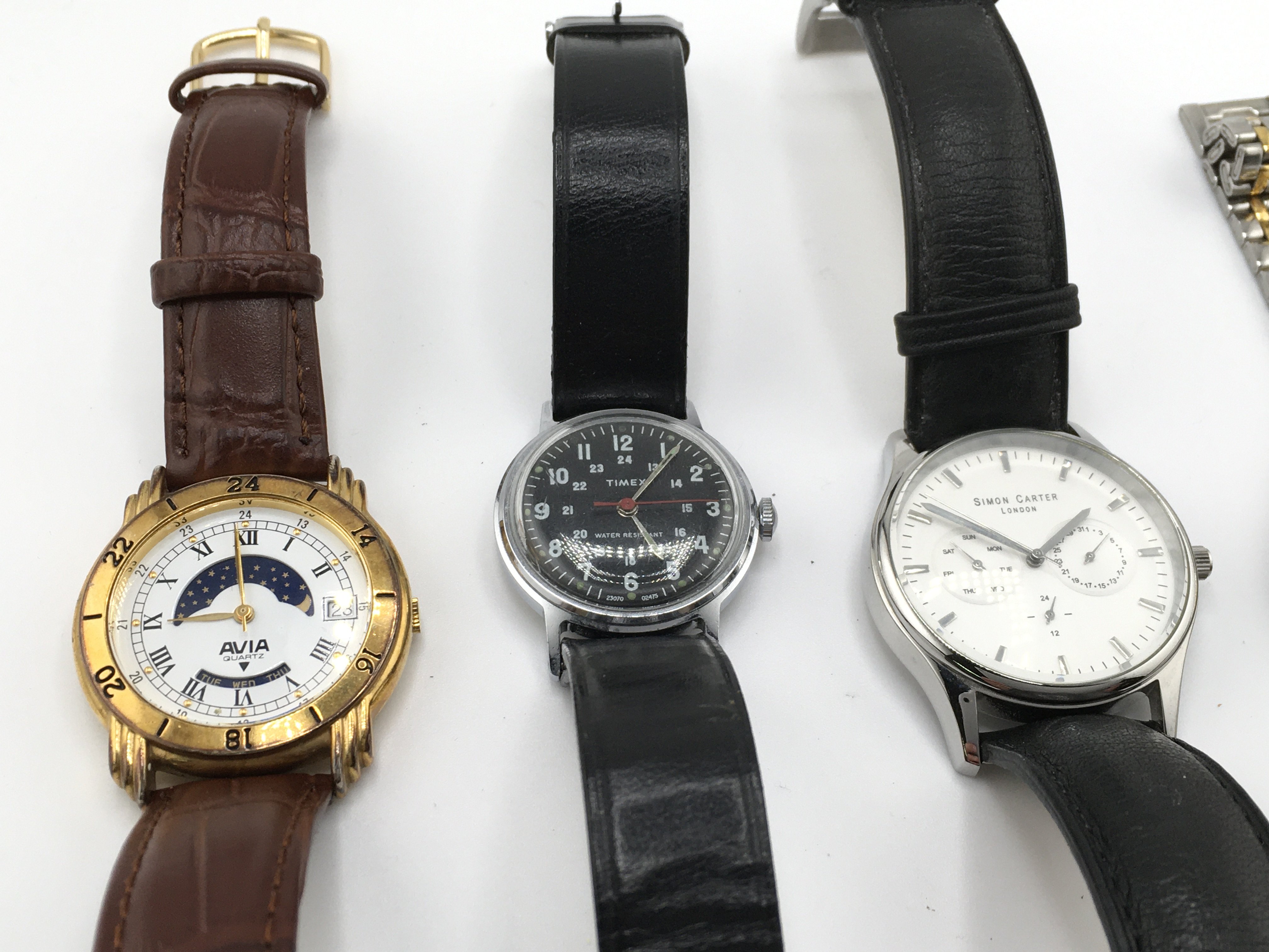 A collection of assorted dress watches including a military style timex and a modern style simon carter. Postage B