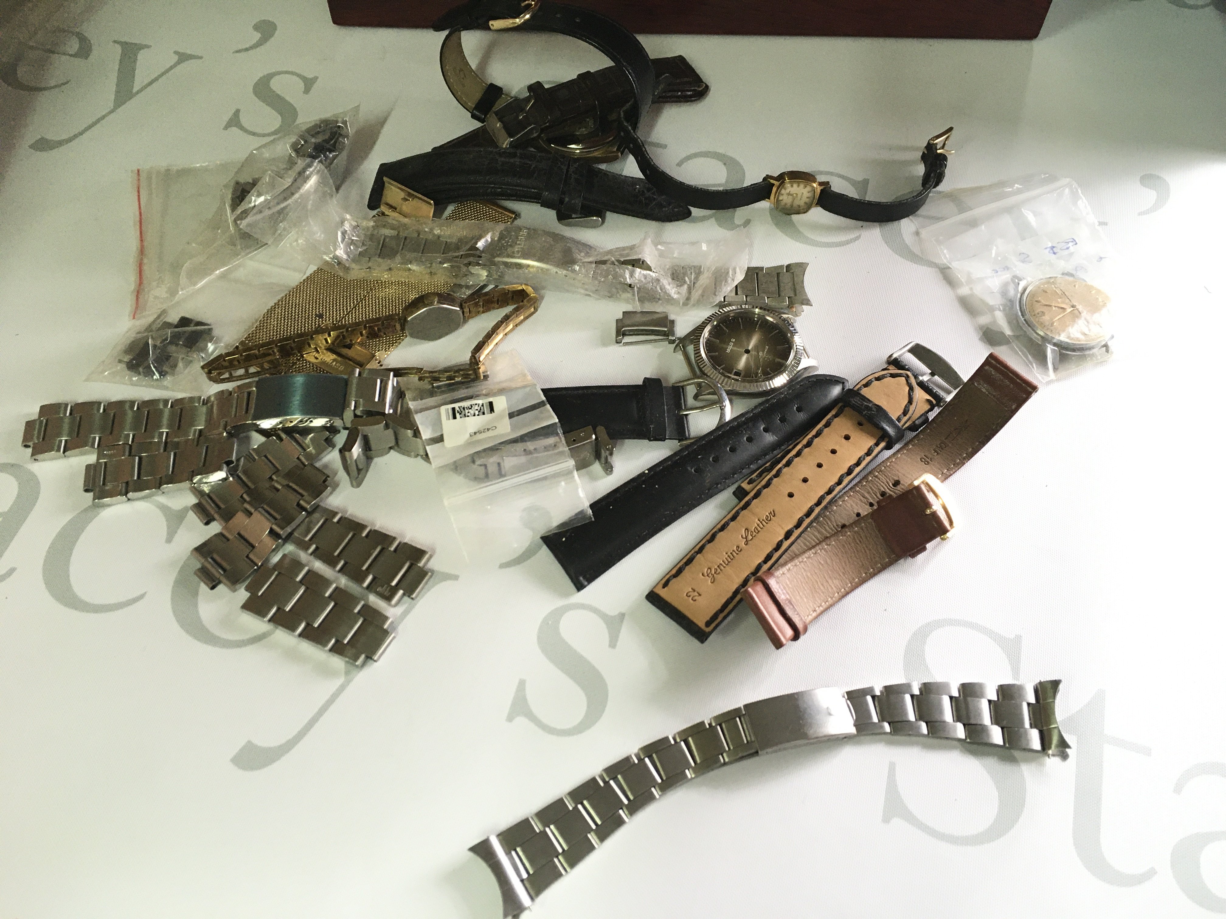 A collection of assorted watch straps and other spares including a watch box and possibly a vintage rolex watch strap