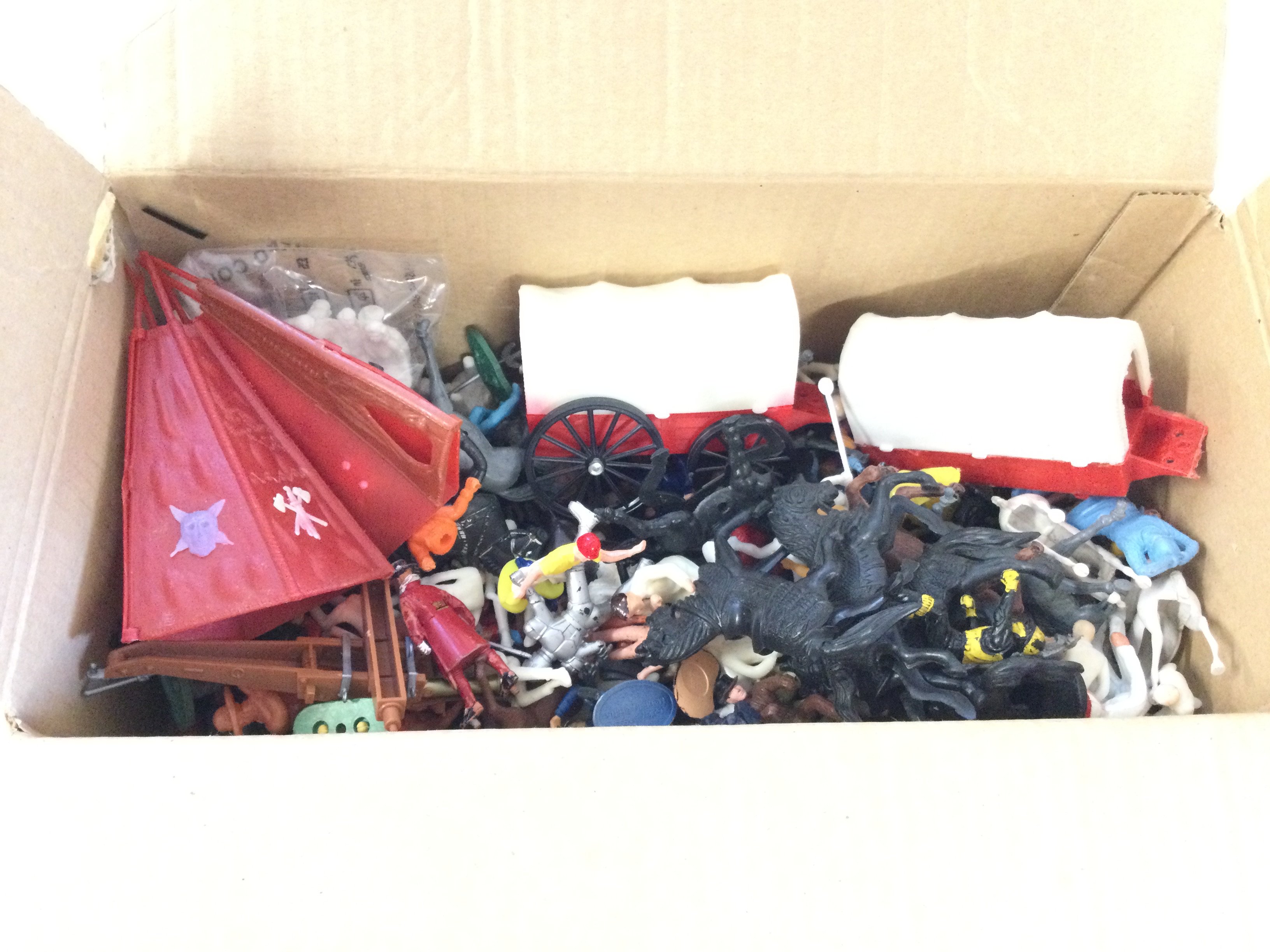 A box containing a quantity plastic figures to include soldier̢s. Horses. Wagons etc.