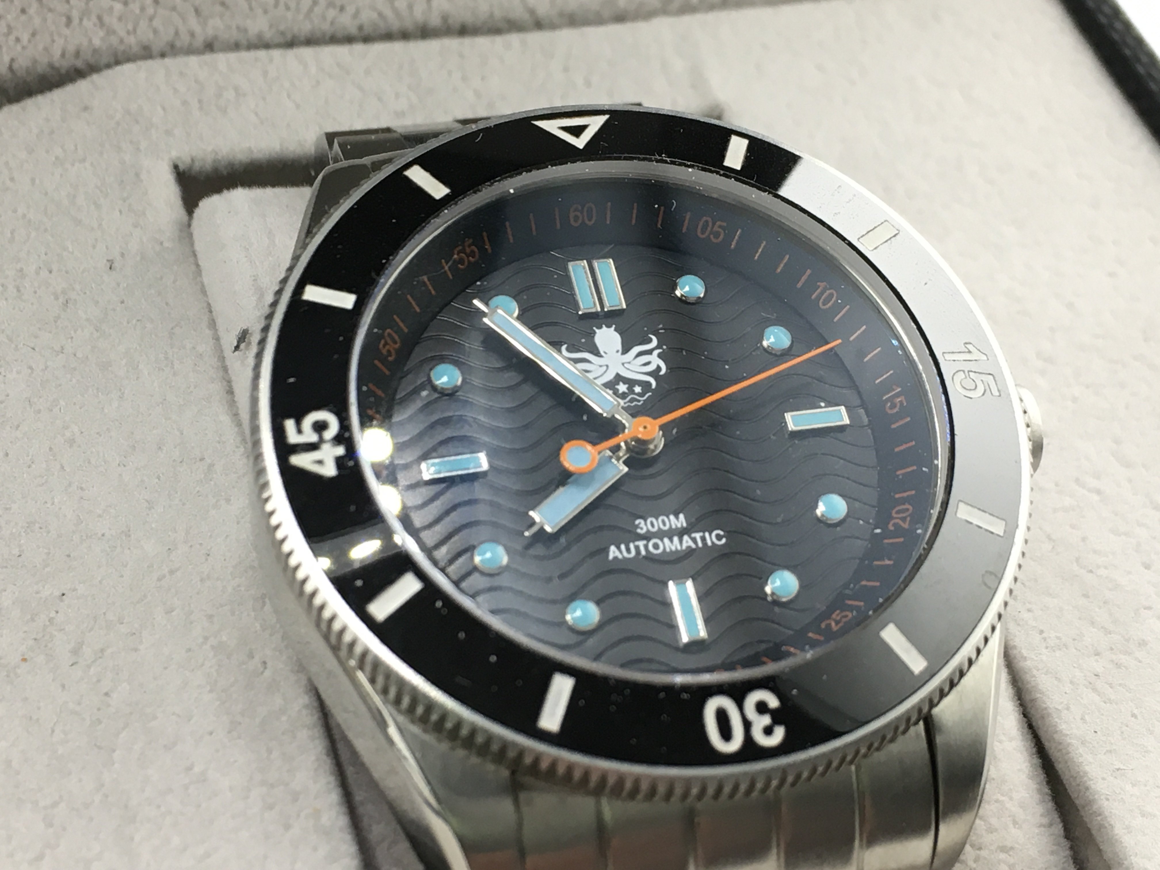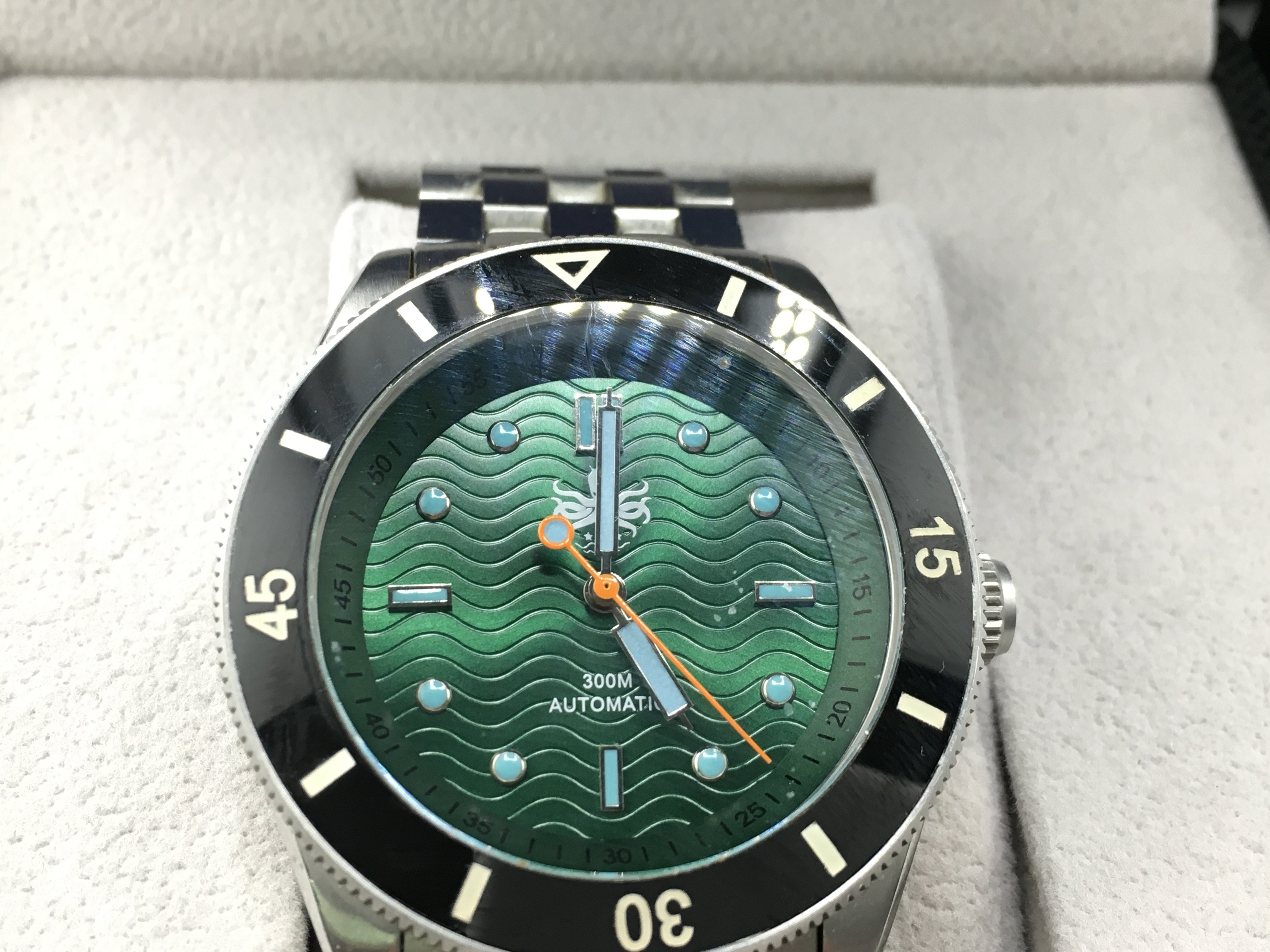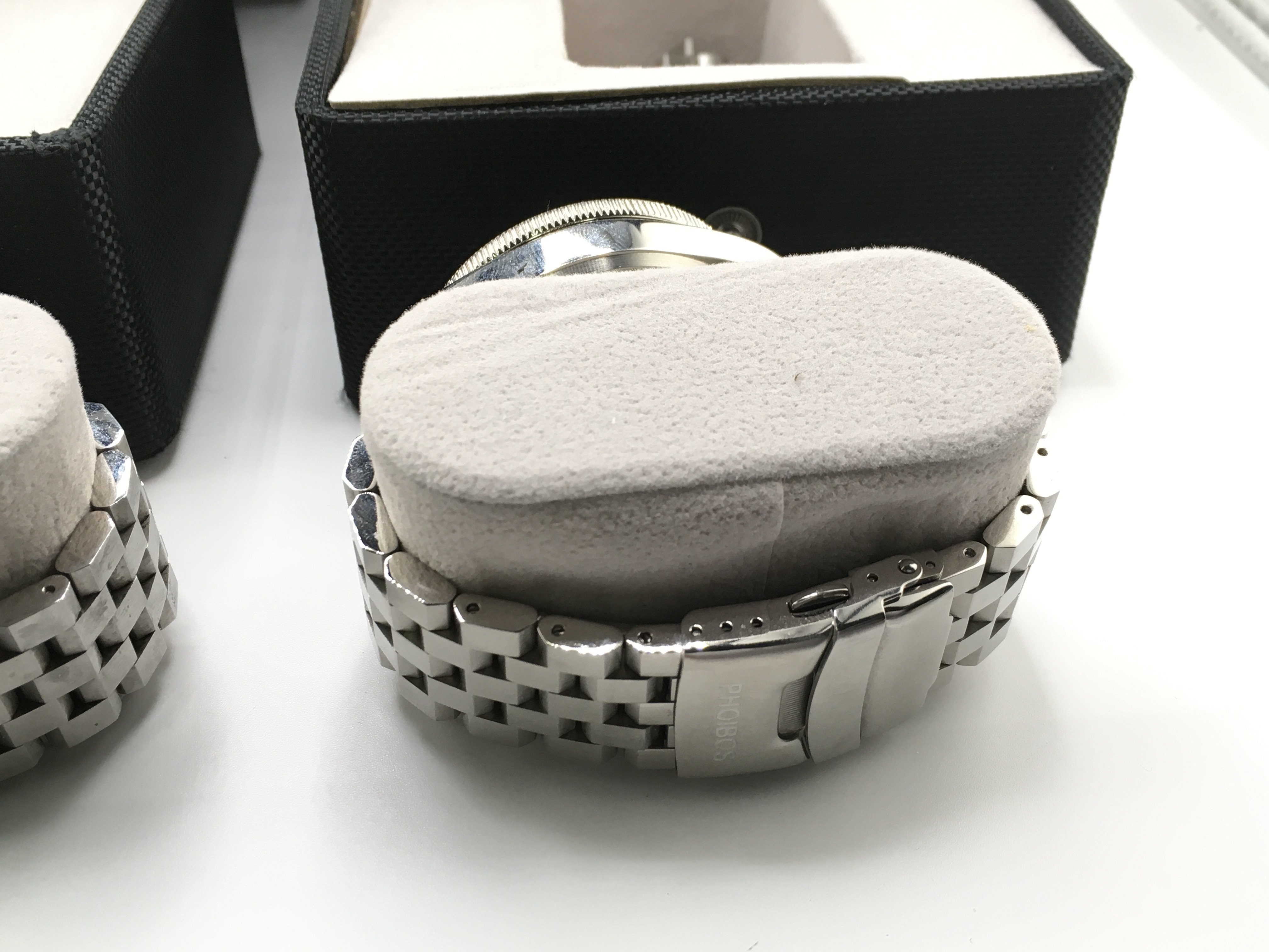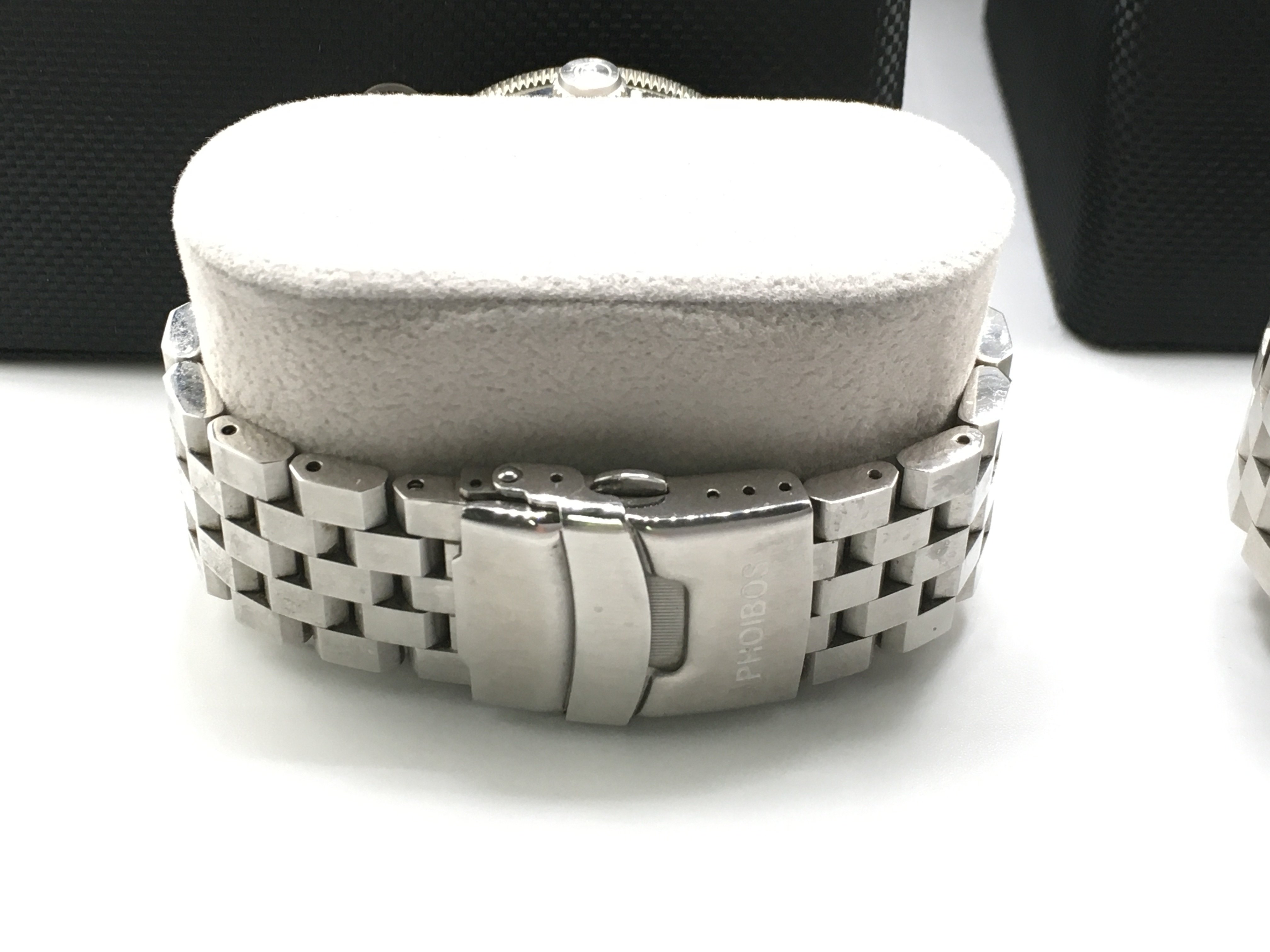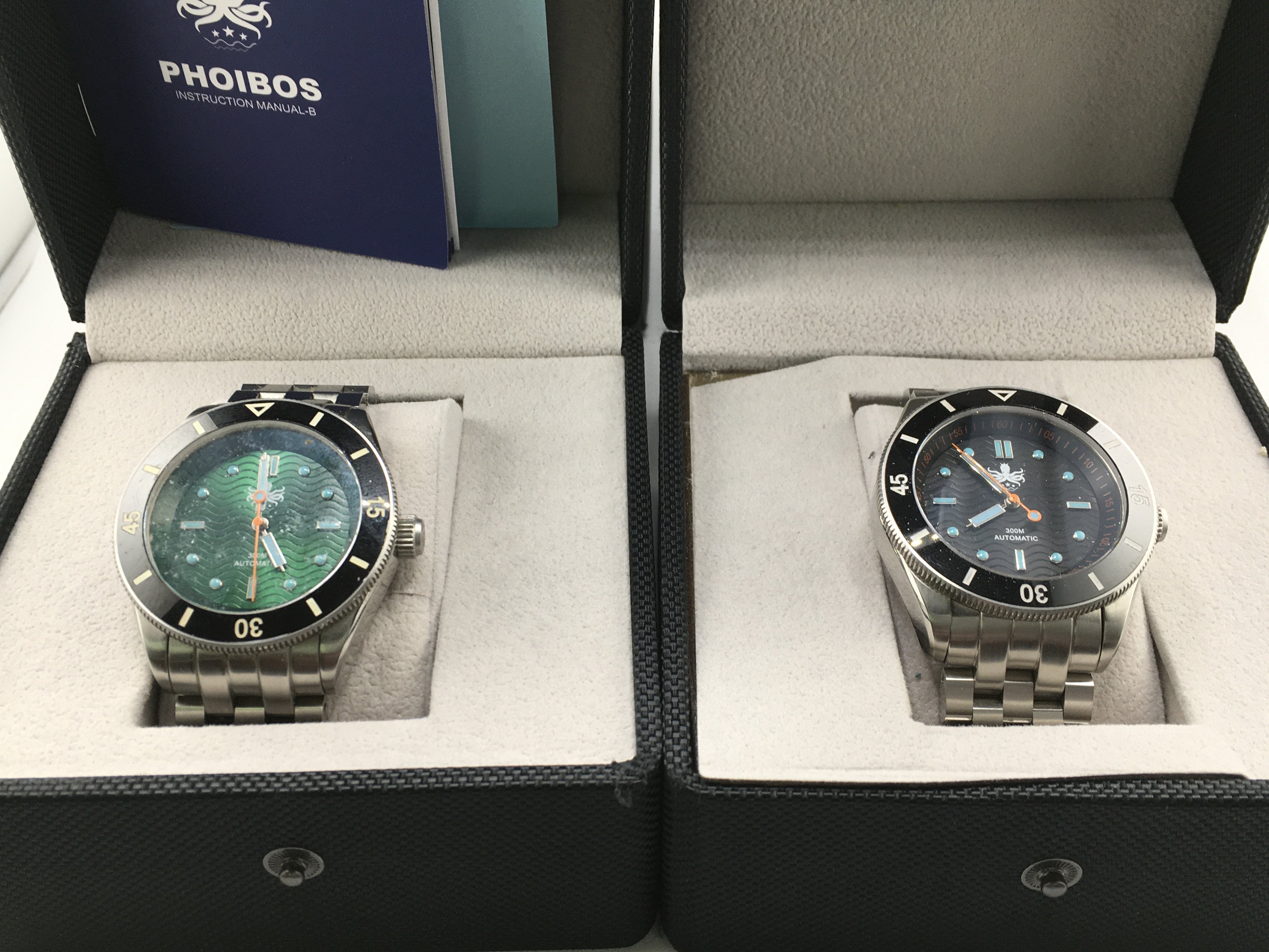 Two Phoibos gents watches. One with green dial and other with black dial. With boxes and both running. Postage B