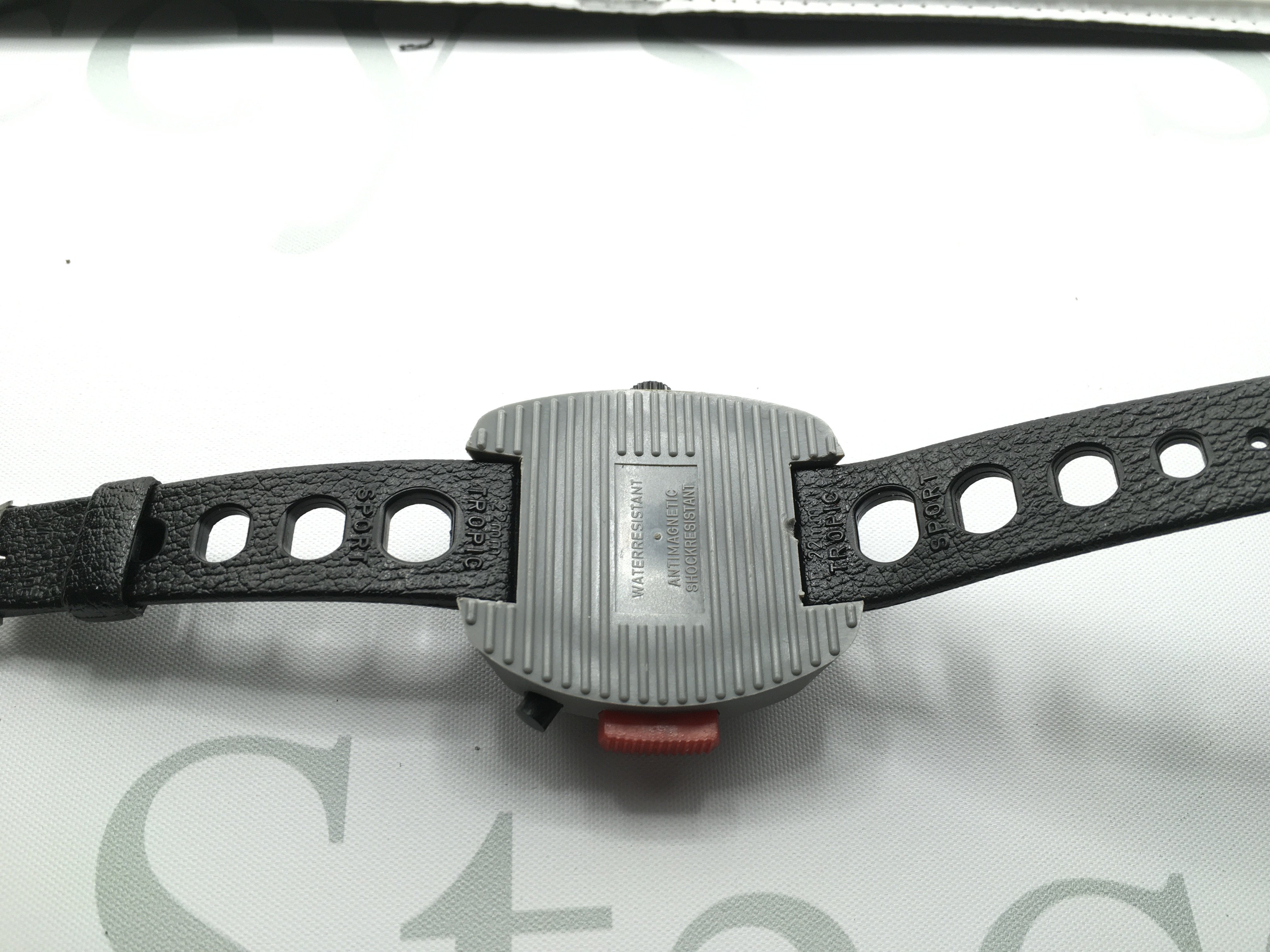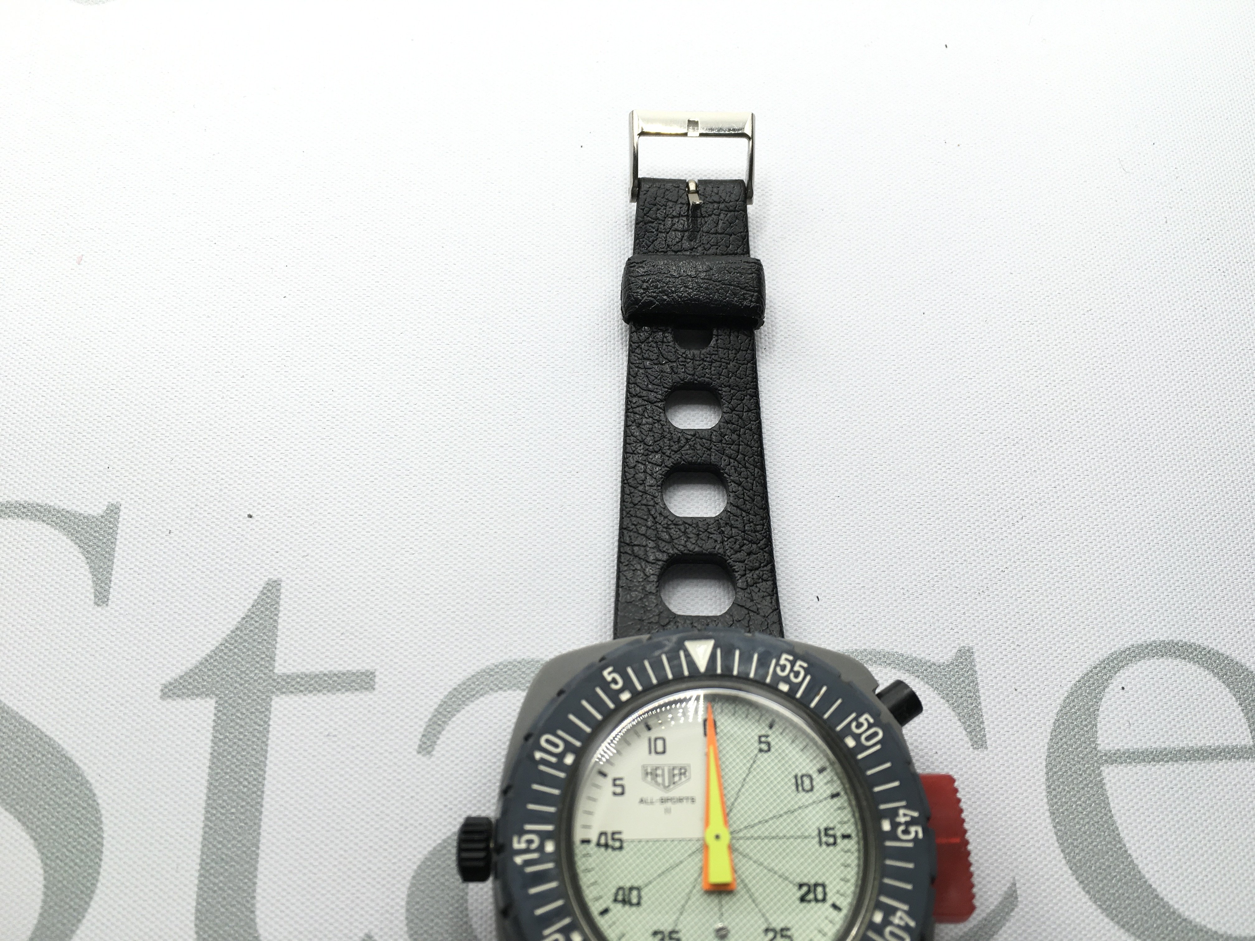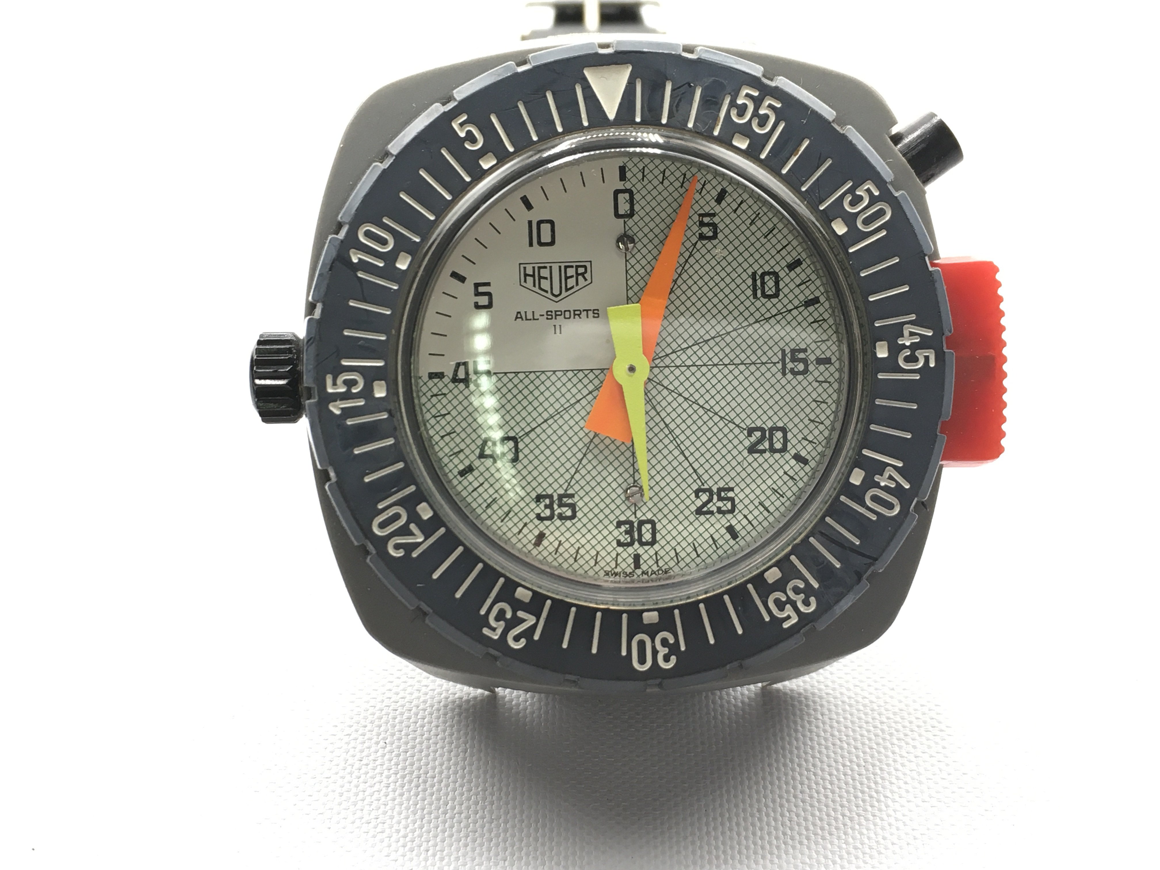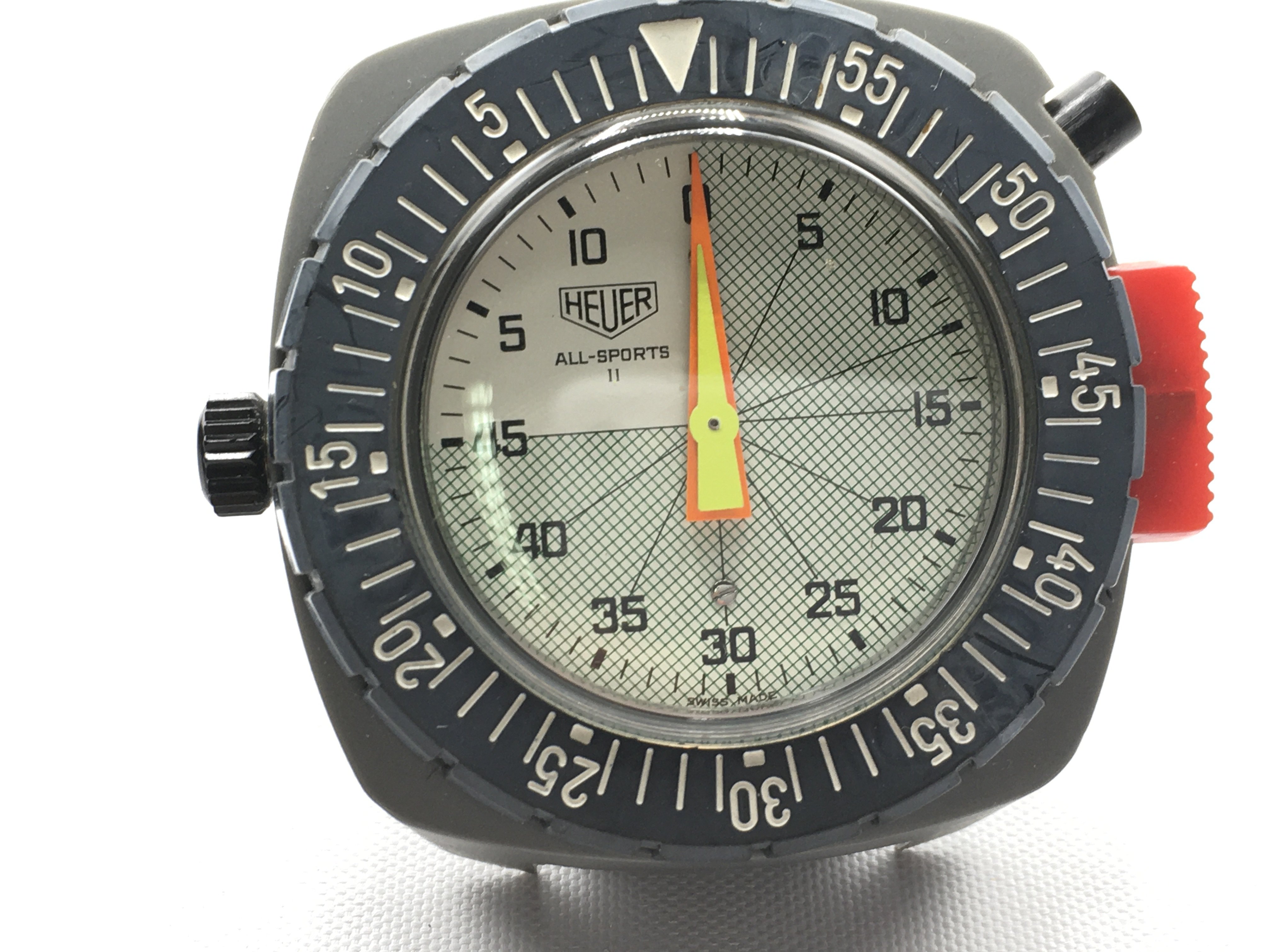 Heuer wrist timer all sports II model. 48mm case. In good condition with original Tropic strap. Seen running. Postage B