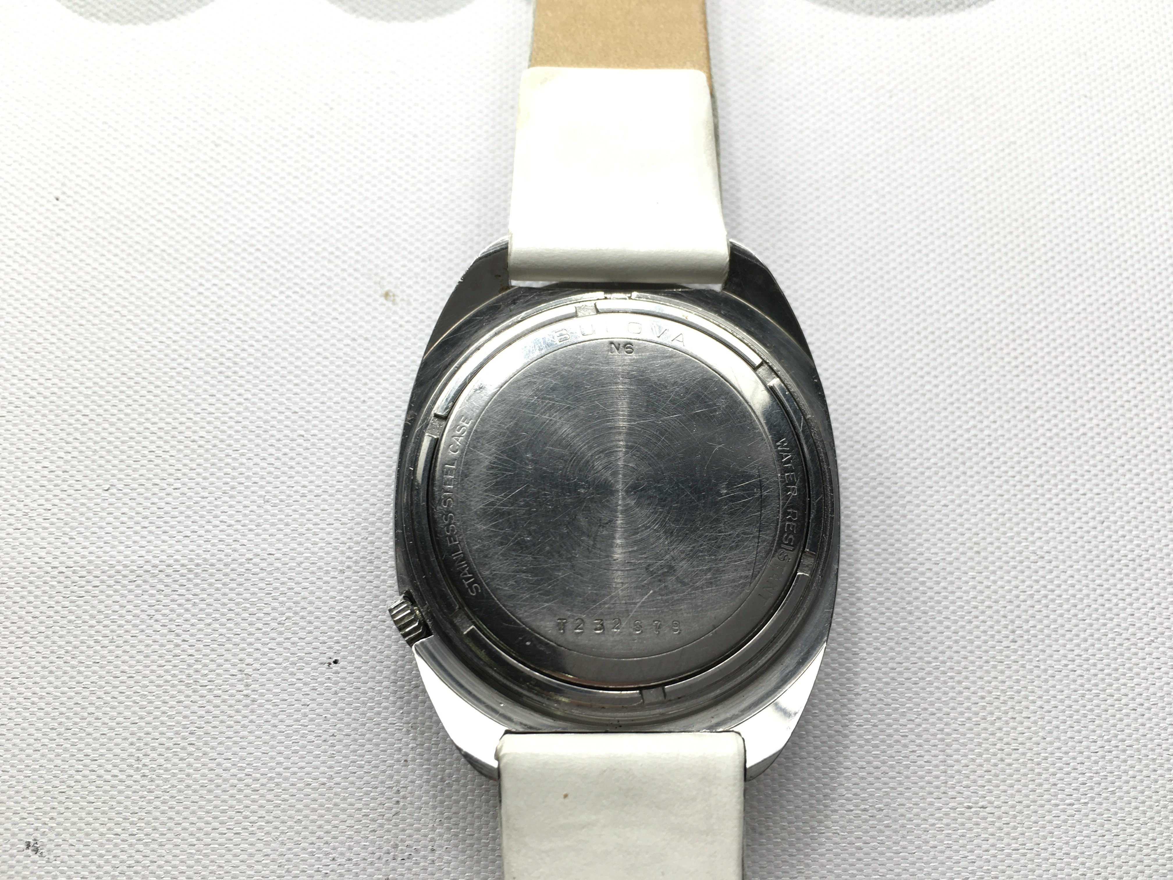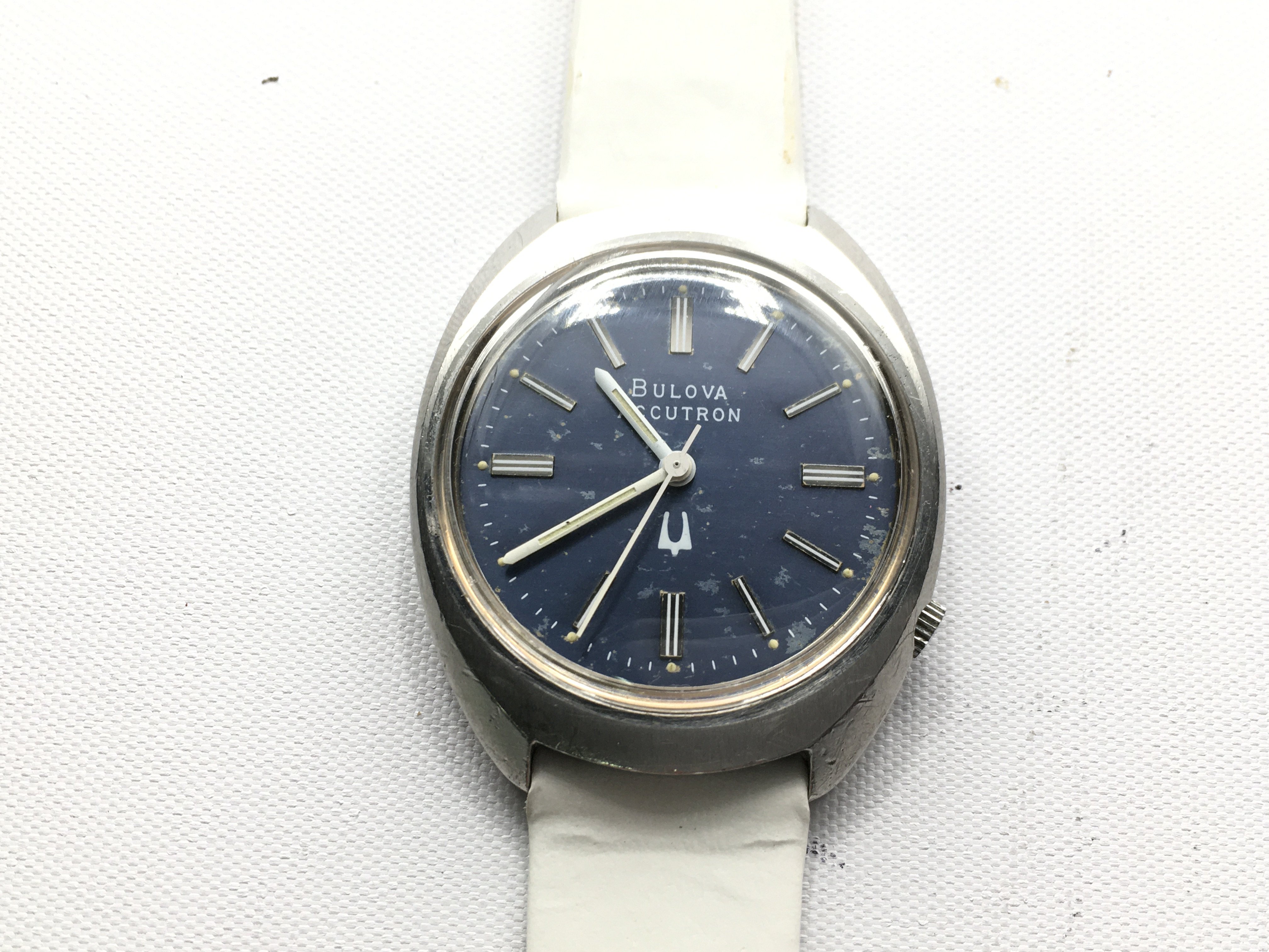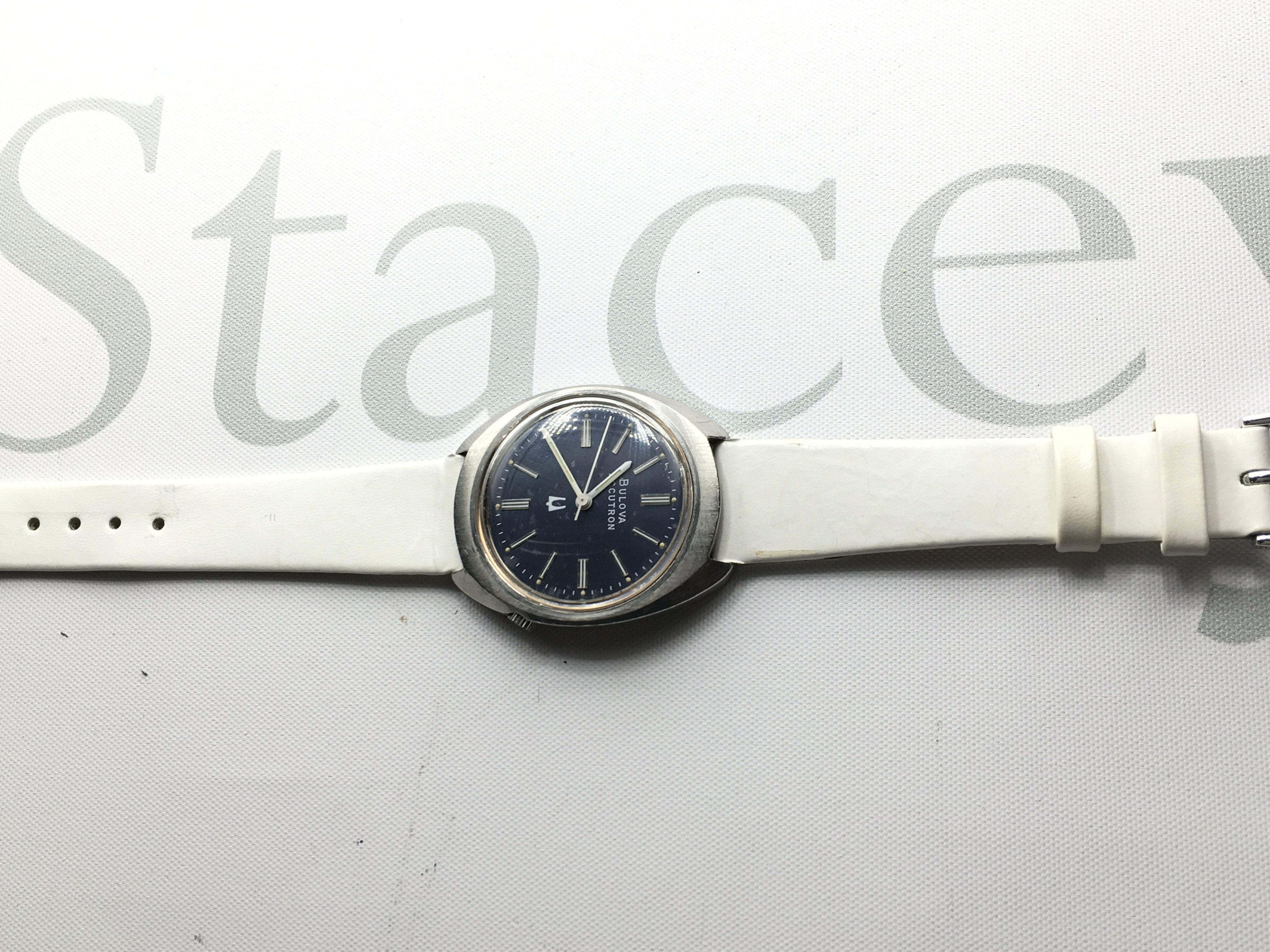A Bulova Accutron blue dial wrist watch with white leather strap. Seen running Postage b
