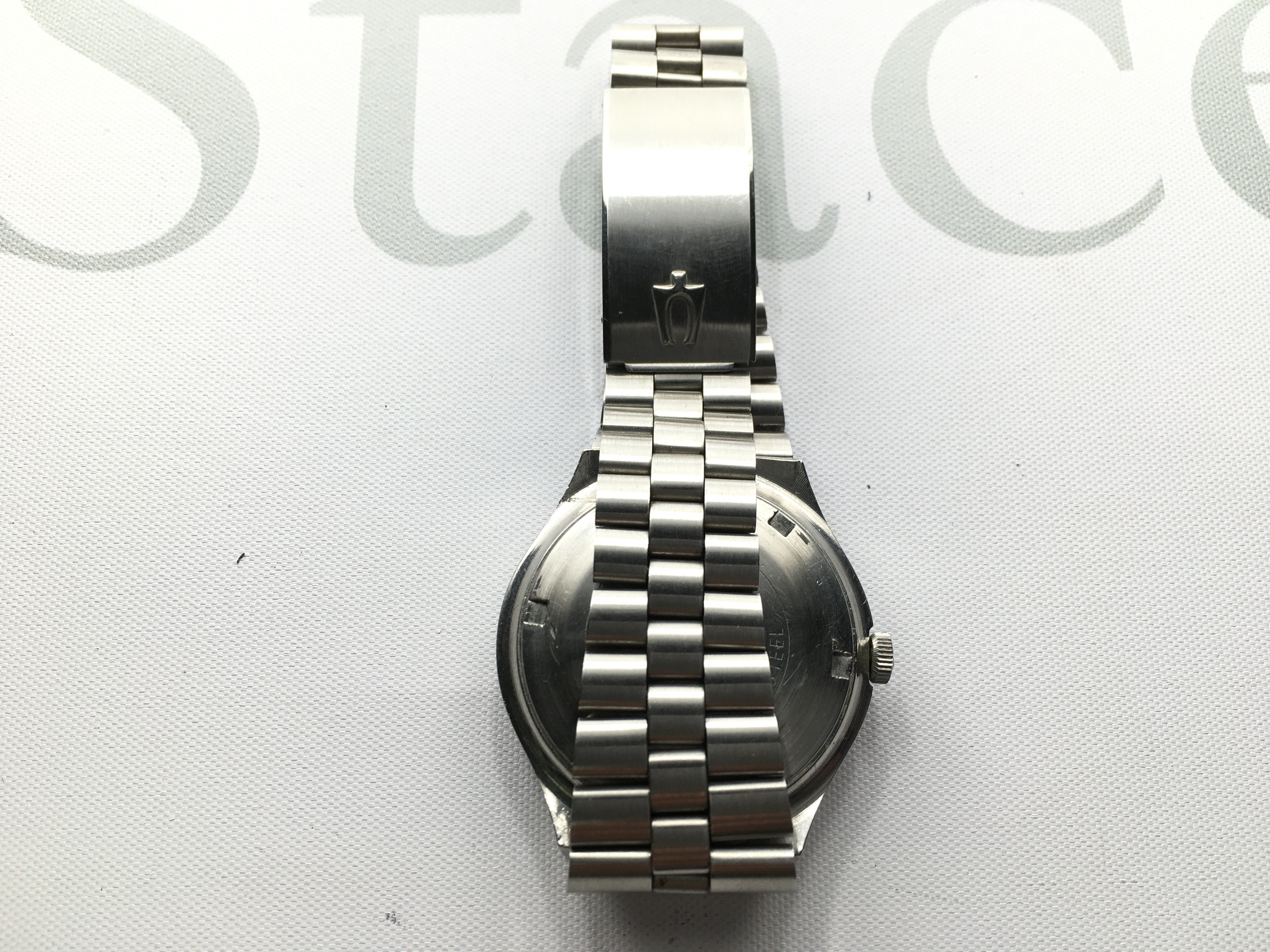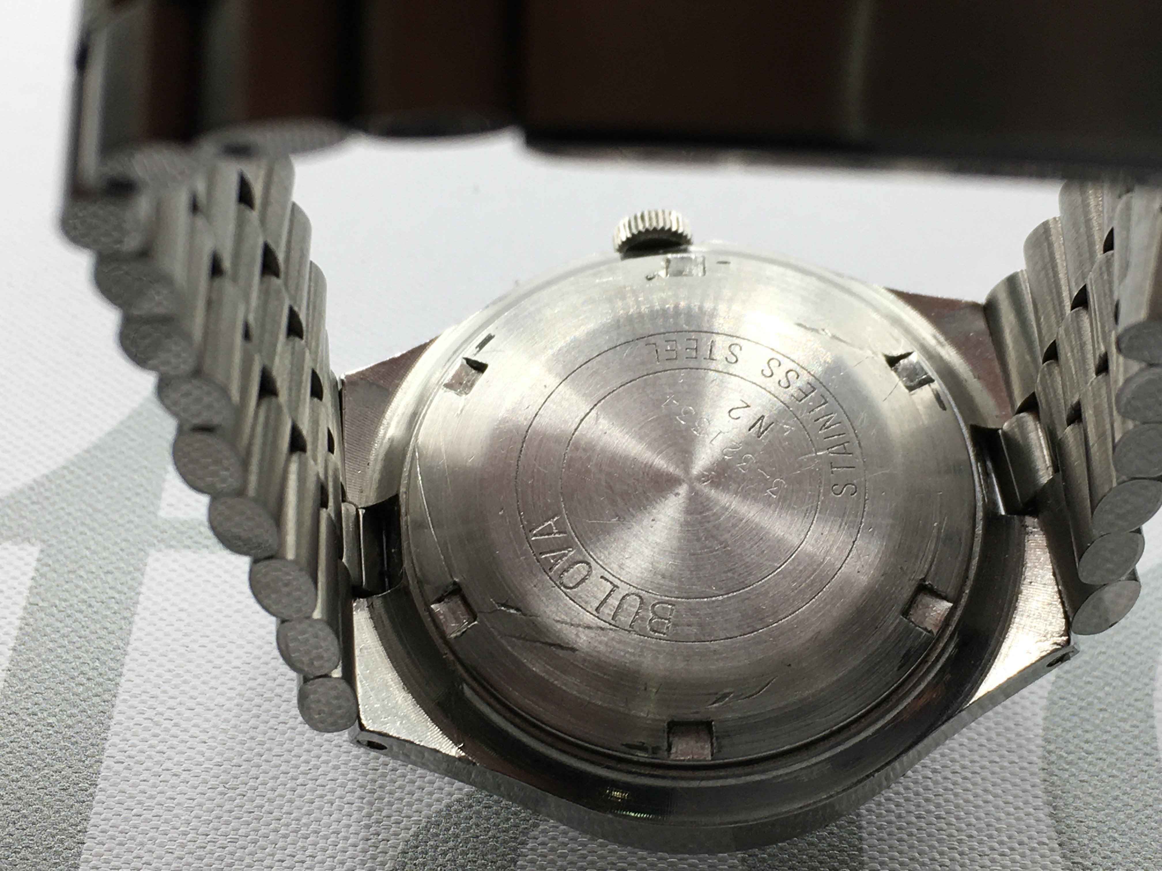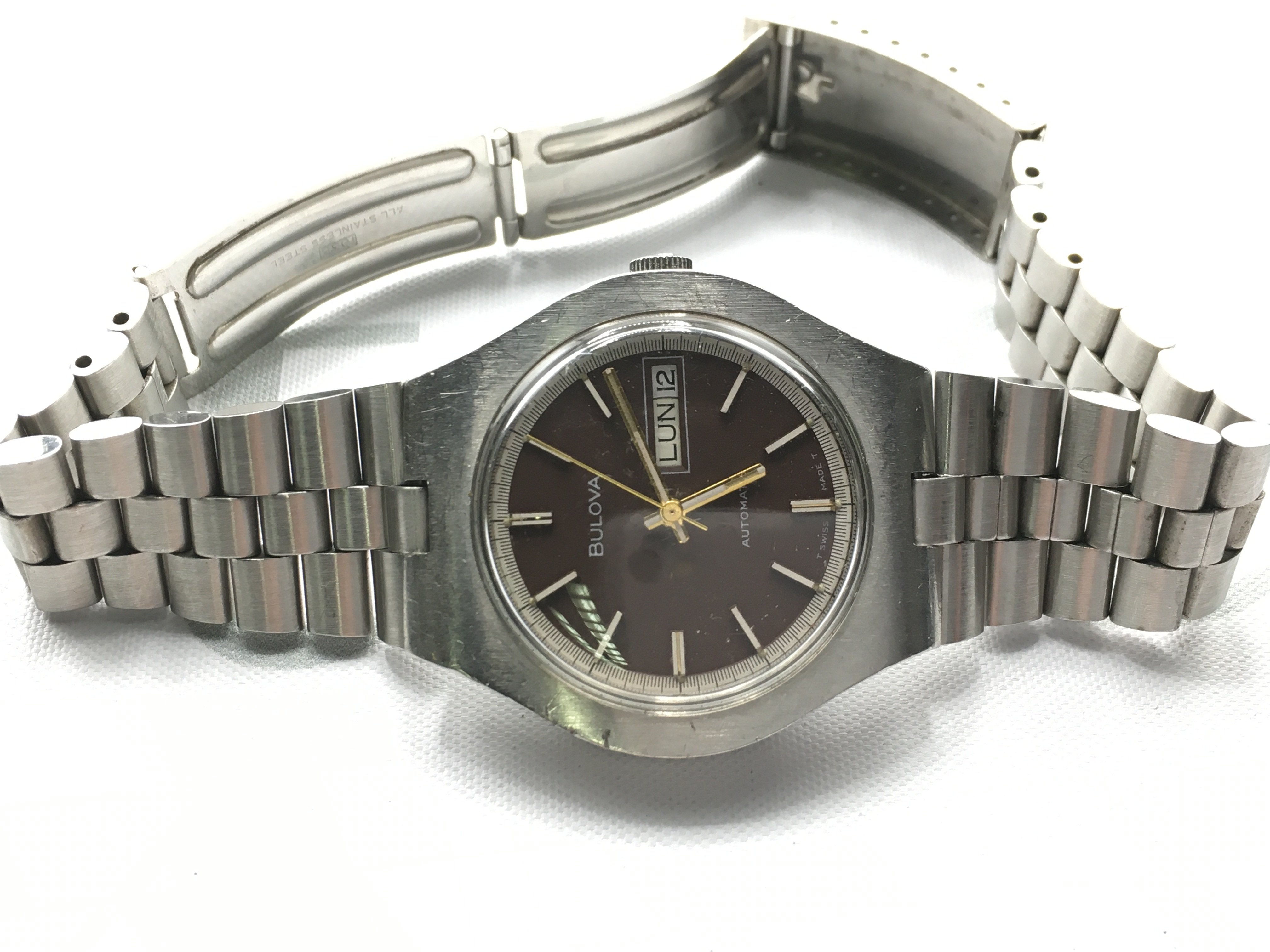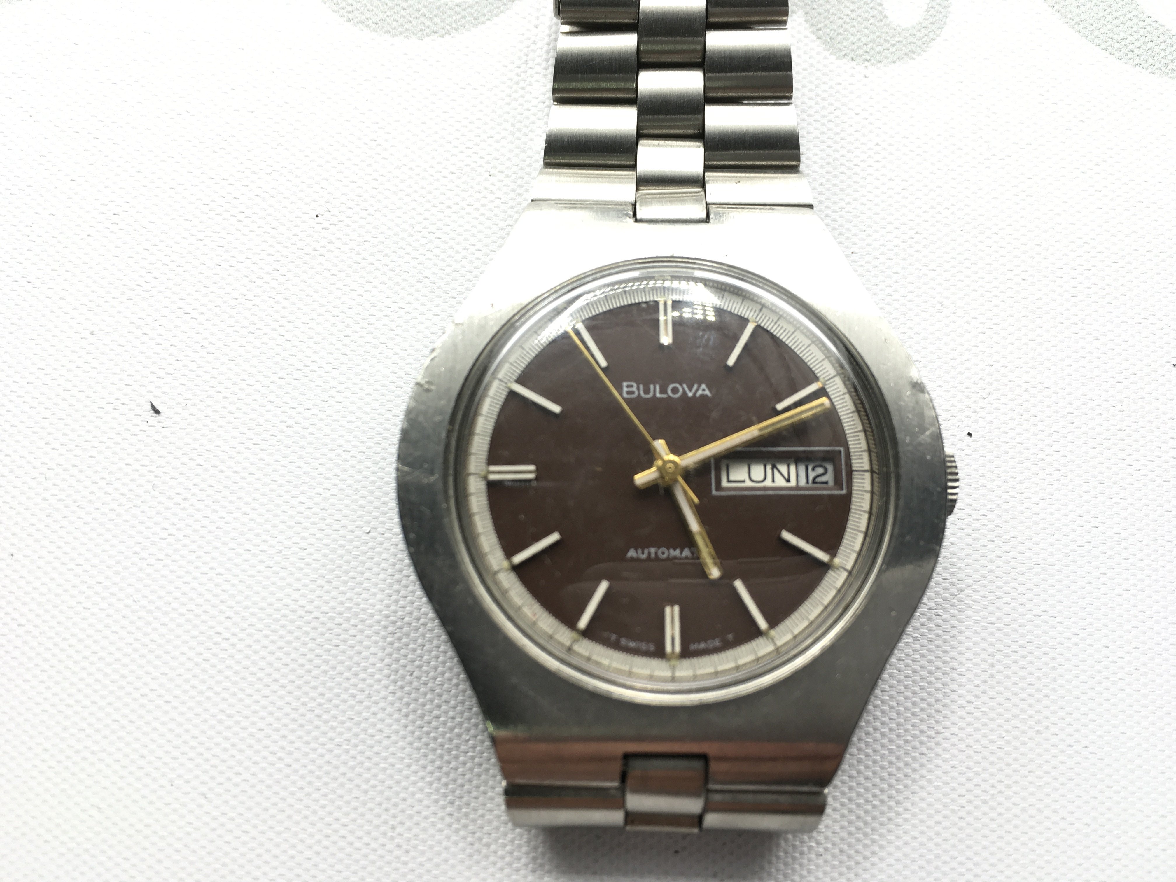 A Bulova Automatic day date wrist watch with stainless steel strap. Seen running.