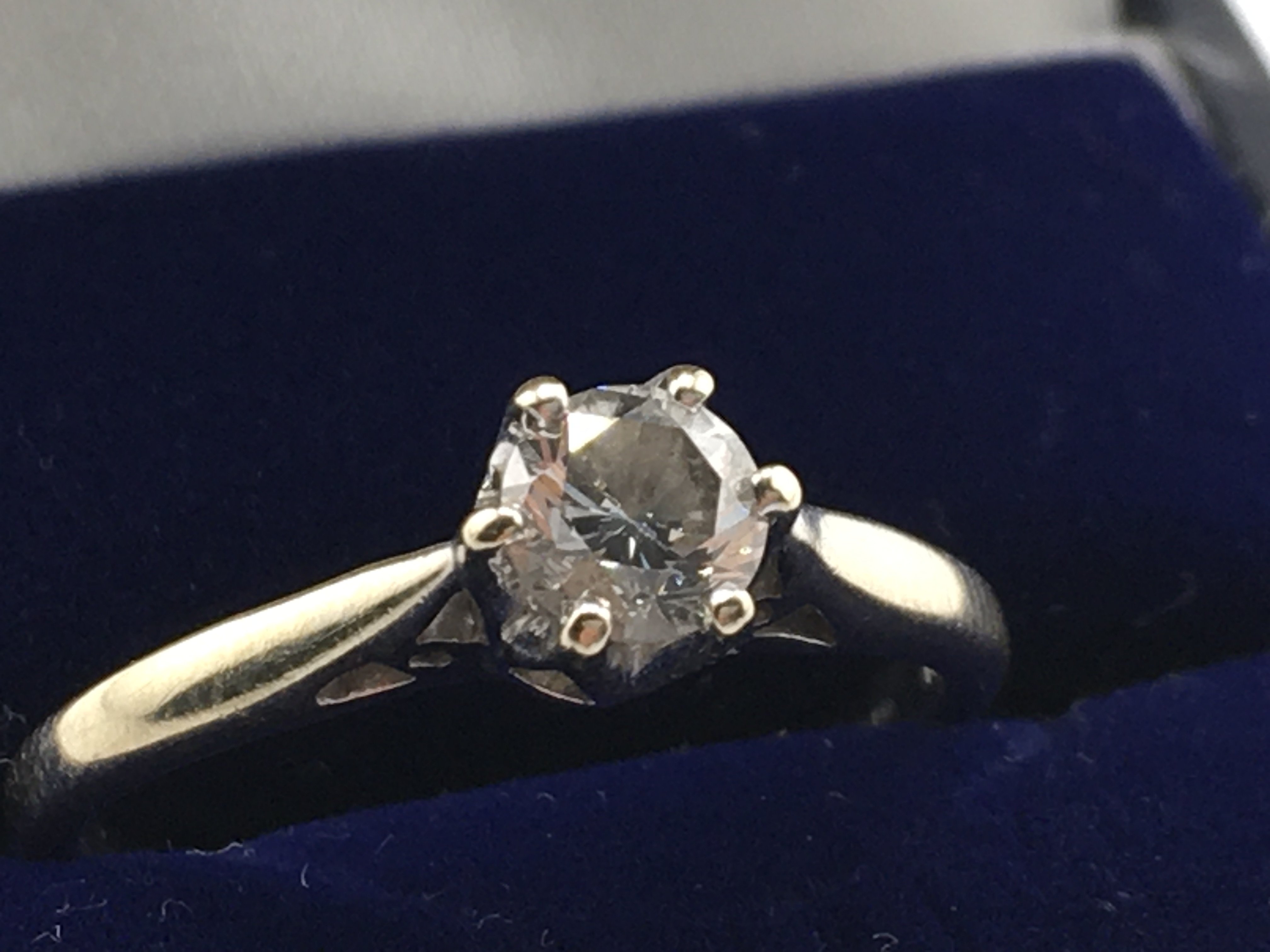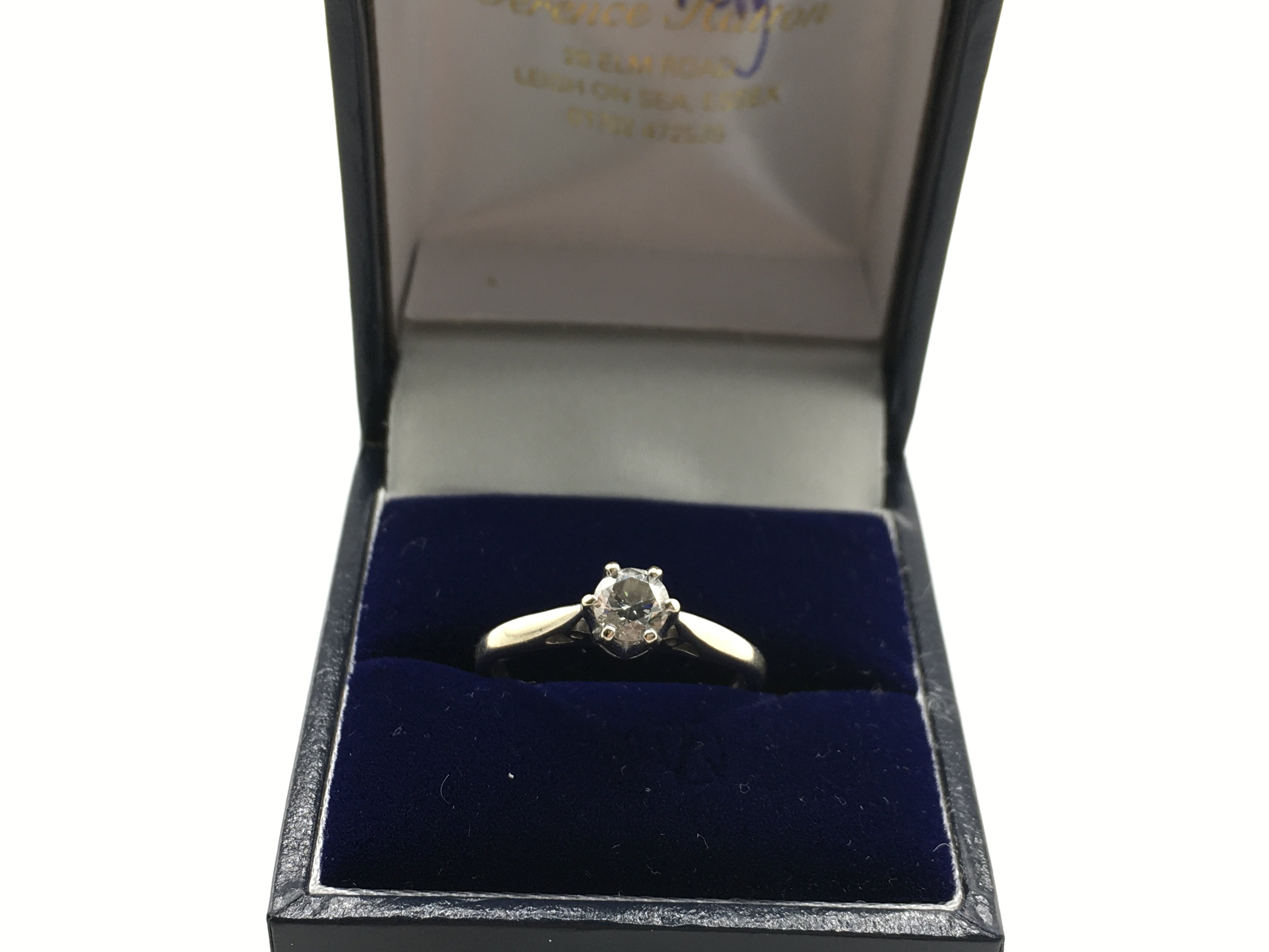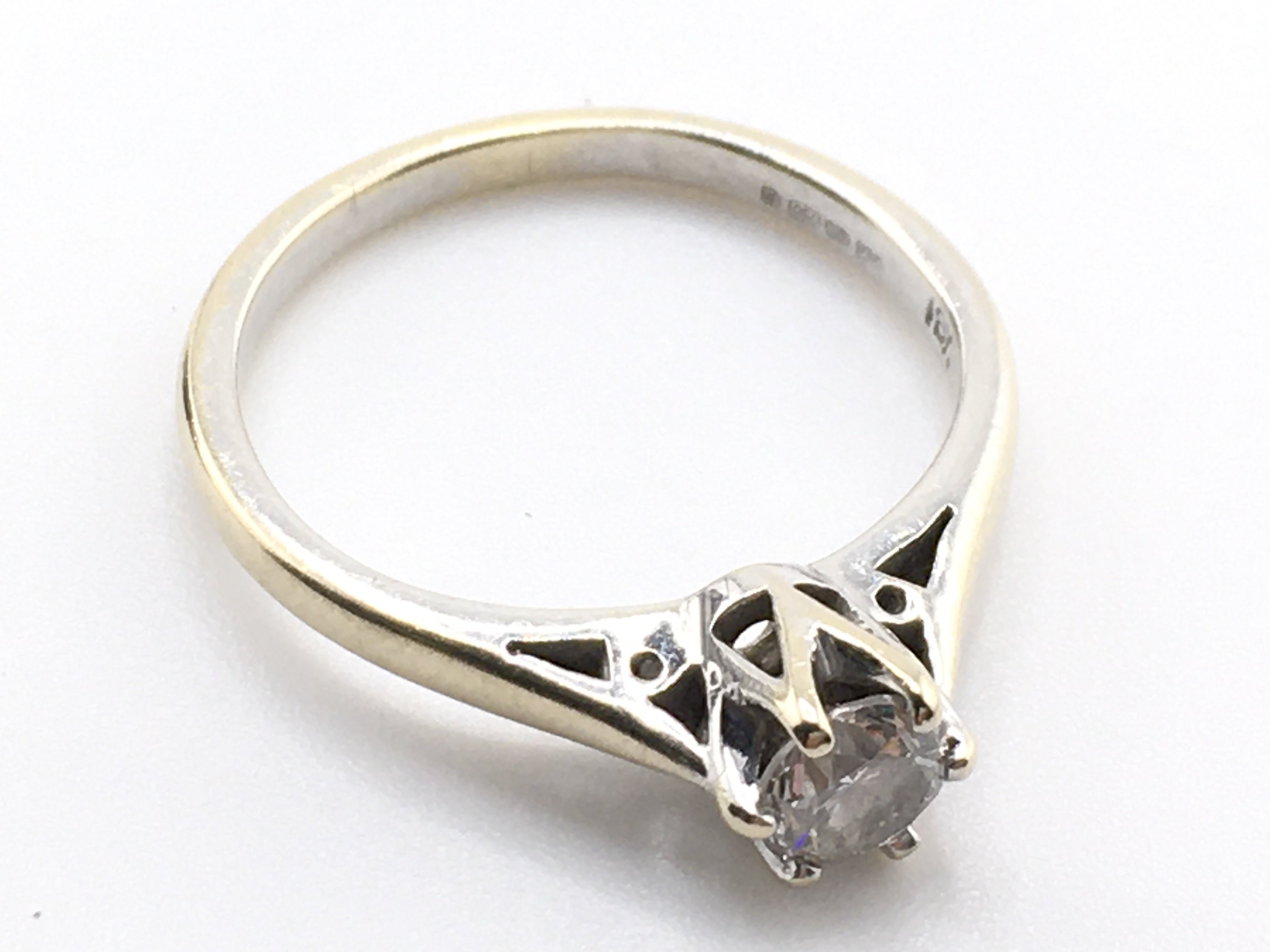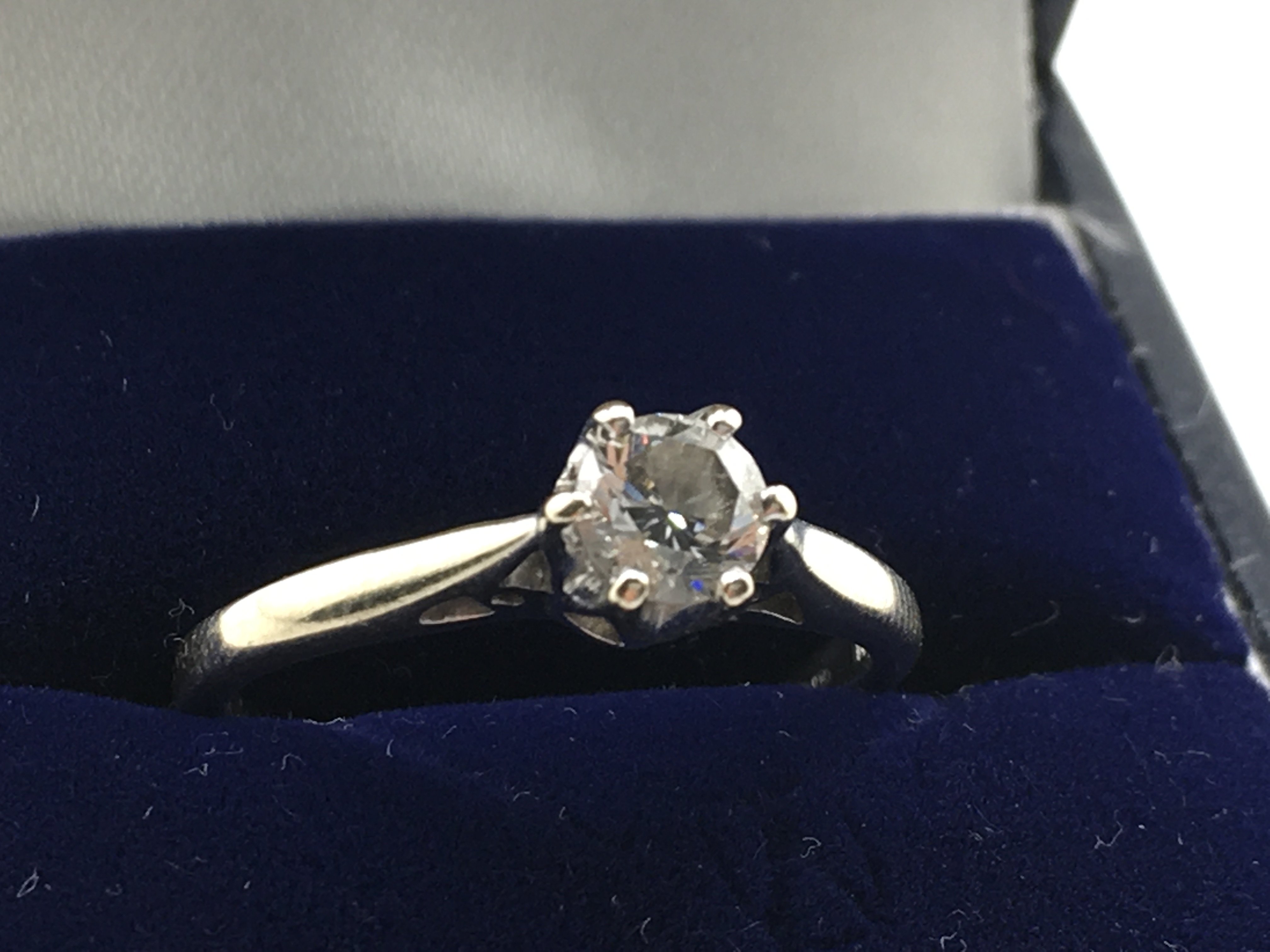 An 18 carat white gold colour I, si2, 0.40ct RBC Solitaire diamond set ring. Ring size L/M. Total weight 3g. Postage category A
