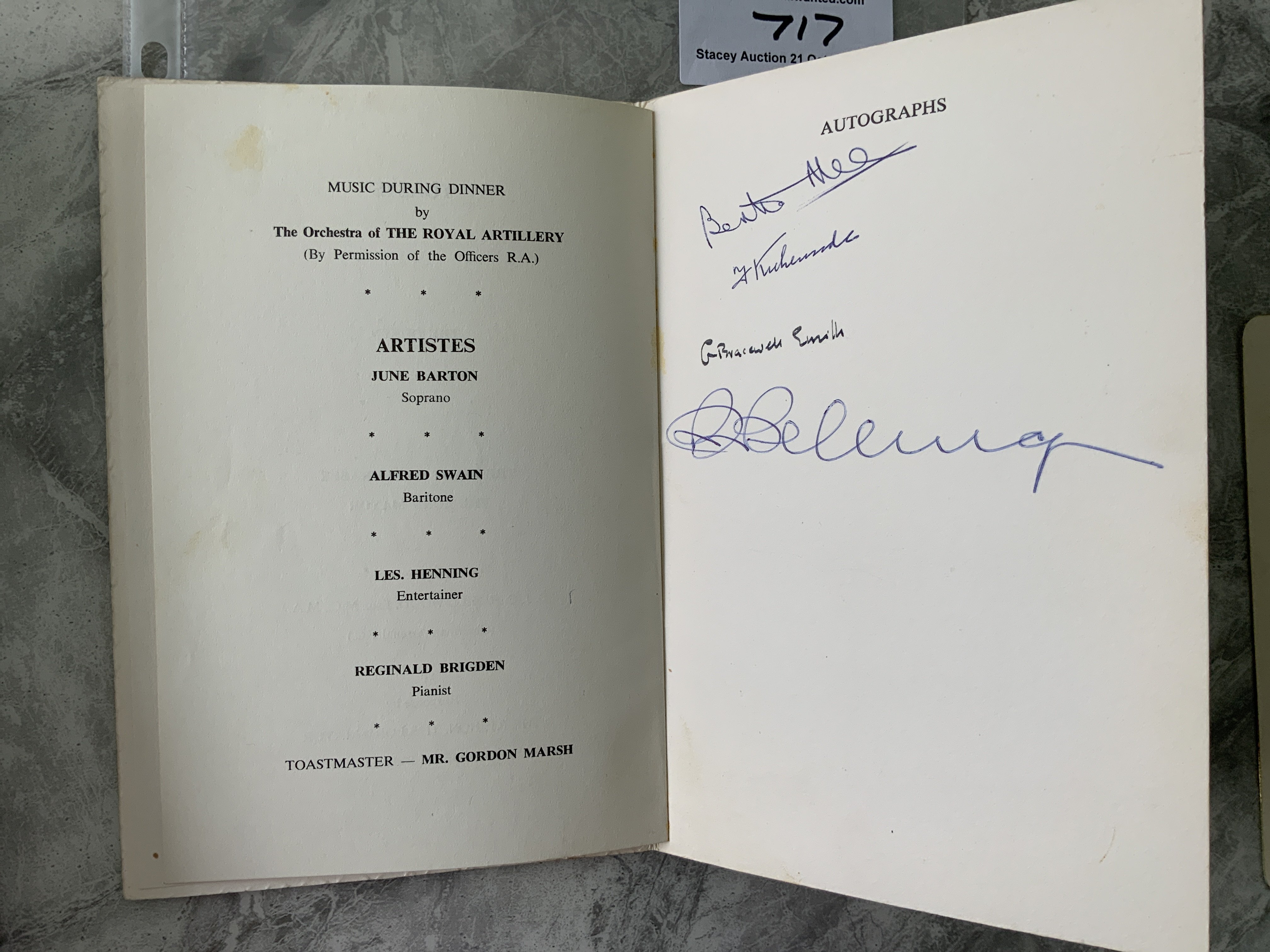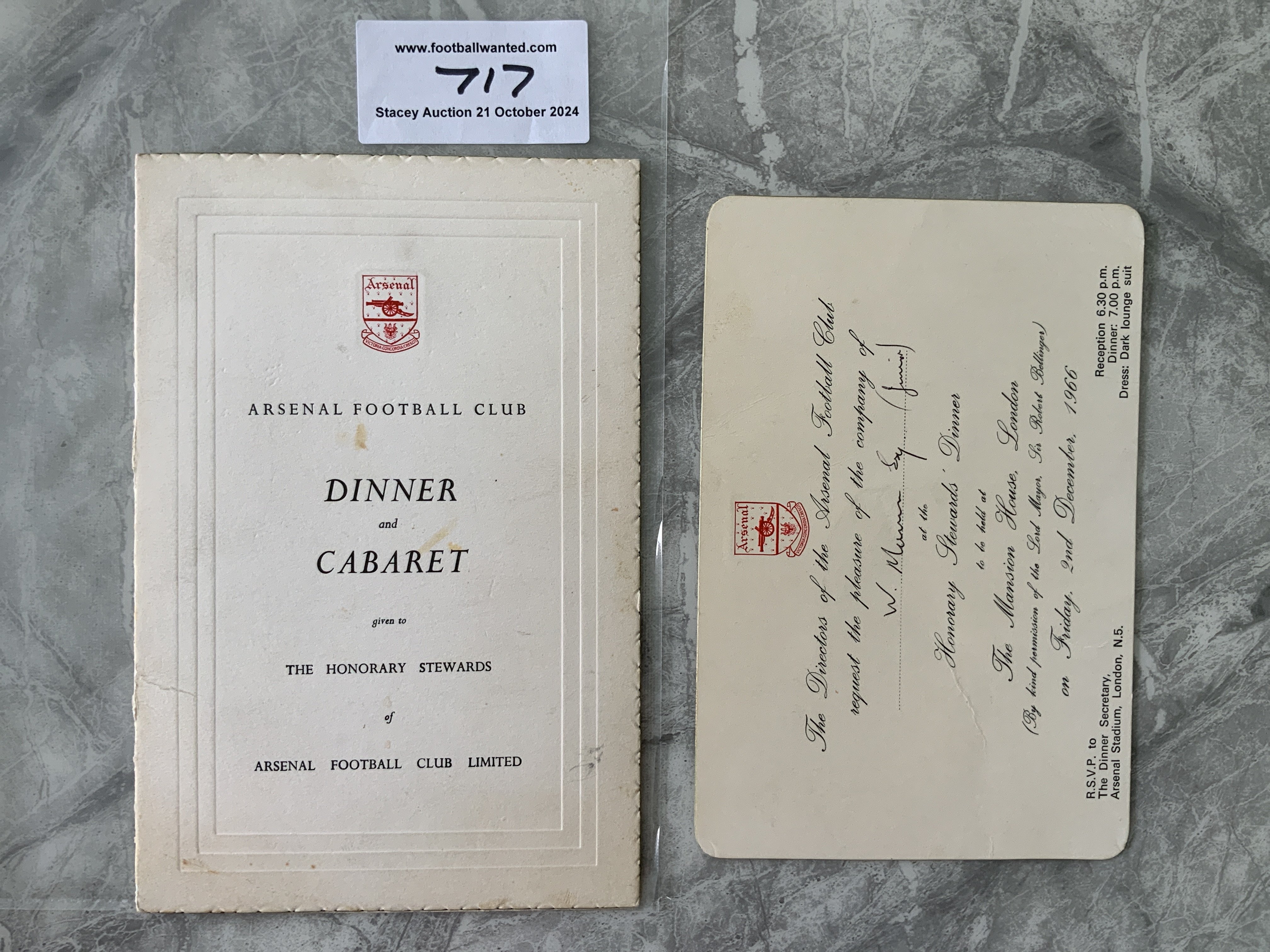 Arsenal 1966 Signed Honorary Stewards Dinner Menu: Held at the Mansion House at Christmas 1966. Signed inside by a few including Bertie Mee and the Major of London with the rear blank page being signed by 19 although not necessarily players. C/W invite.