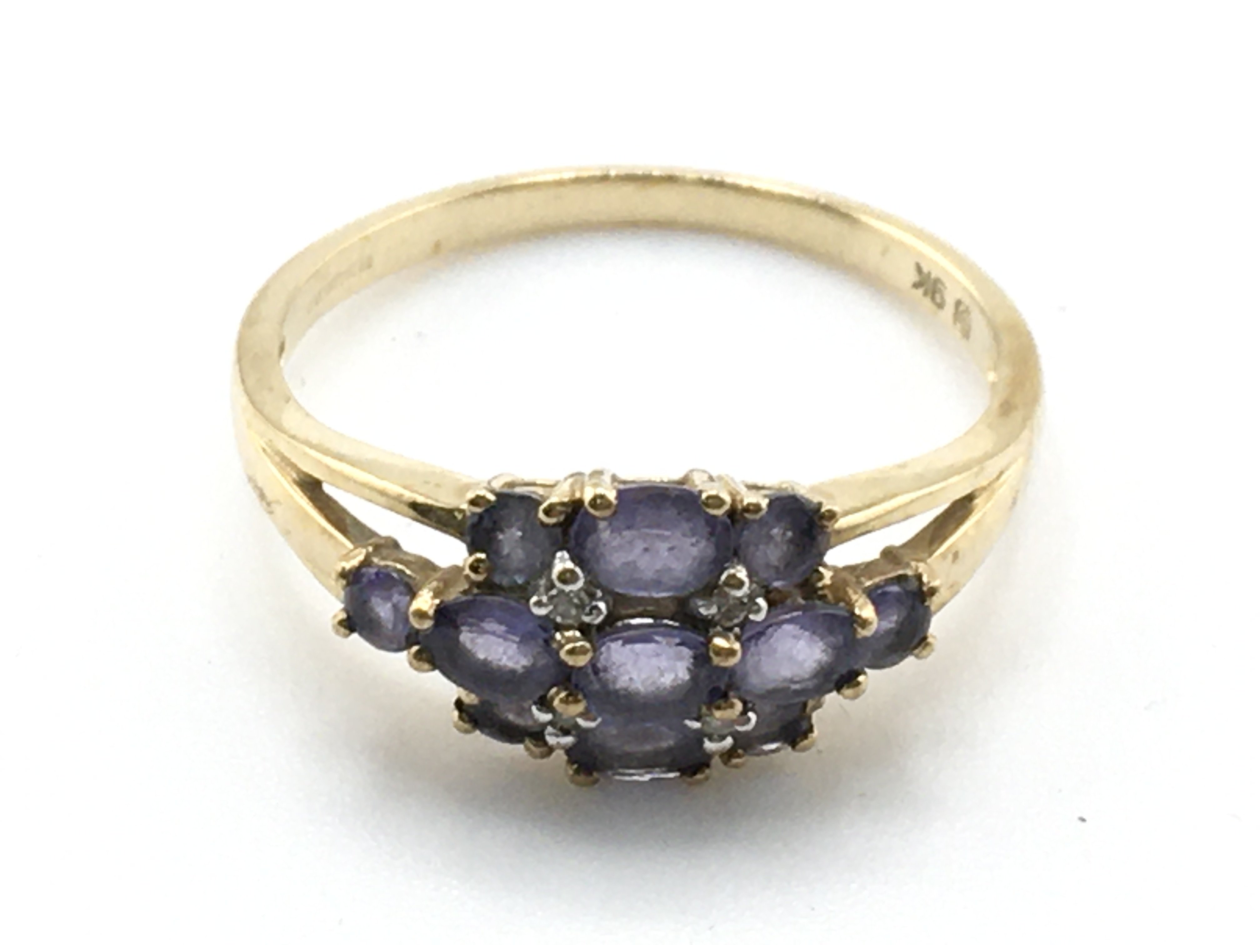 A 9 carat diamond and tanzanite ring, size T. 2.7g. Postage category a