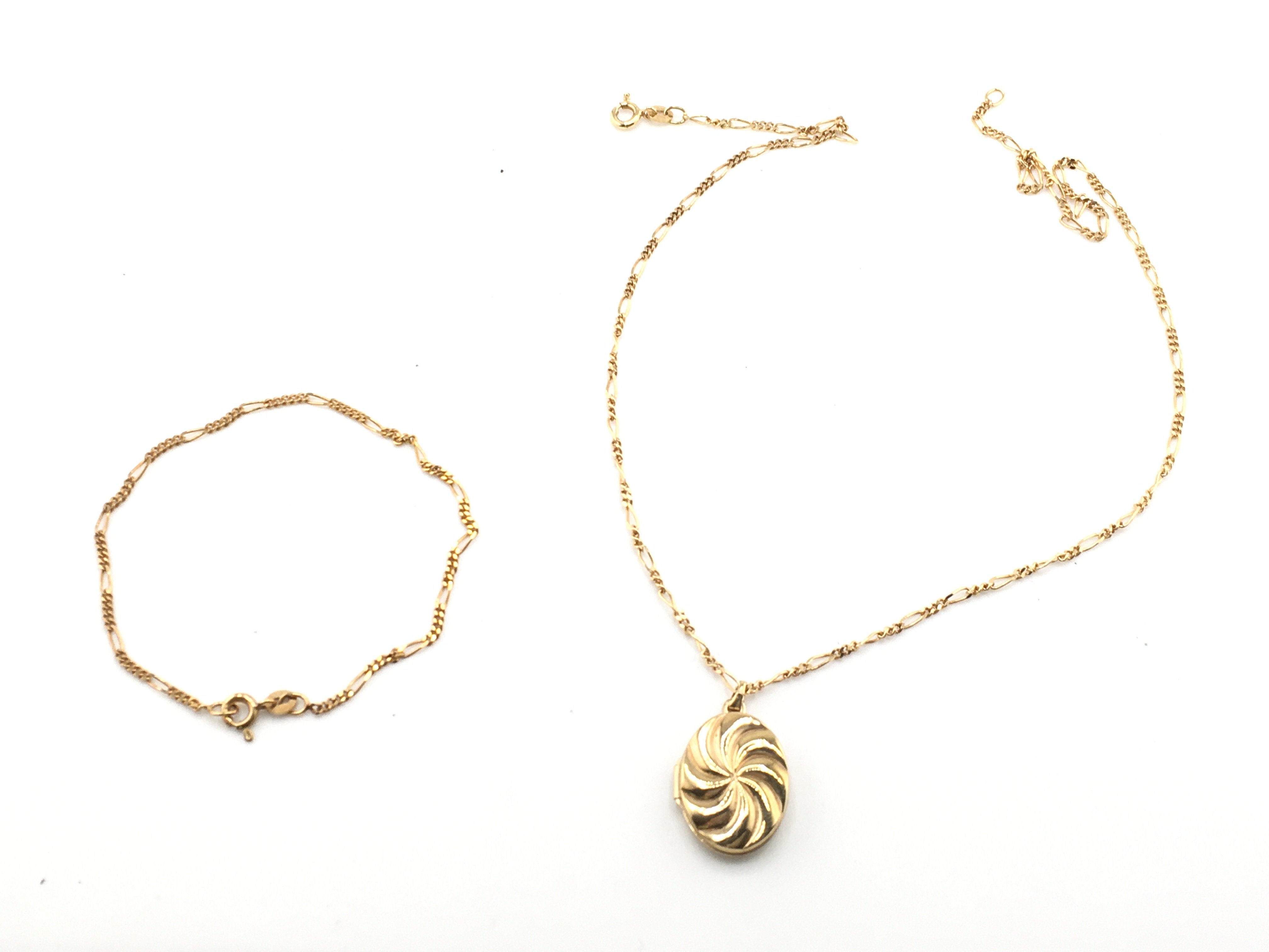 A 9 carat gold bracelet and a 9 carat gold chain with locket , 6.4g total weight. Postage category a