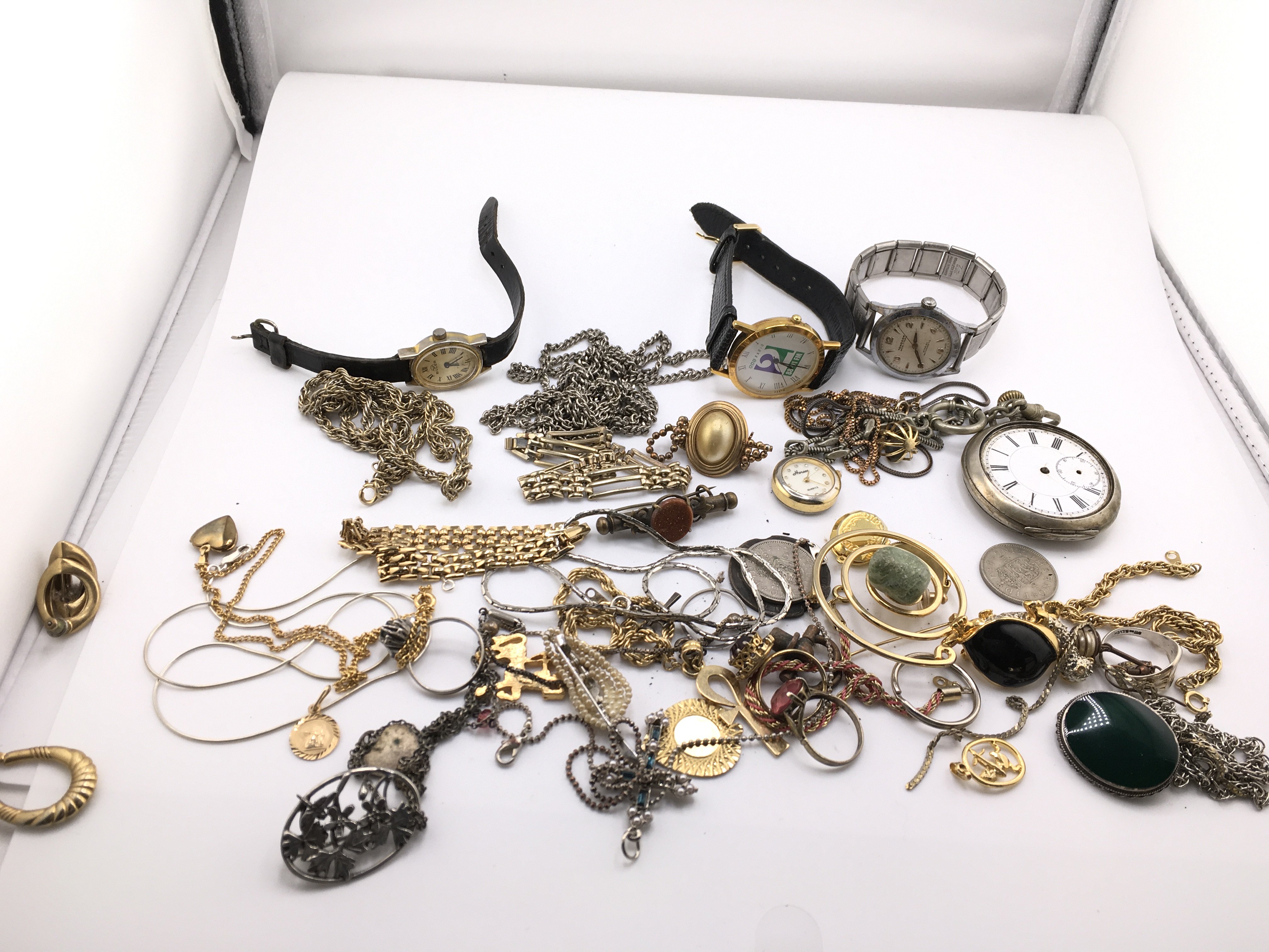 A mixed collection of costume jewellery including a silver ring, brooches, watches etc
