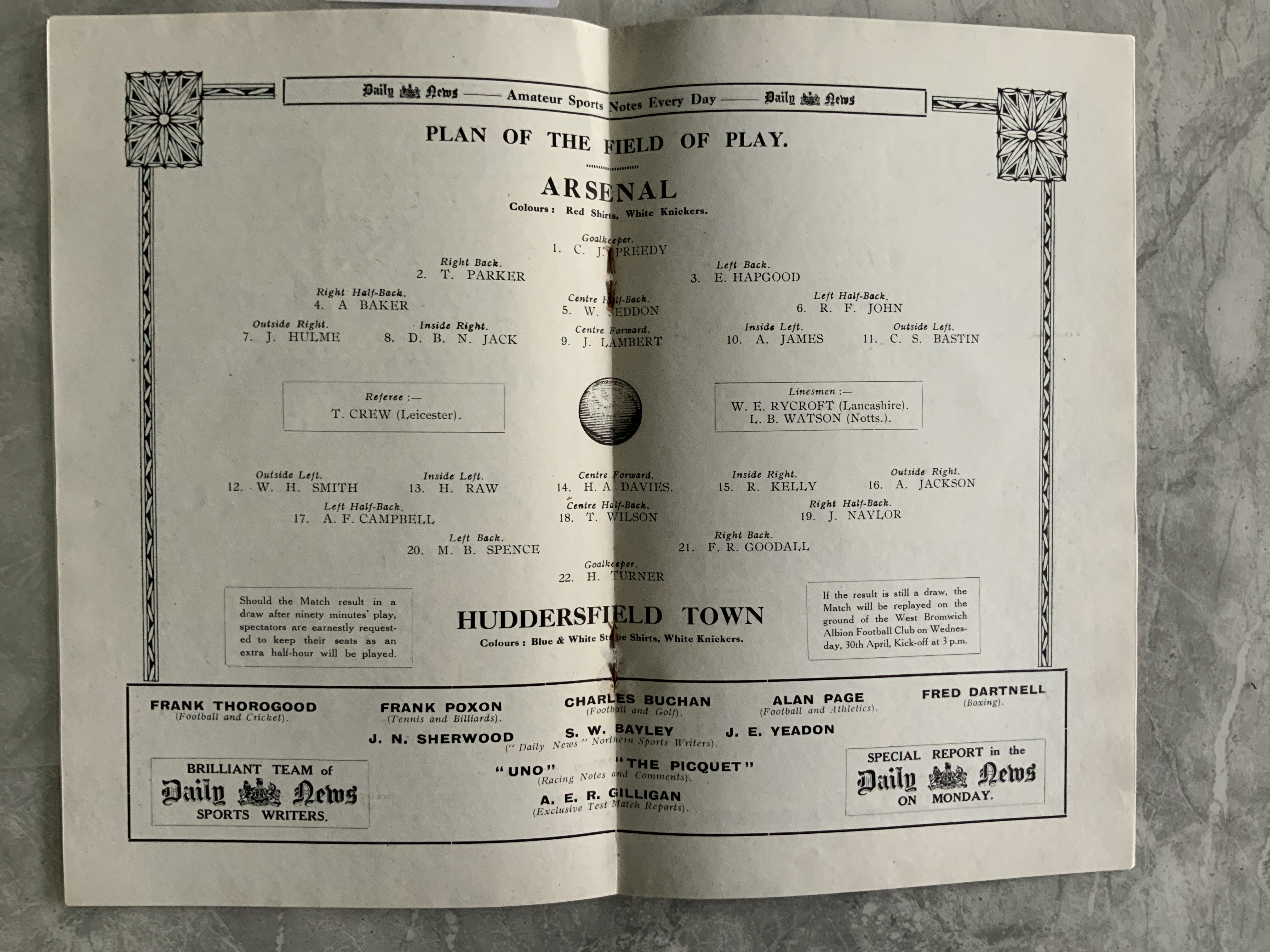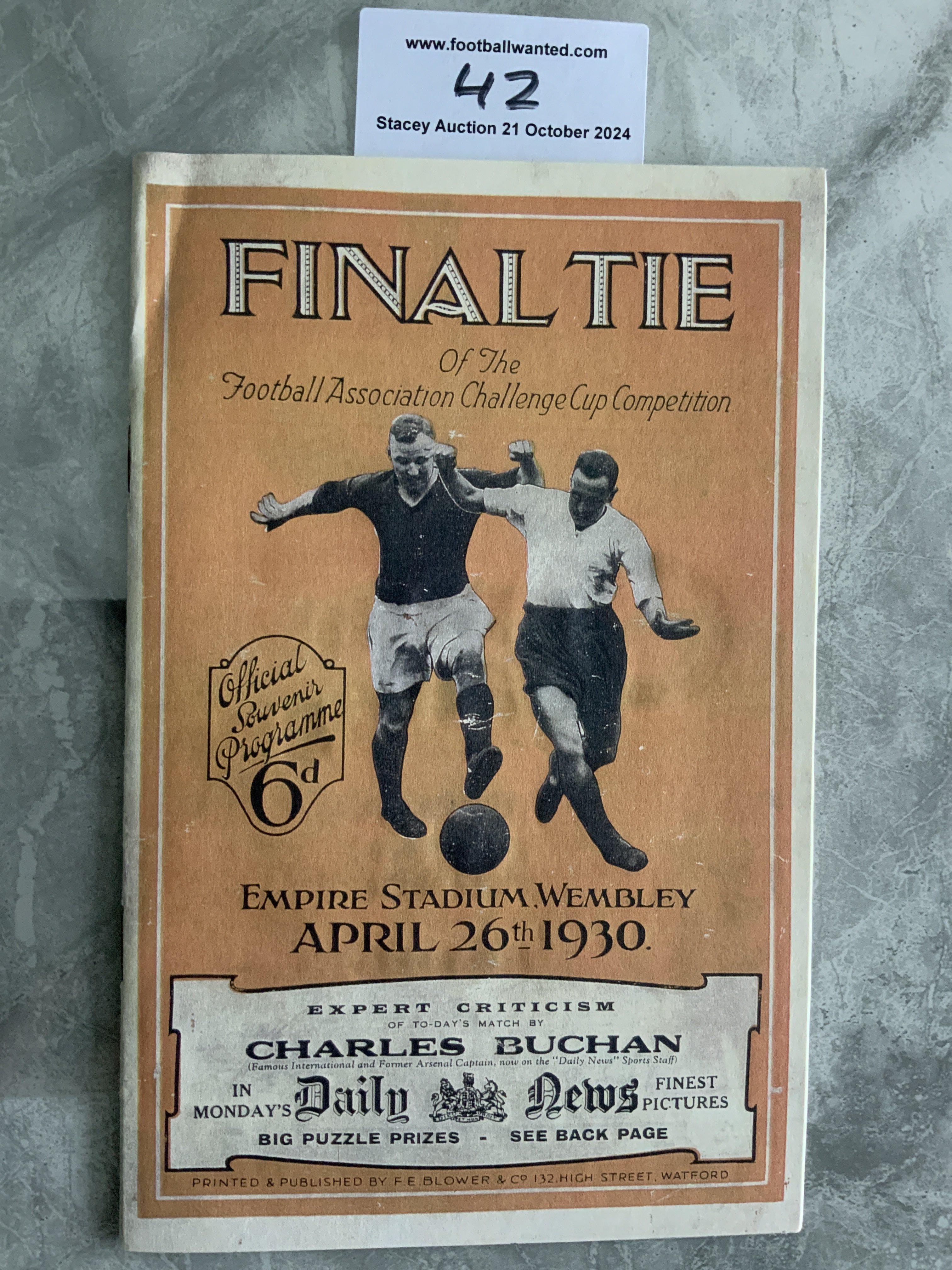 1930 FA Cup Final Football Programme: Arsenal v Huddersfield in very good condition with no team changes. Please note this has a replica cover so good we had to check it against our stock and after examining we believe the cover has been replaced.