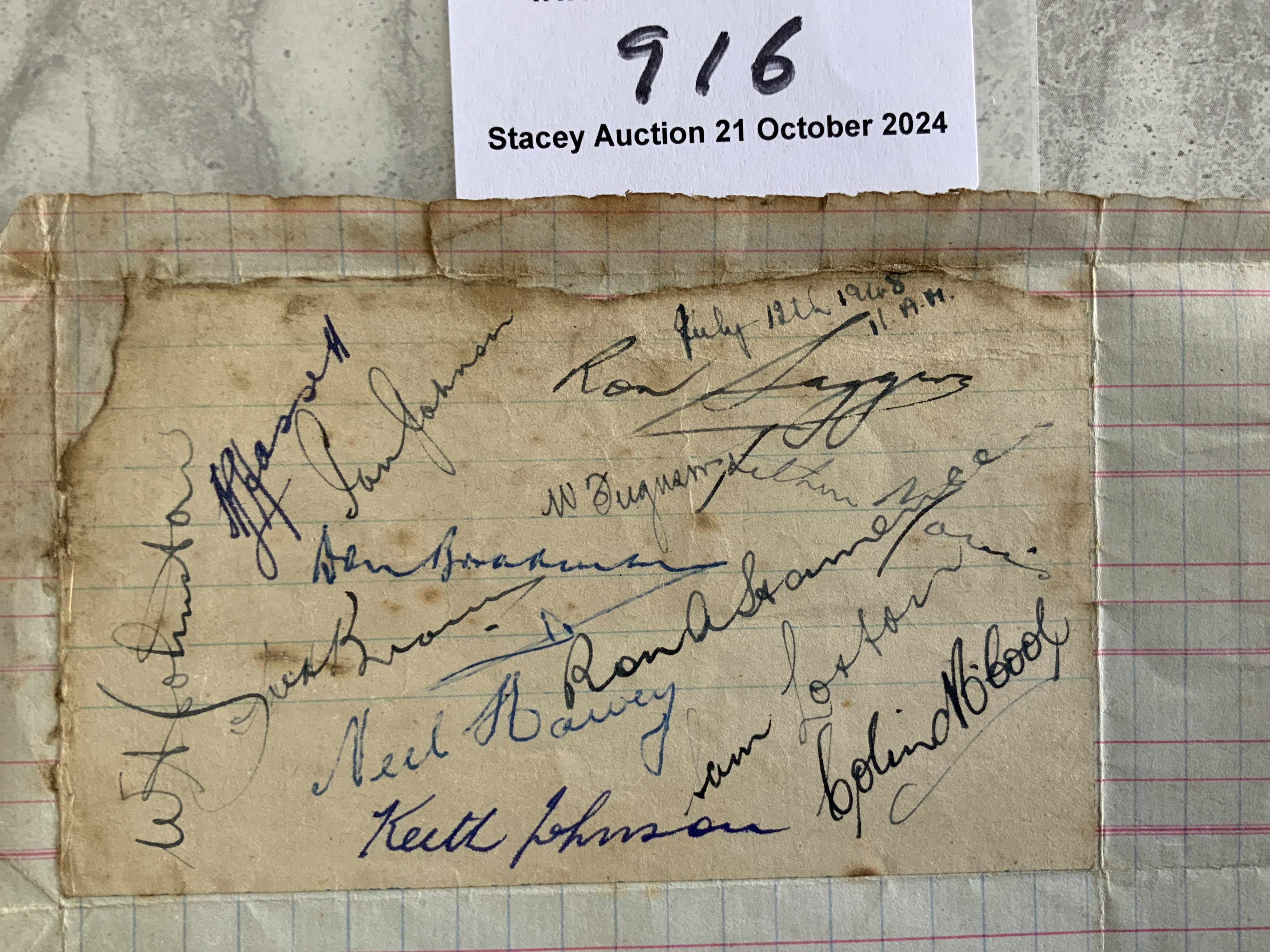 1948 Australian Cricket Team Autographs: Possibly the best ever team that toured England and remaining undefeated. Breaking records to include 721 runs in a day at Essex on Bradmans last UK tour. Autograph page has been stuck down and includes Bradman Johnston Johnson McCool Johnson Saggers Loxton Hamence Hassett Harvey and others. Signed on 12 7 1948 the fourth day of test at Manchester.