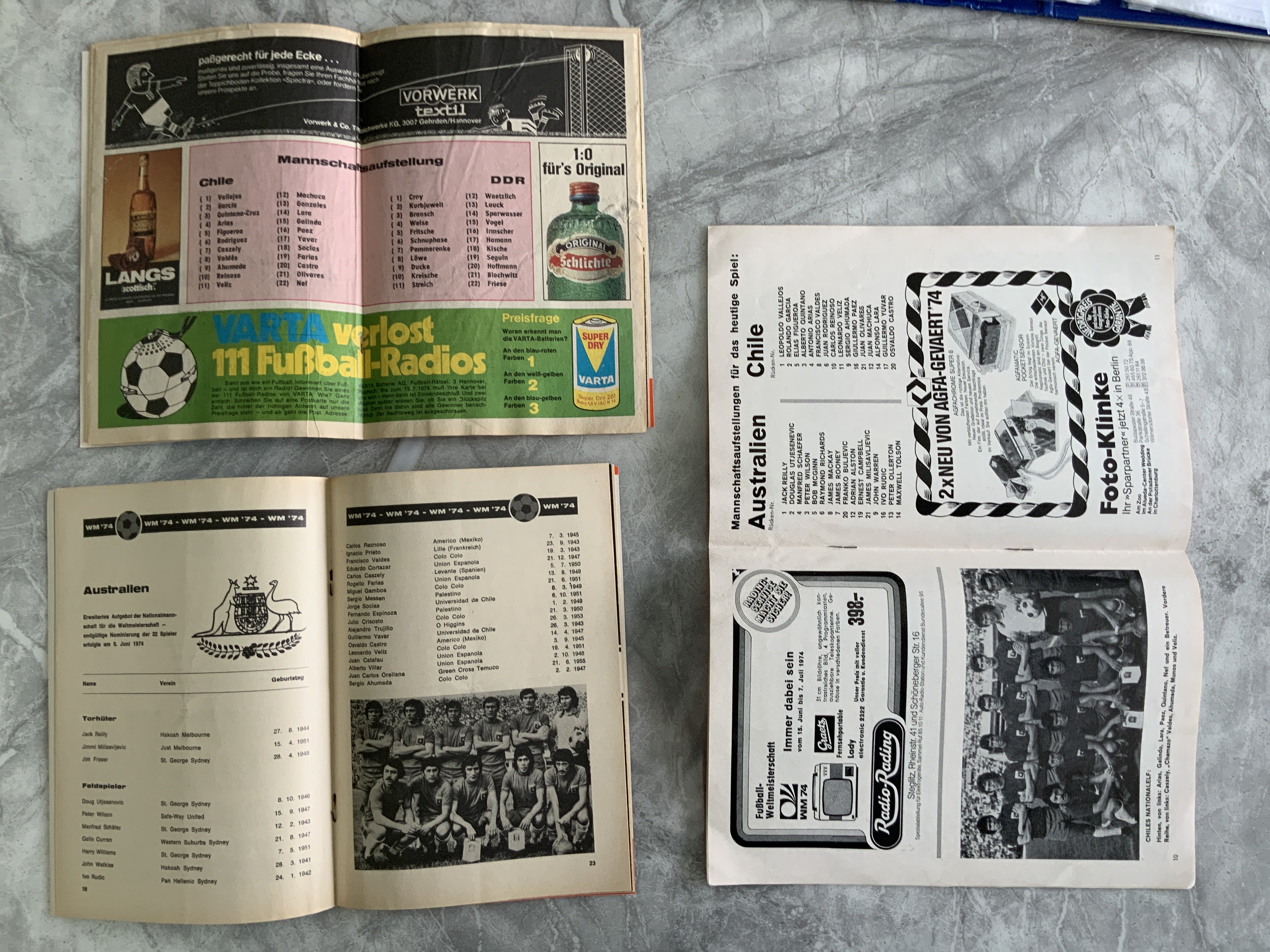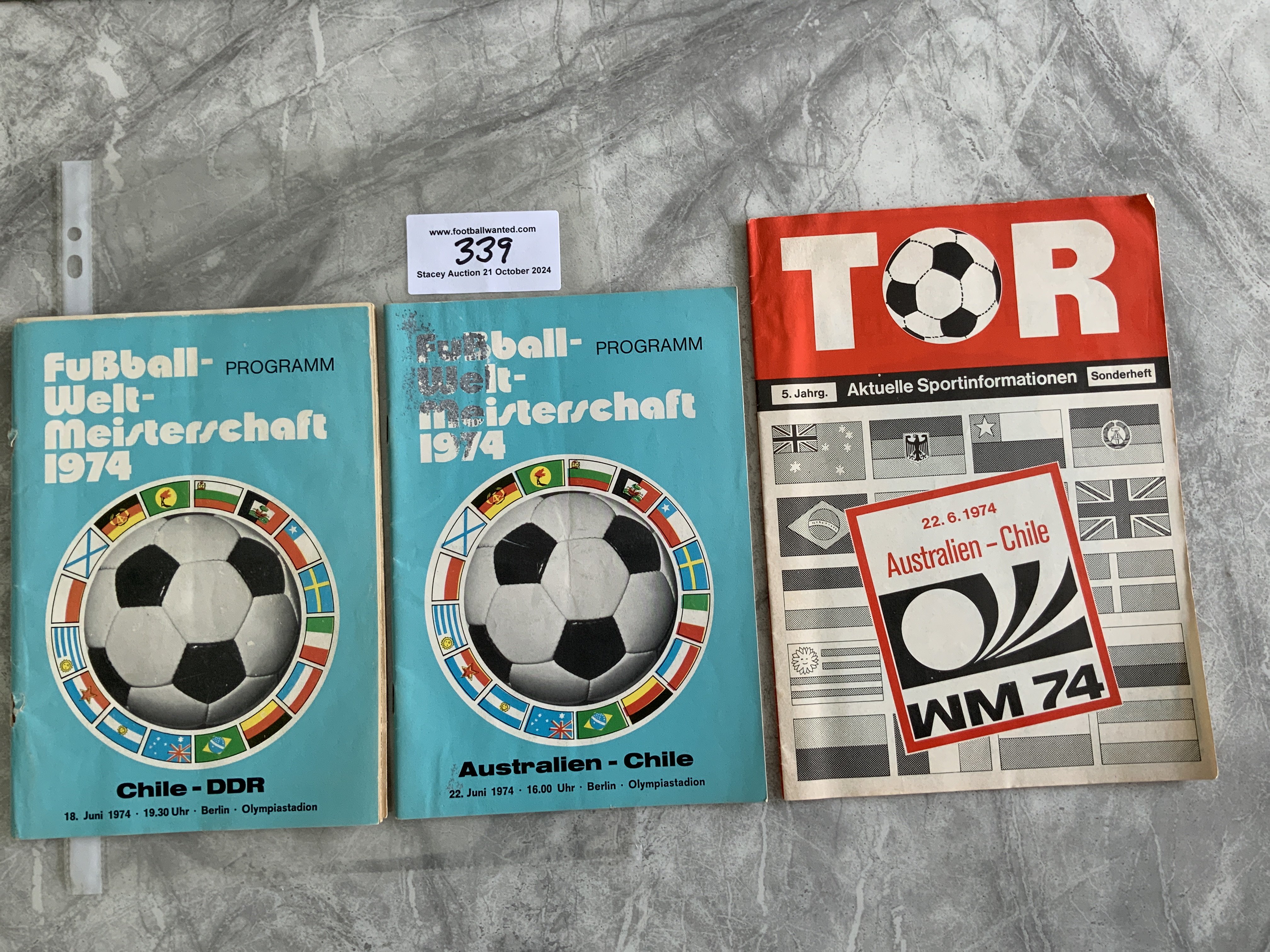 1974 World Cup Chile Football Programmes: Official programmes v East Germany tear at staples and Australia centre team page missing and a TOR Aktuelle version of the Australia match which is excellent. (3)