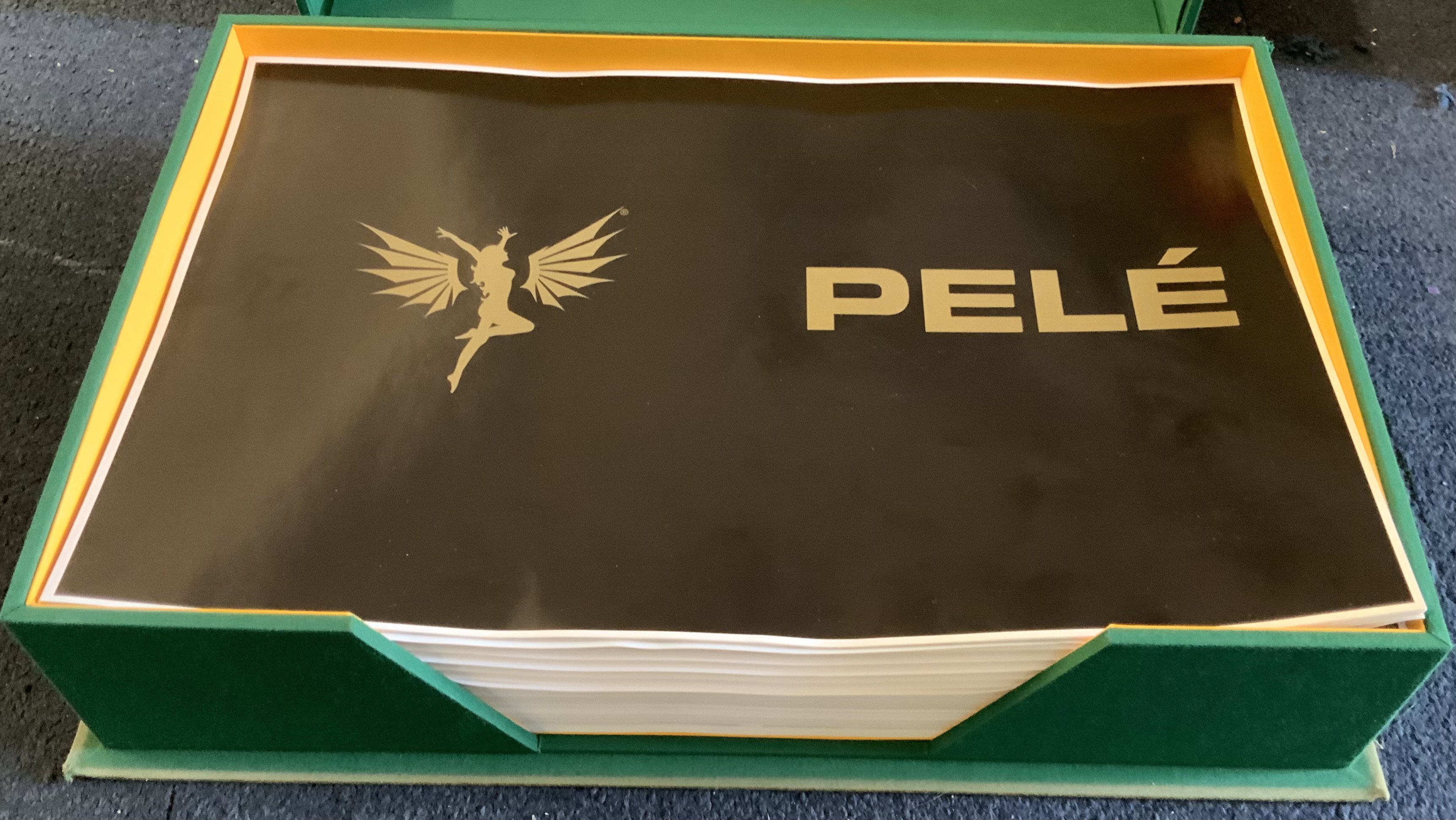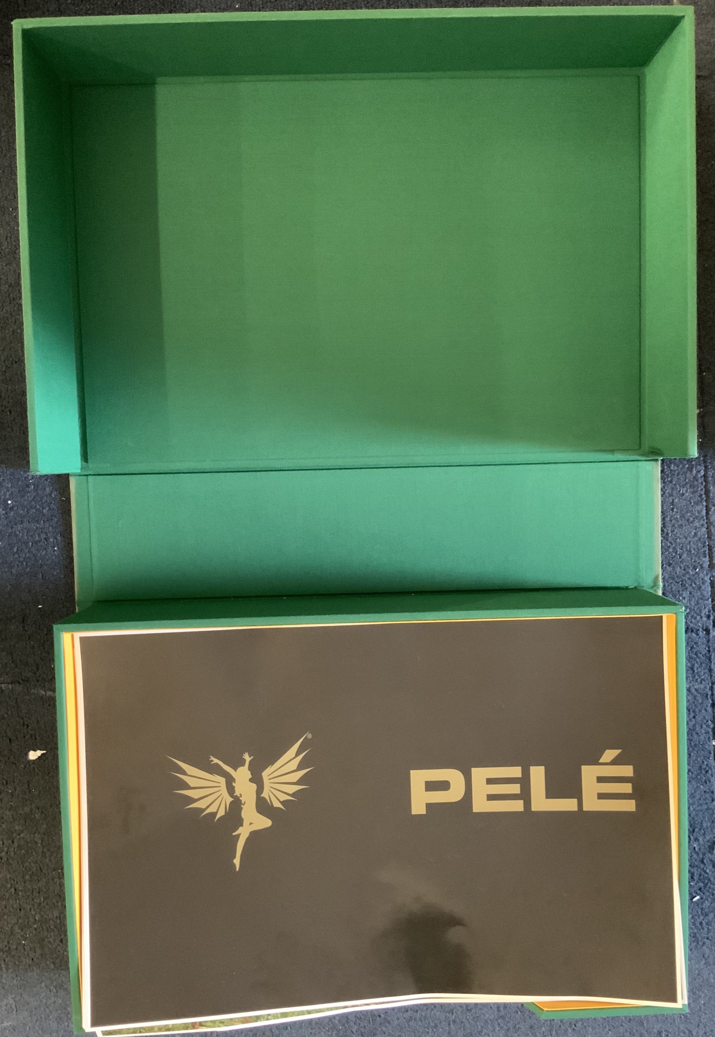 Pele Rare Proof Copy Of Football Book: The 2006 boxed 12kg book came in two editions Samba at 1.6k and Carnival at 4k. Being a proof copy it is not signed or bound. The embossed green box has some slight discolouration but contents are perfect. There is a very large advertising booklet regarding this forthcoming book in 2006 by Gloria Books.