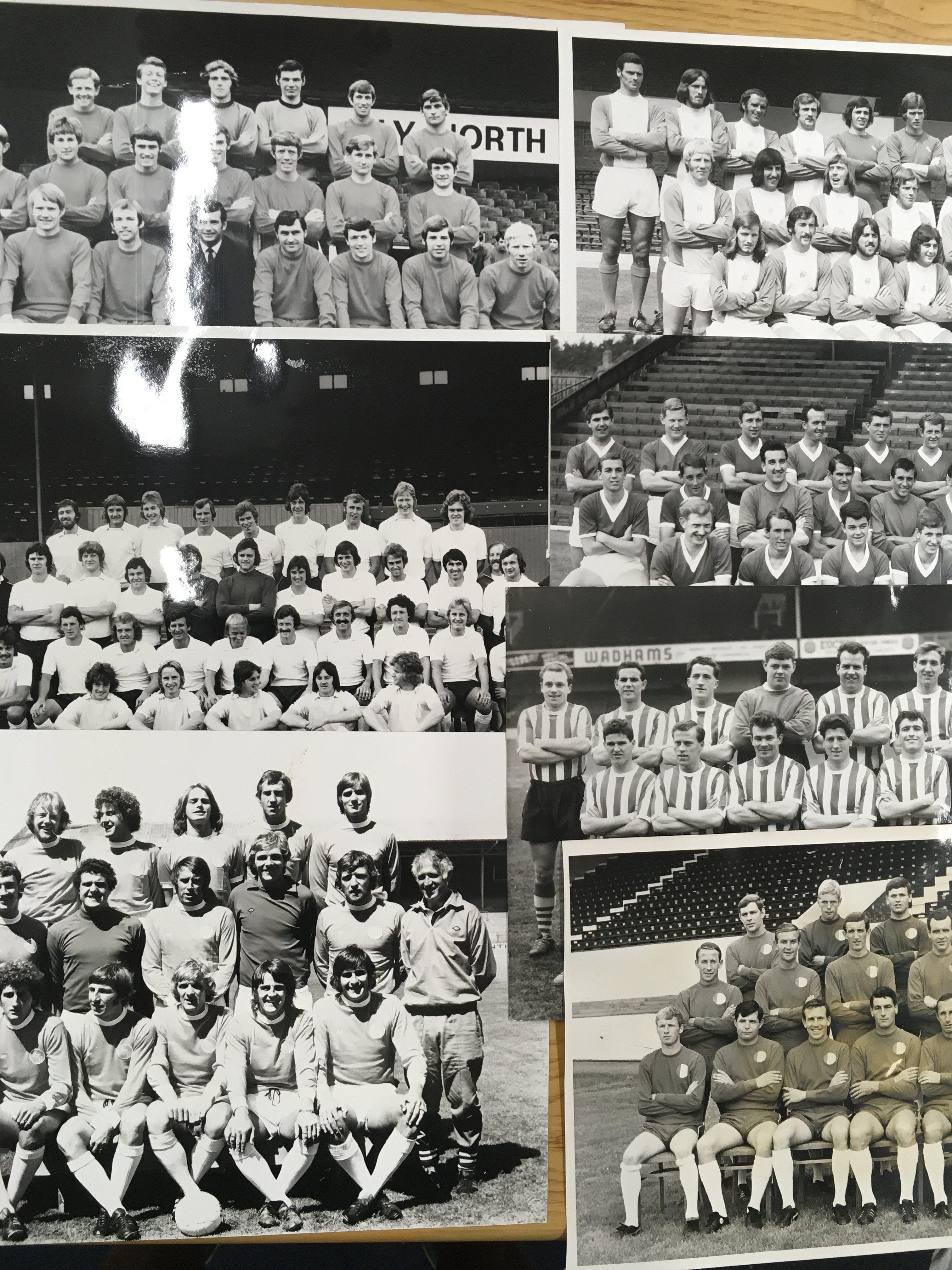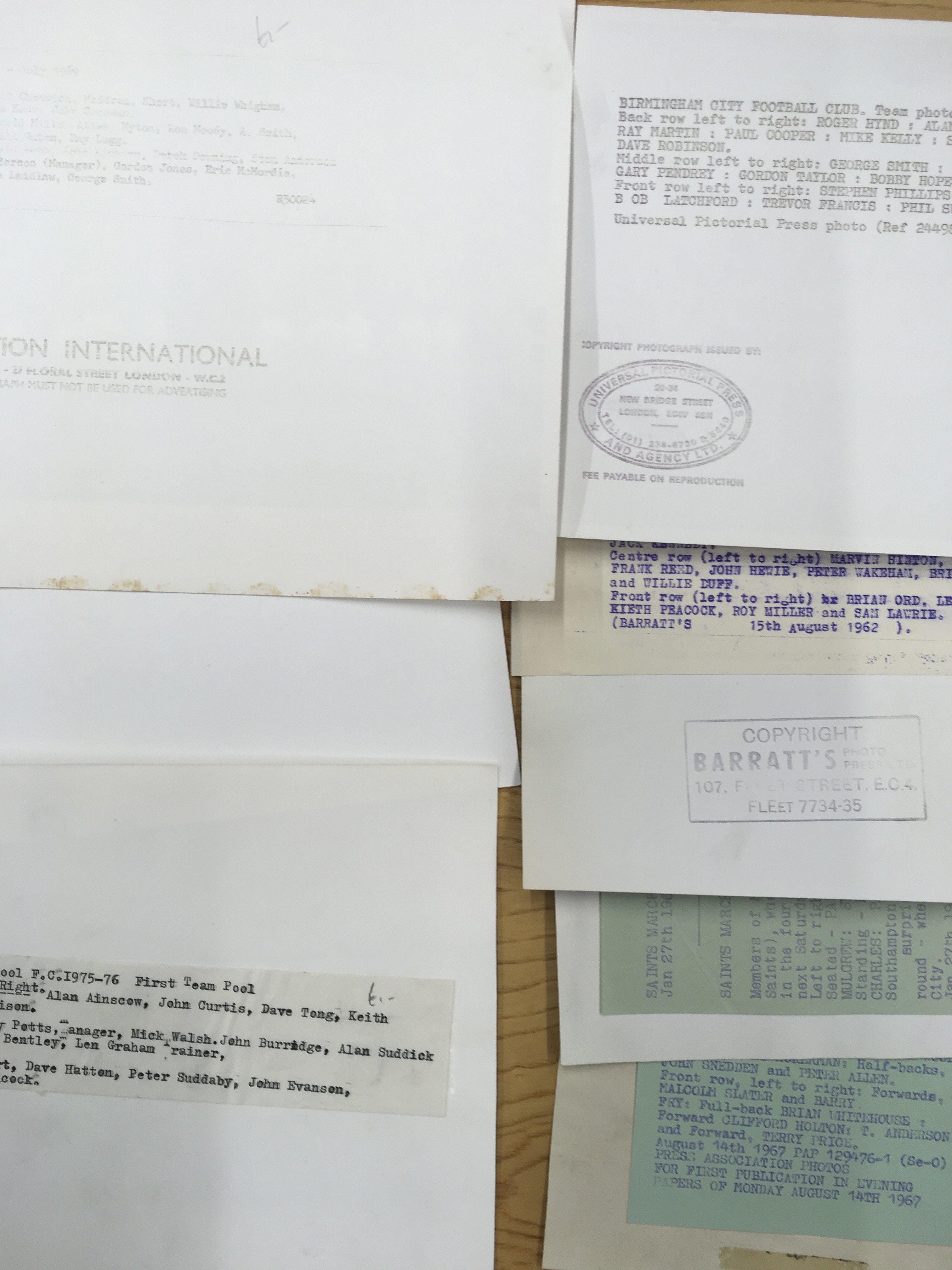 Football Team Group Press Photos: Includes 67/68 Orient, 59/60 Southampton, 62/63 Charlton, 72/73 Birmingham, Bolton no press stamp, 75/76 Blackpool, 69/70 Middlesbrough. Press stamps and annotations unless stated. (7)