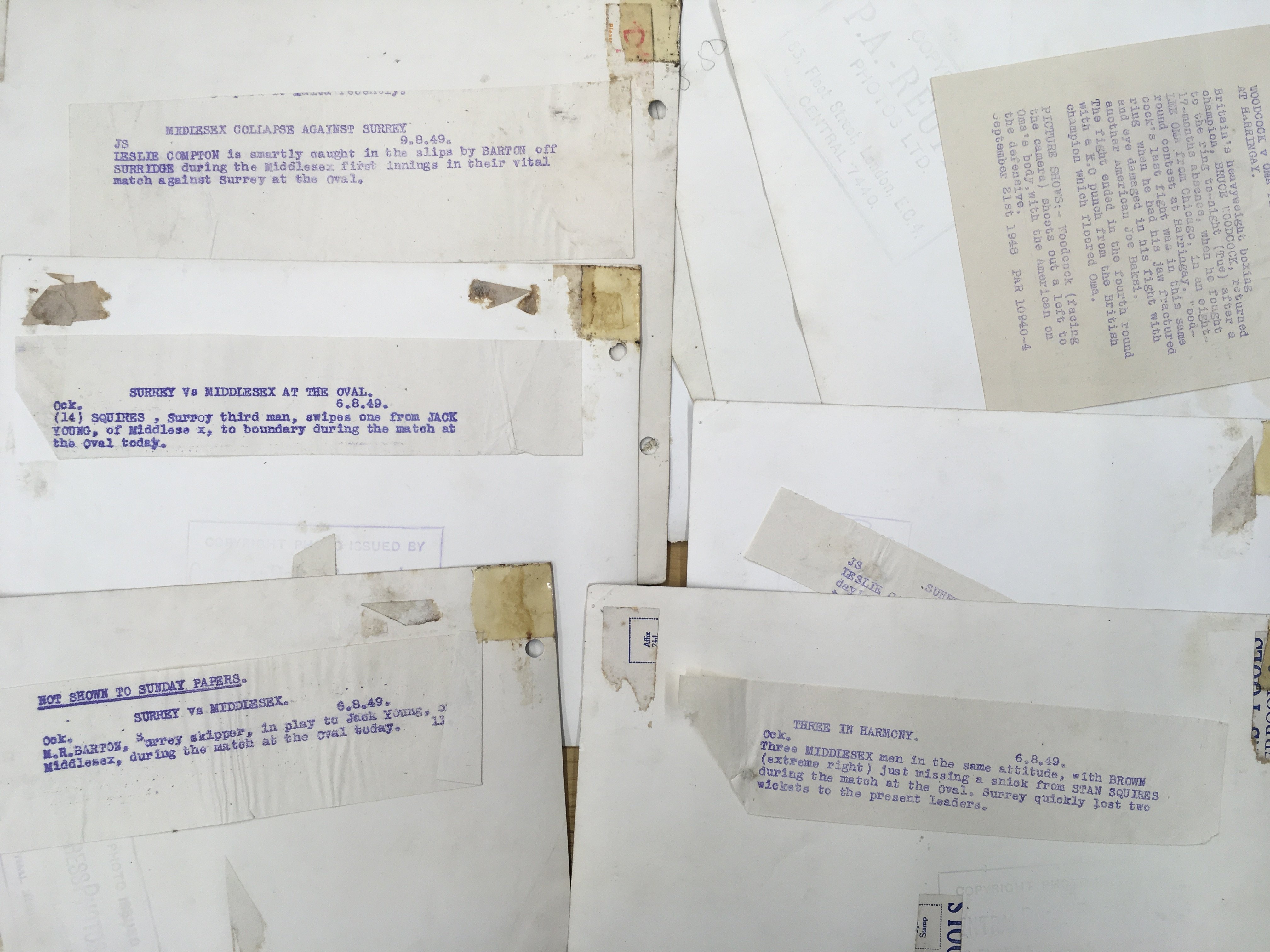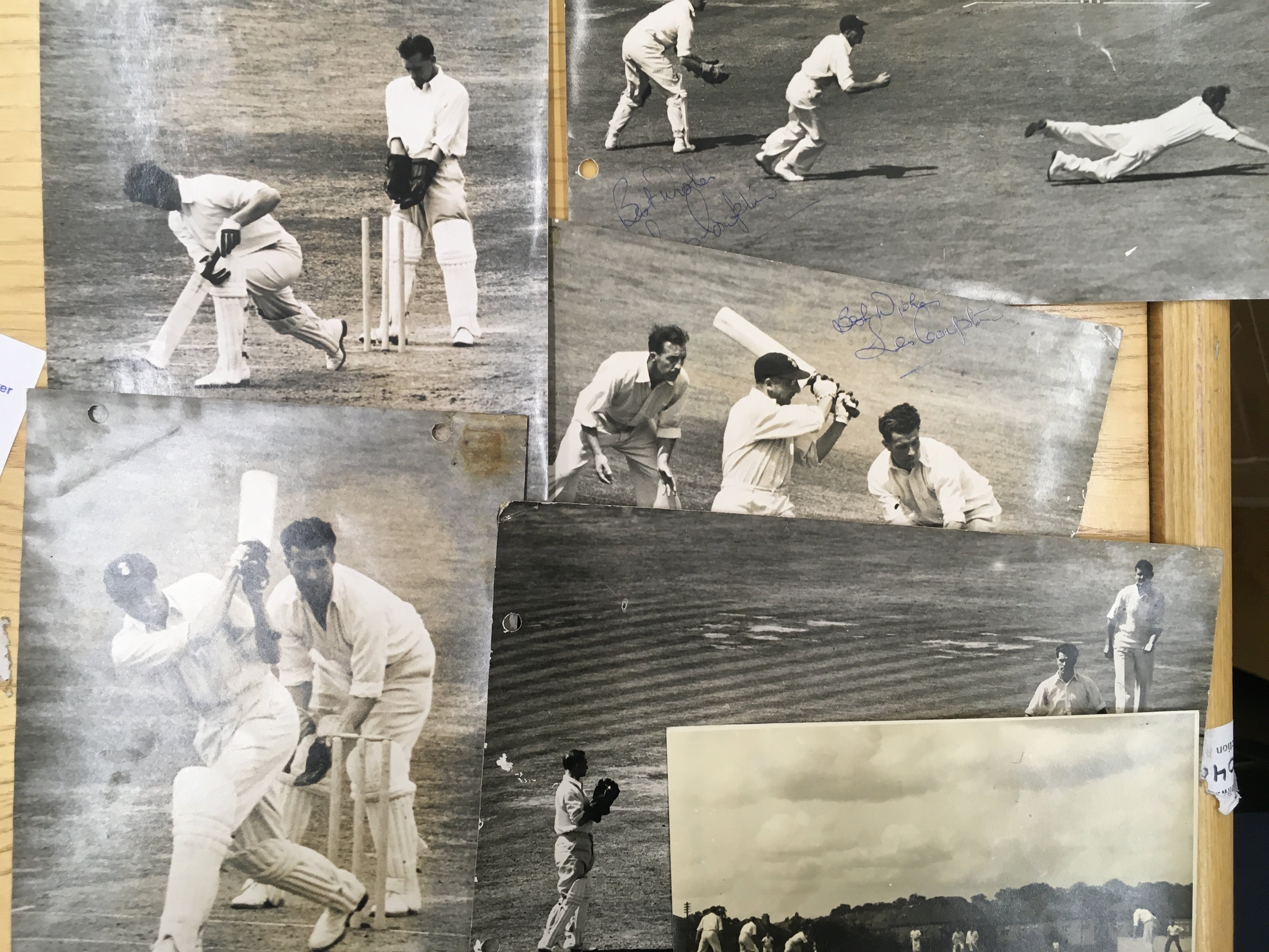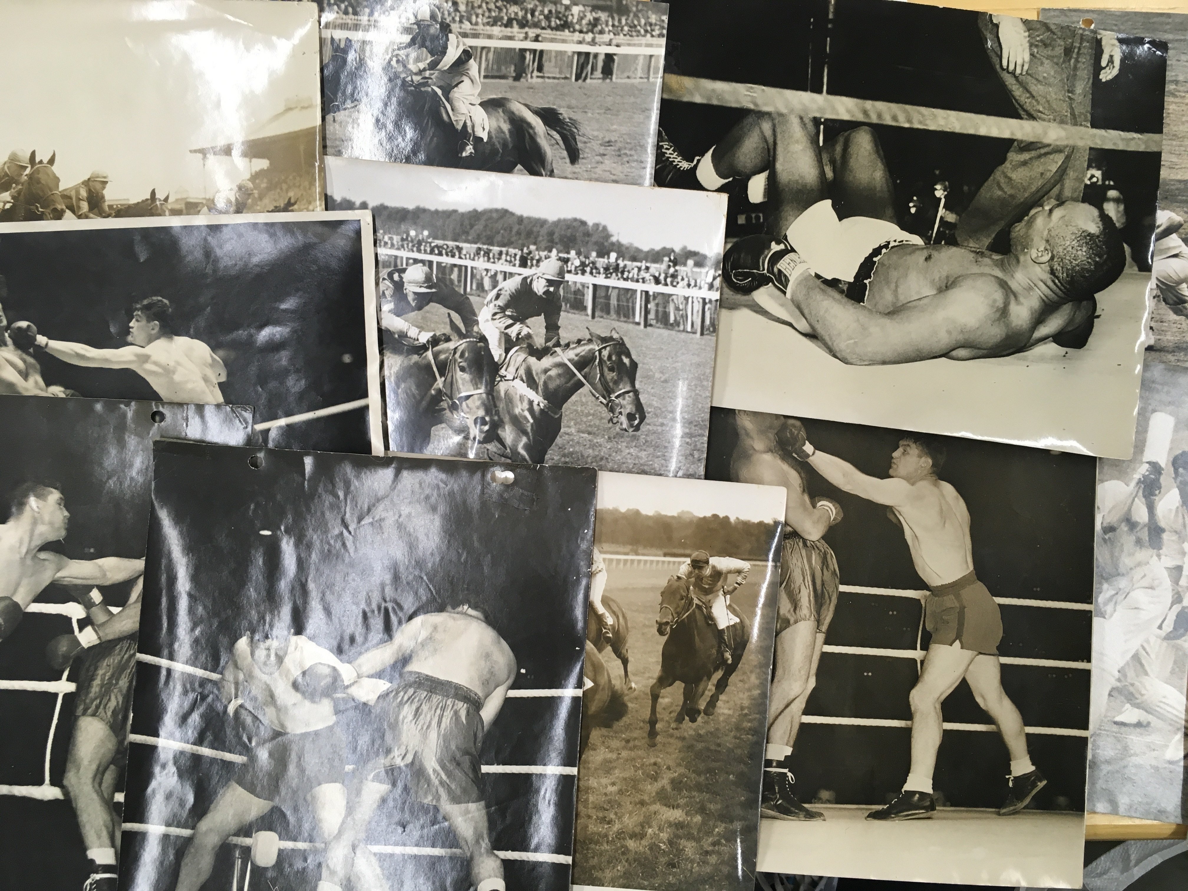 1940s Sporting Press Photos: 6 cricket including 2 signed by Les Compton, 4 boxing and 4 horse racing. Nearly all have press stamps and annotations to rear and punch holes. (14)