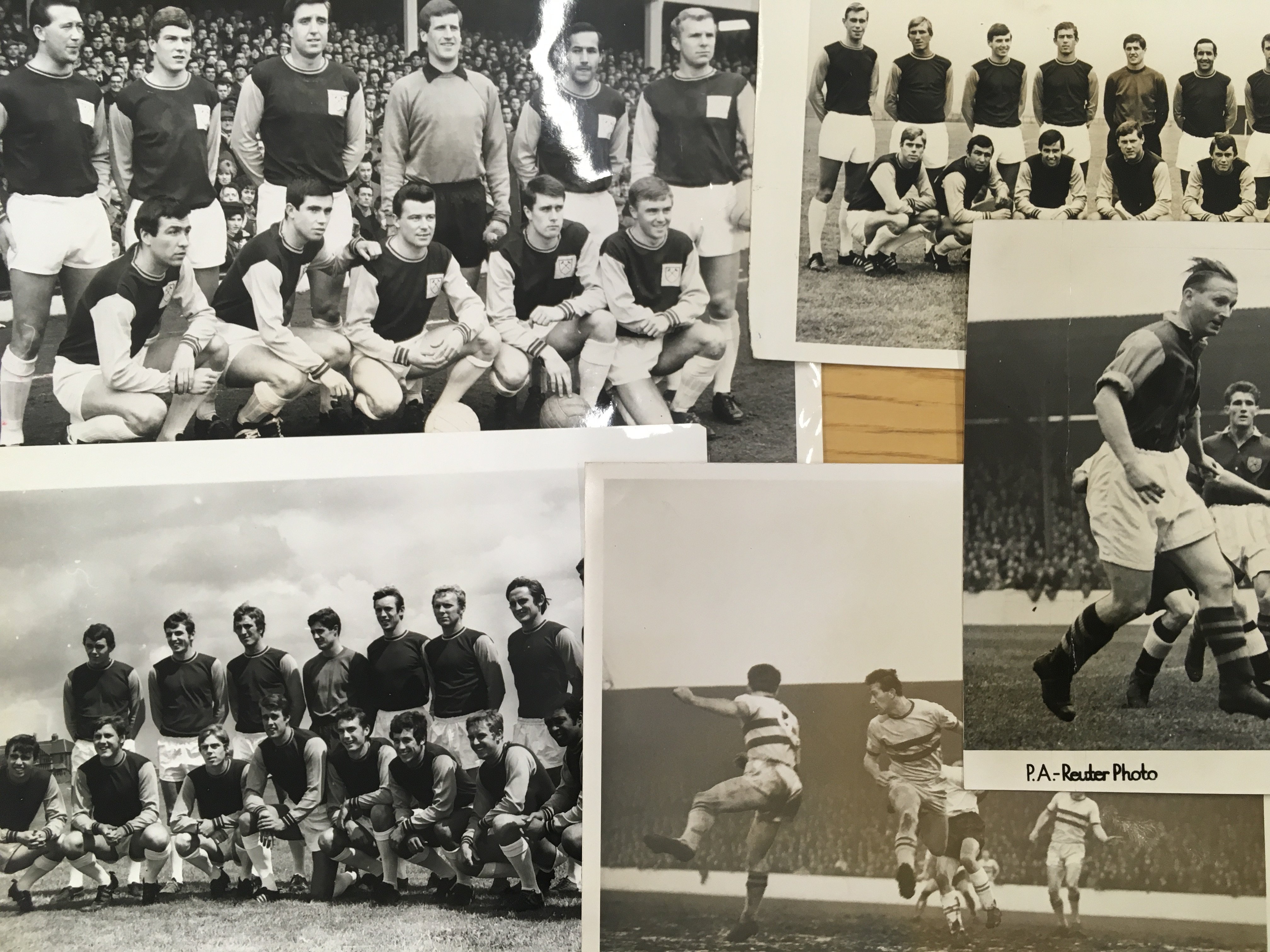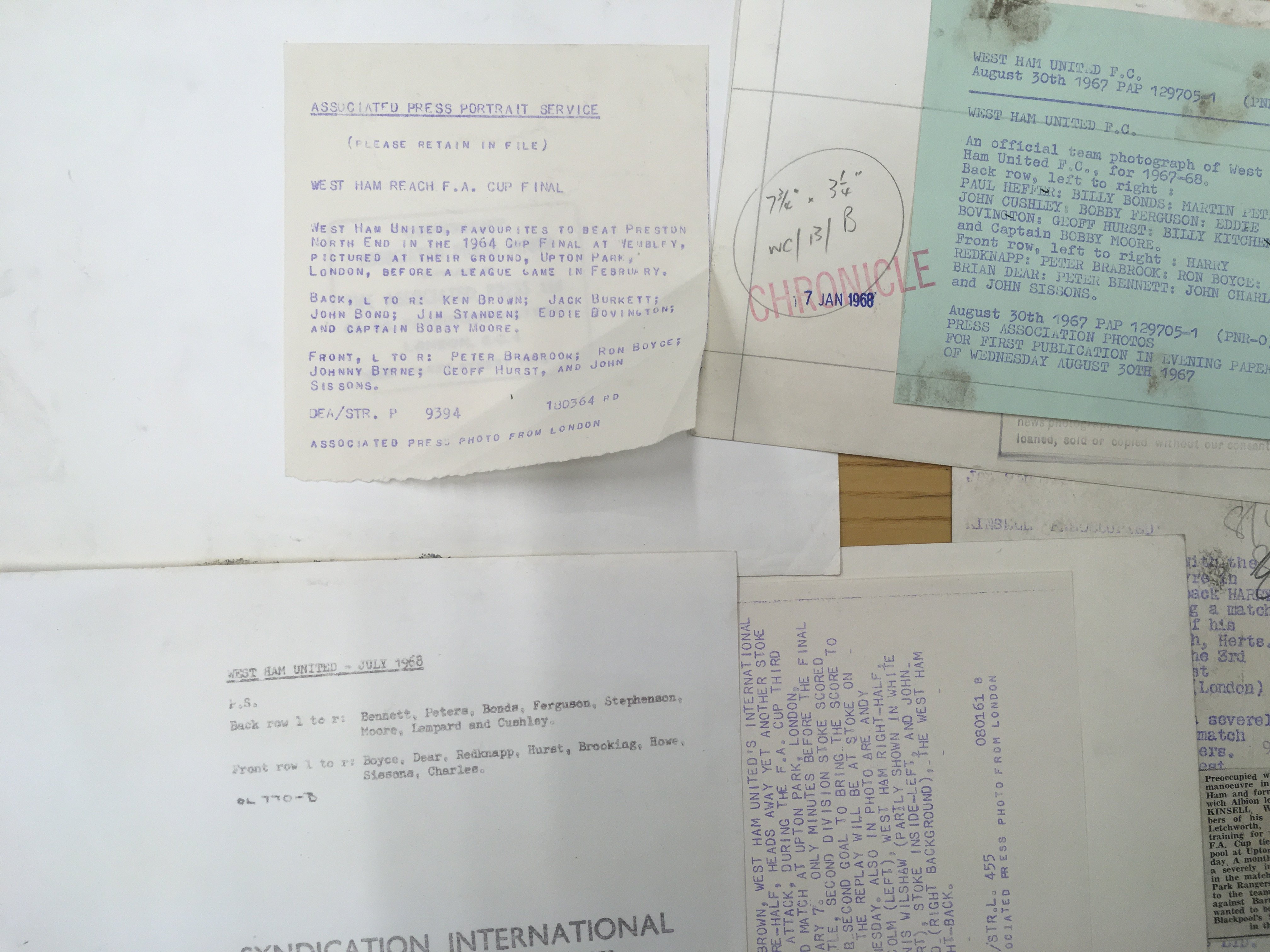 West Ham Football Press Photos: 1964 1967 1968 team groups plus 2 earlier action shots. All have press stamps and annotations. (5)