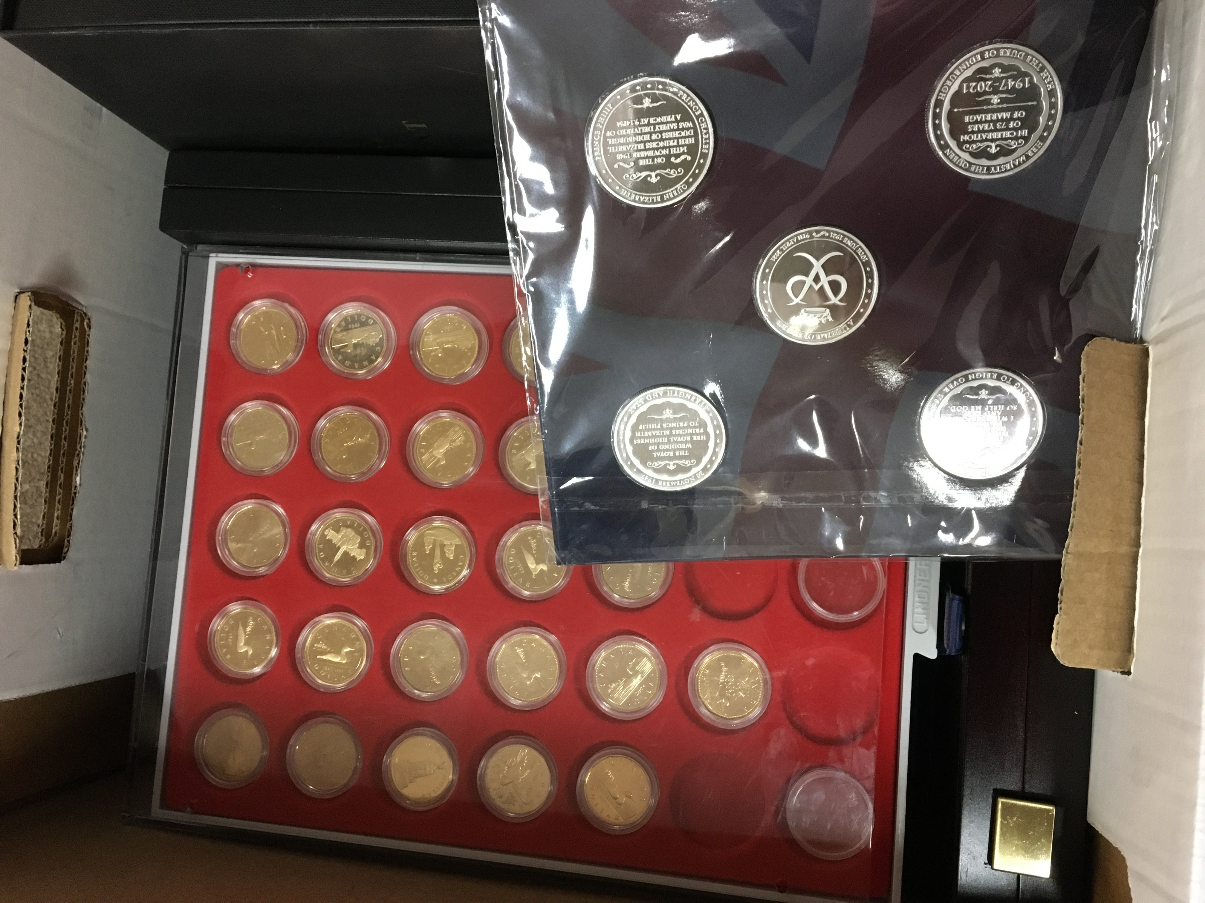 A collection of commemorative coins including cased British Virgin Islands 2007 coins, Canadian dollars etc. Postage category C