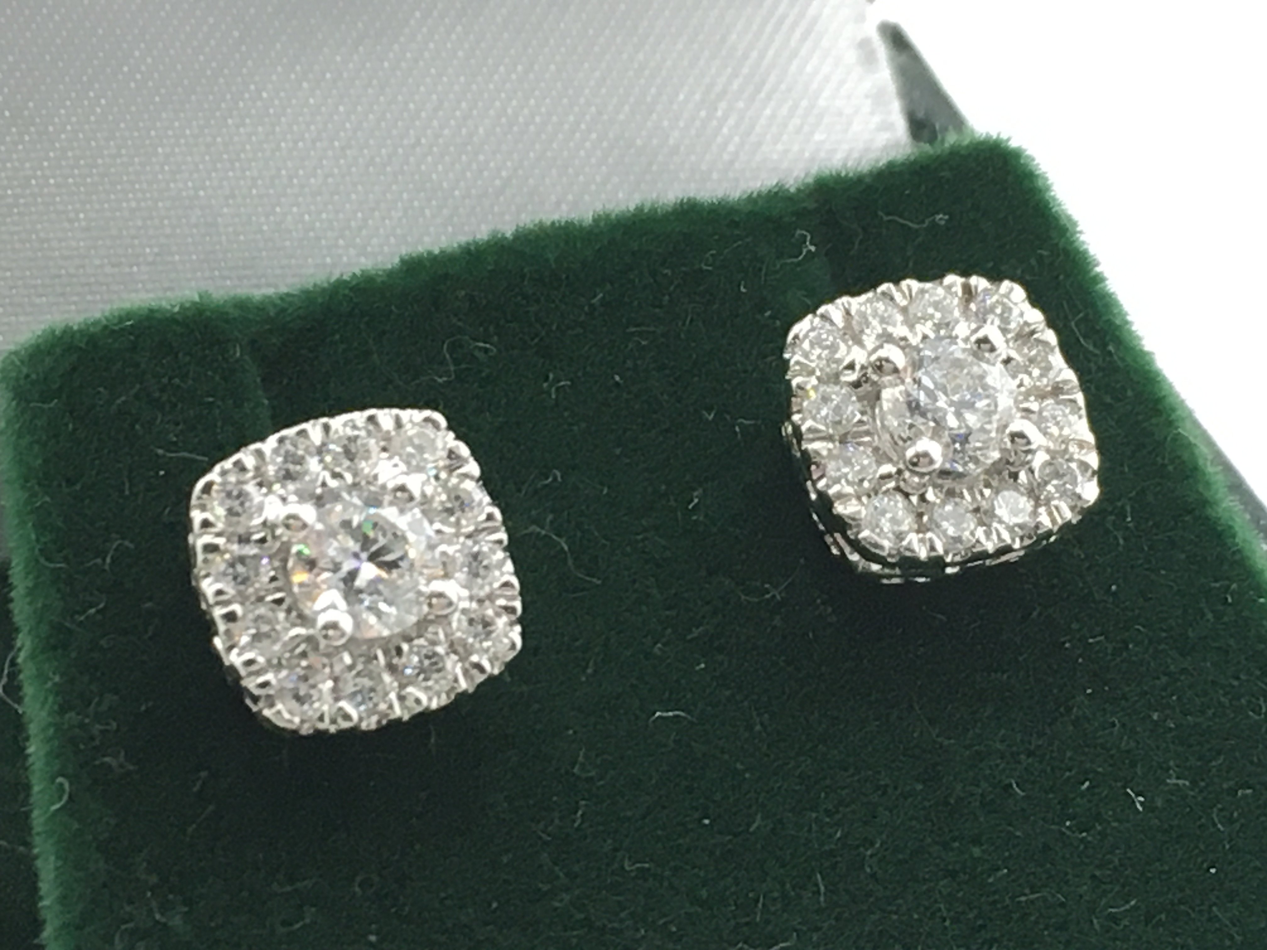 A pair of 14 carat white gold rounded square diamond set cluster studs. RBC diamonds 1.00ct. Total weight 3.2g. Postage category A