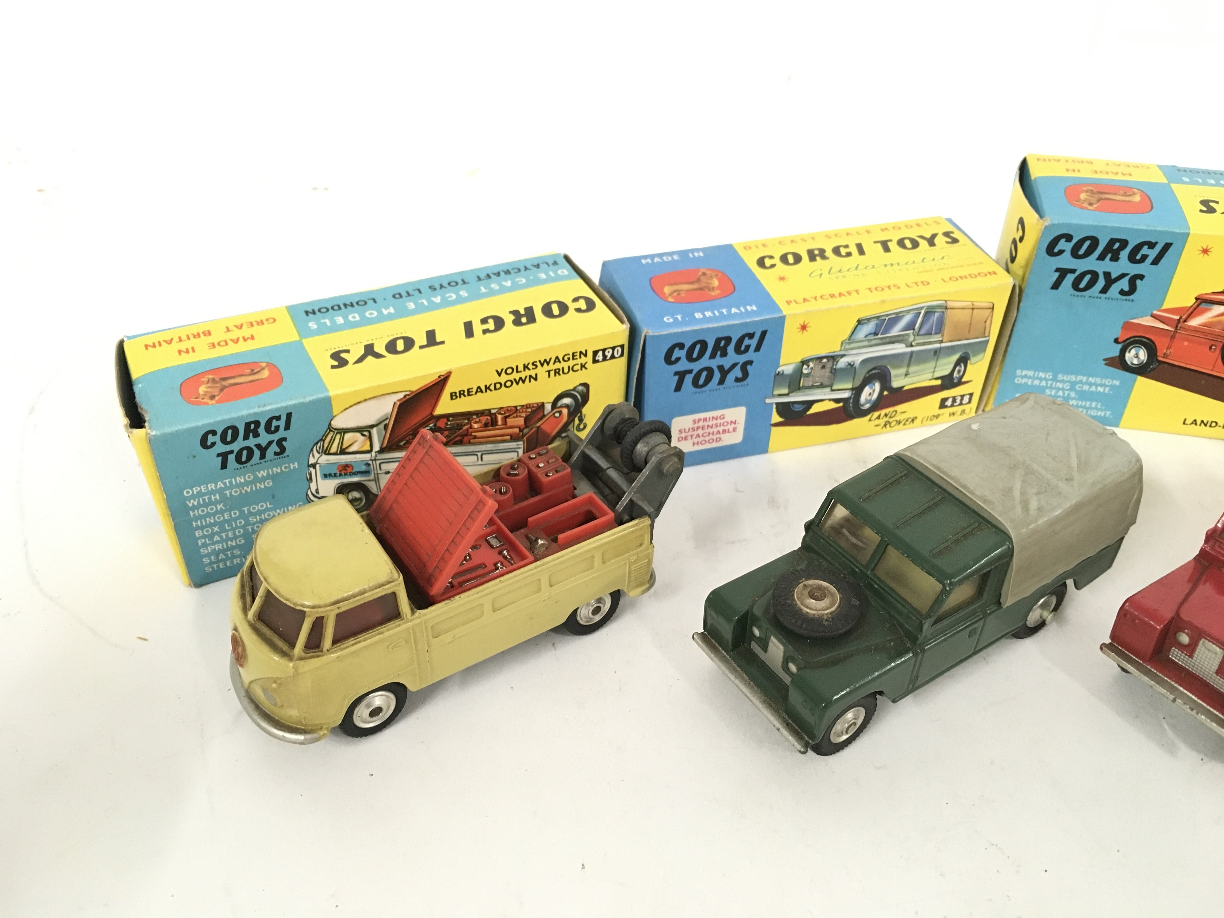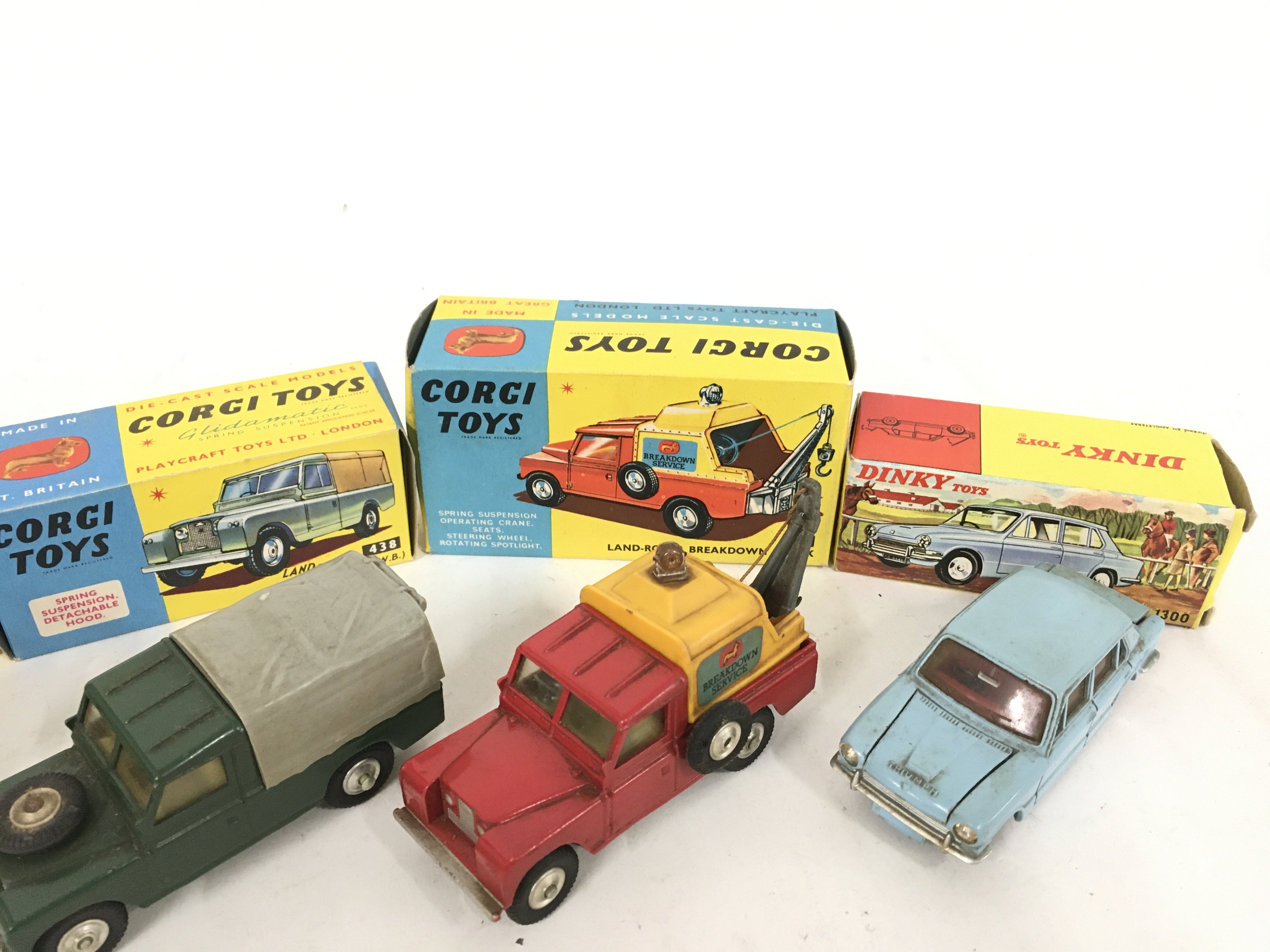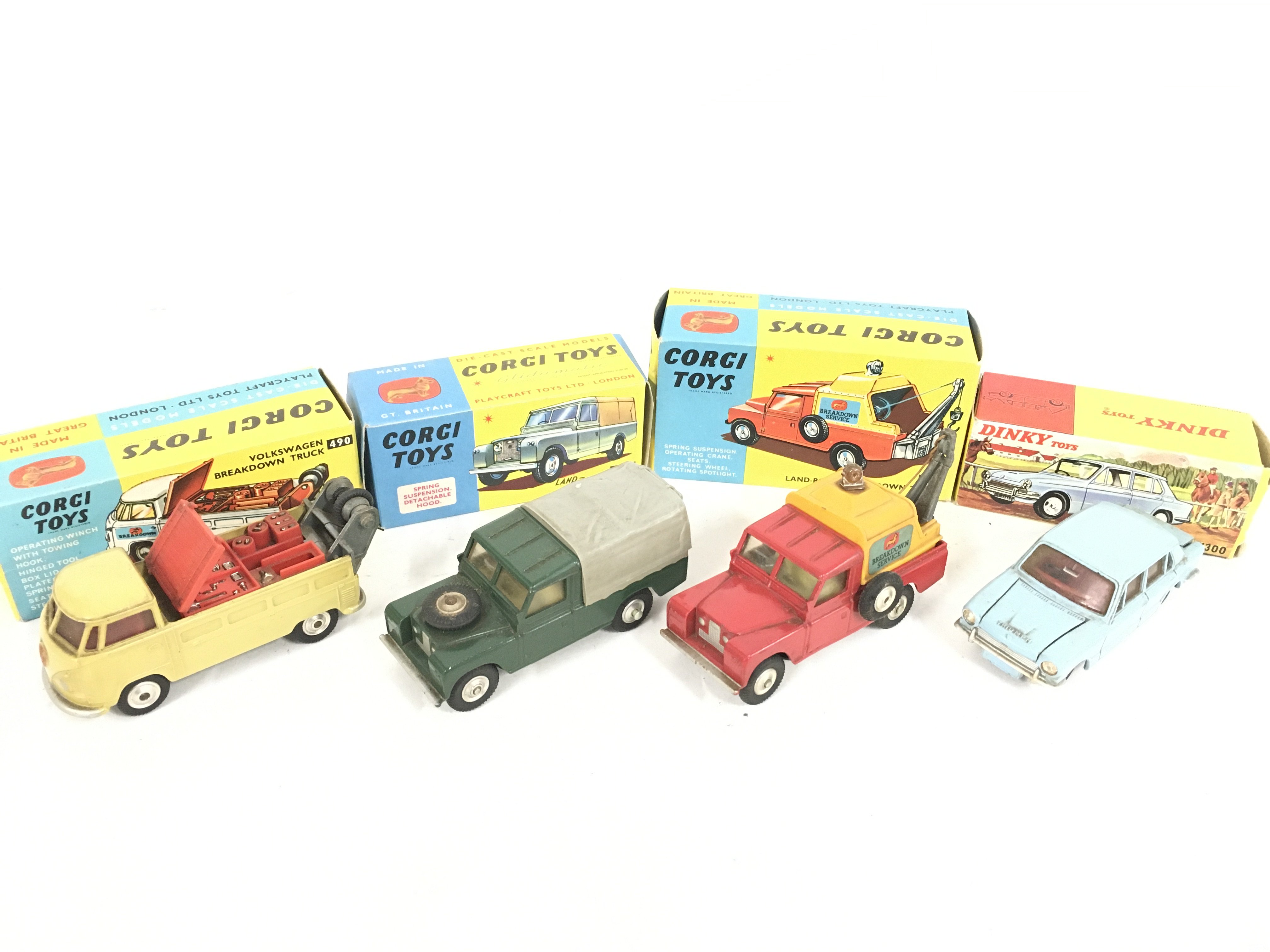 3 Boxed Corgi Vehicles including Volkswagen Breakdown Truck #490 a Land-Rover #438. A Land-Rover Breakdown Truck #477 and A Dinky Triumph 1300 #162.