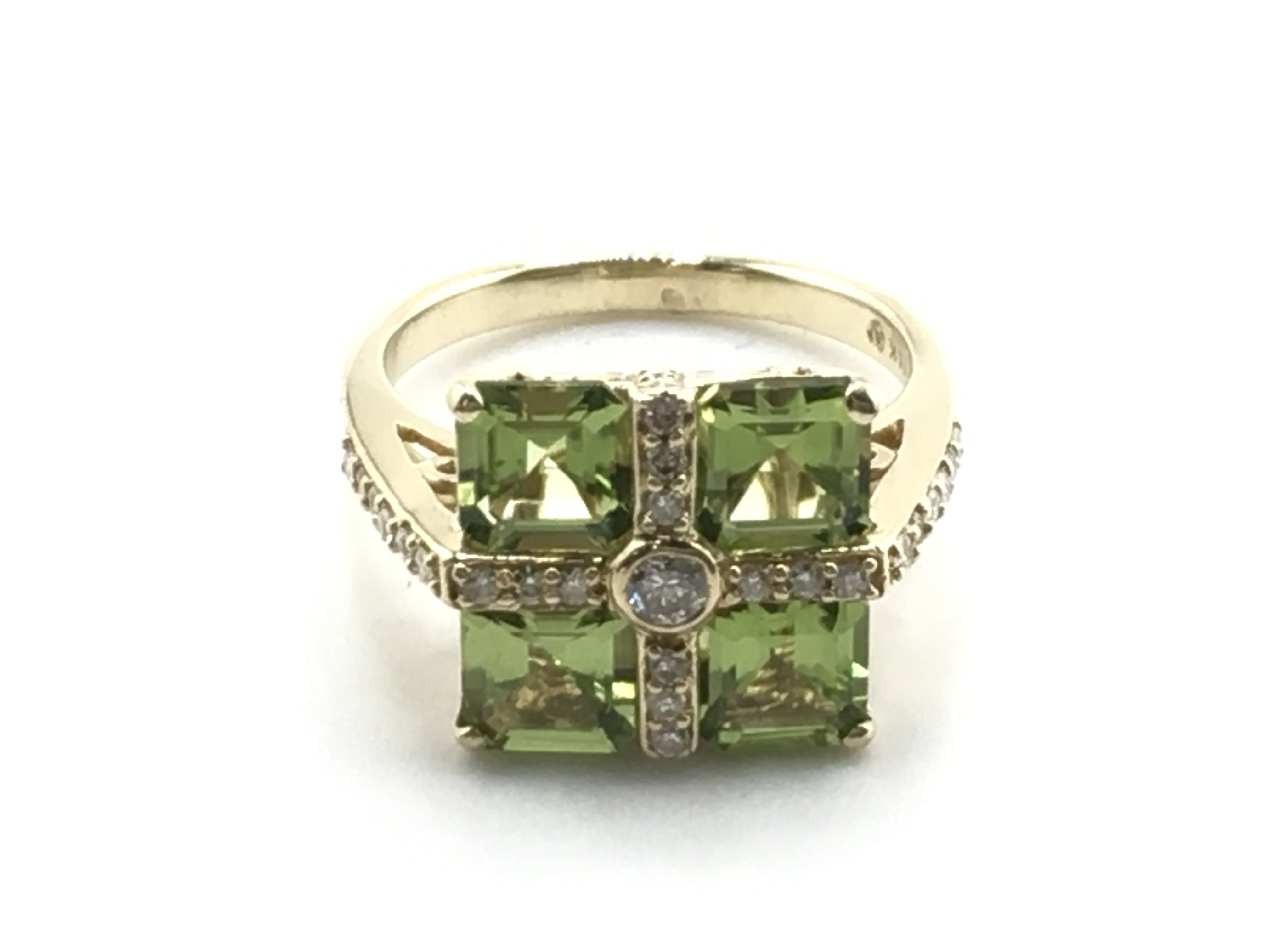 A 14ct yellow gold ring set with four square-cut peridots and RBC diamonds set in a cross pattern, with scroll design collet. Peridots 2.85ct approx, diamonds 0.45ct approx. Size N/O. Total weight 5.4g. Postage category a
