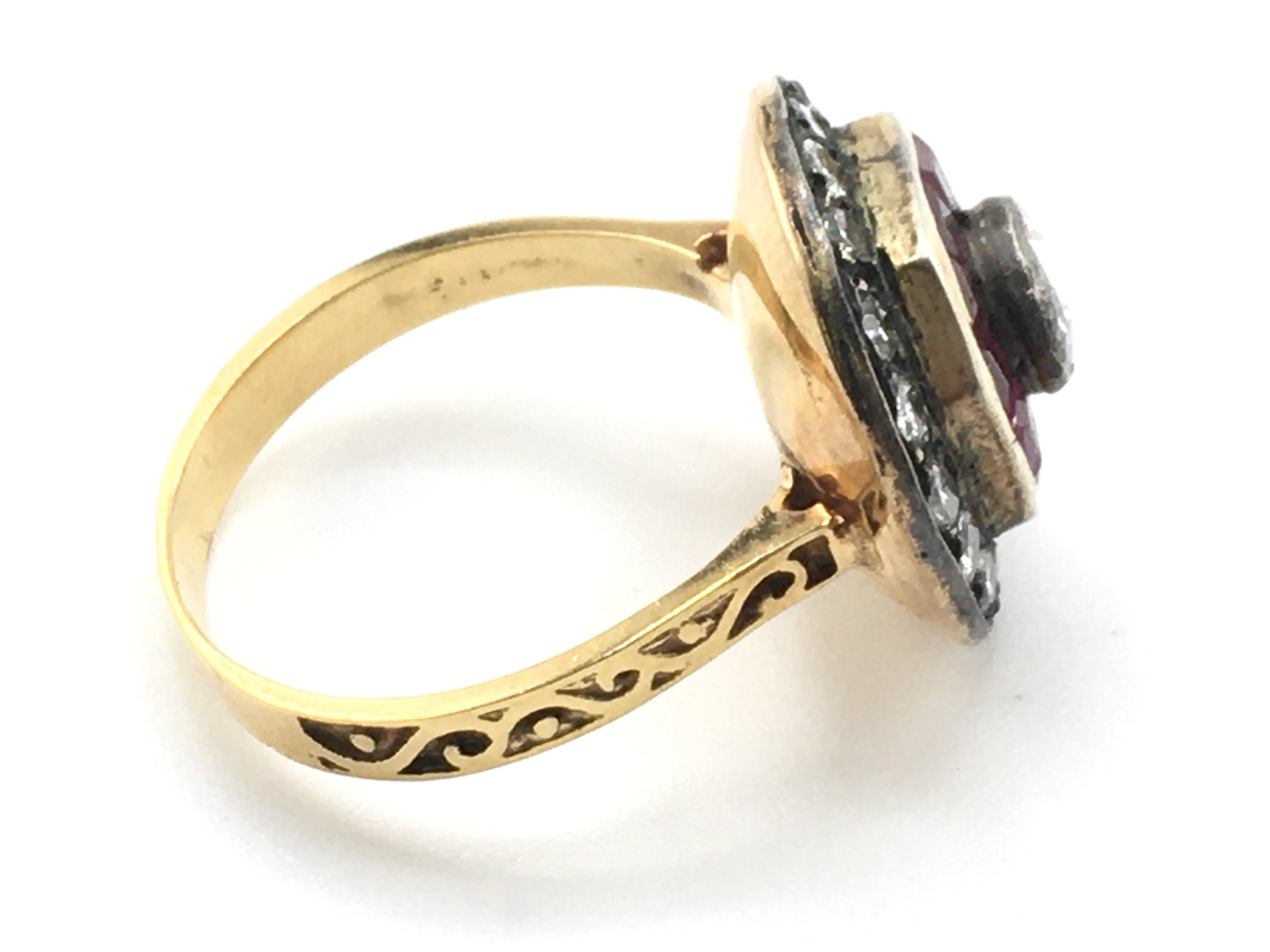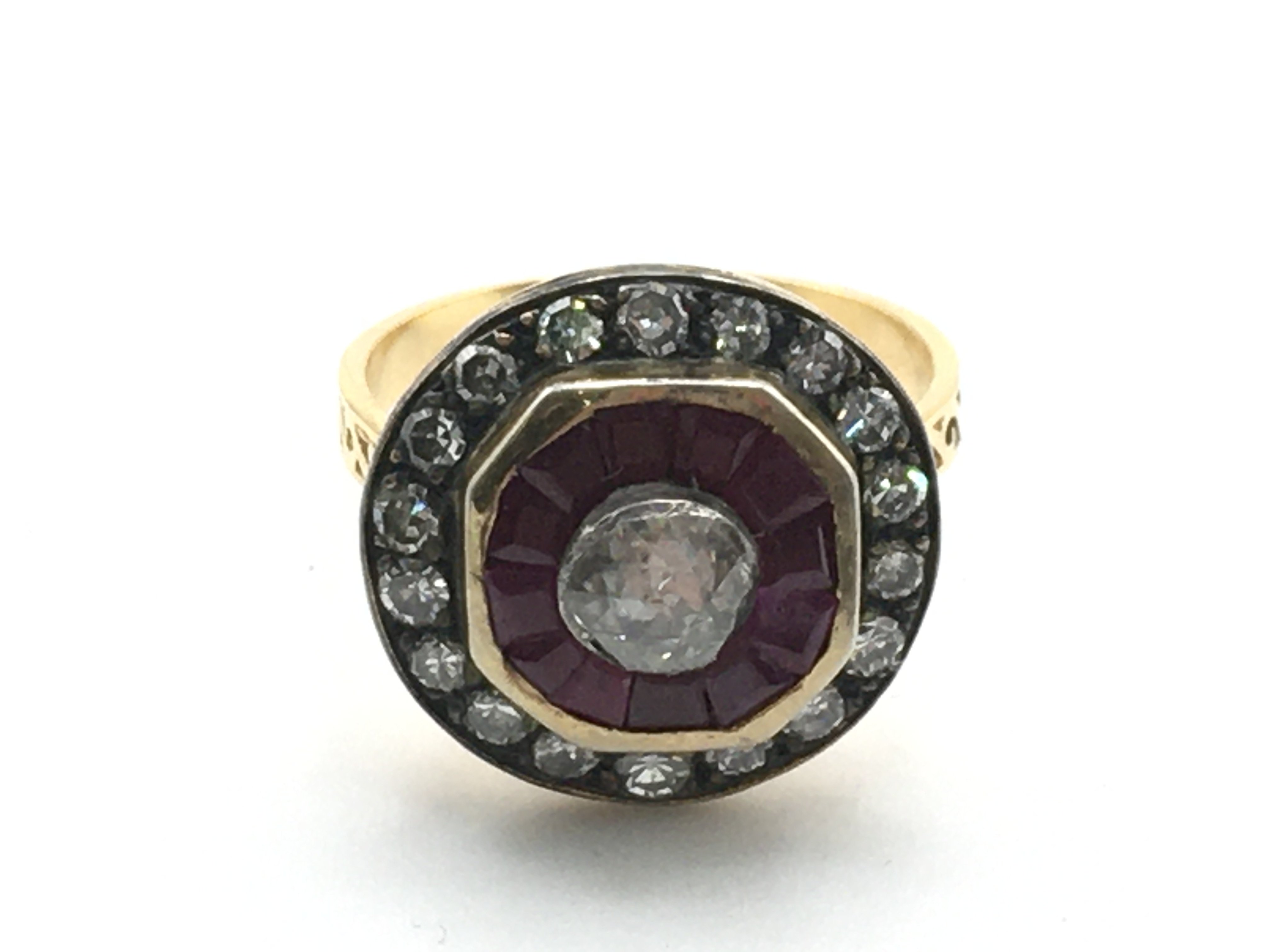 An unmarked hand-made rose gold and silver topped target style cluster ring set with a central rose cut diamond, calibre cut rubies and eight-cut diamonds with patterned shoulders , centre diamond 0.35ct approx. Rubies 0.40ct approx. Eight-cut diamonds 0.40ct approx. Weight 5.9g, ring size O. Postage category A