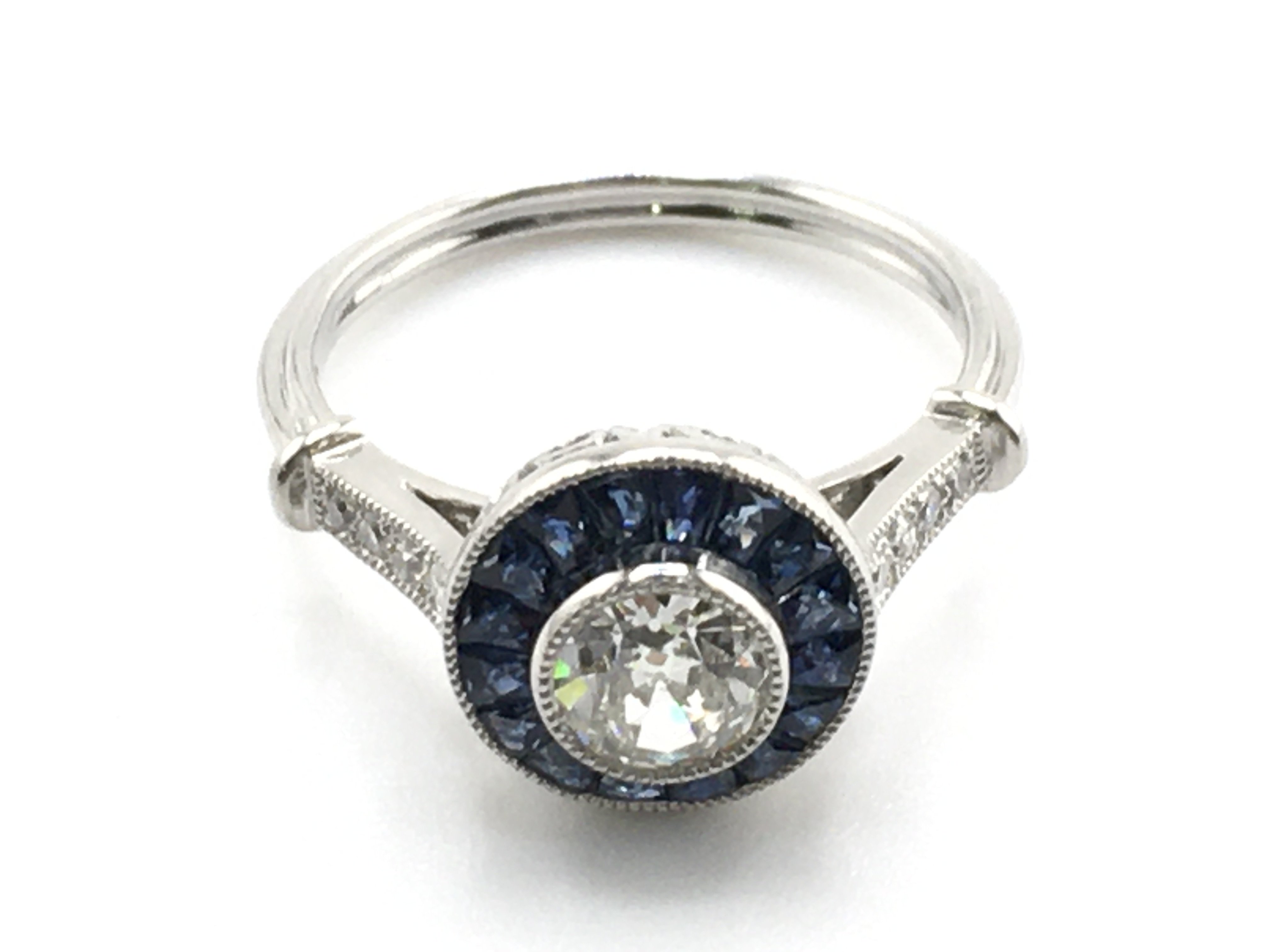 A Platinum target style ring with central old-cut diamond surrounded by calibre cut sapphires in a beaded setting, with further diamonds to the shoulders. Centre diamond 0.56ct. Sapphires 0.60ct. Remaining diamonds 0.07ct. Total weight 4.6g, size M. Postage category A