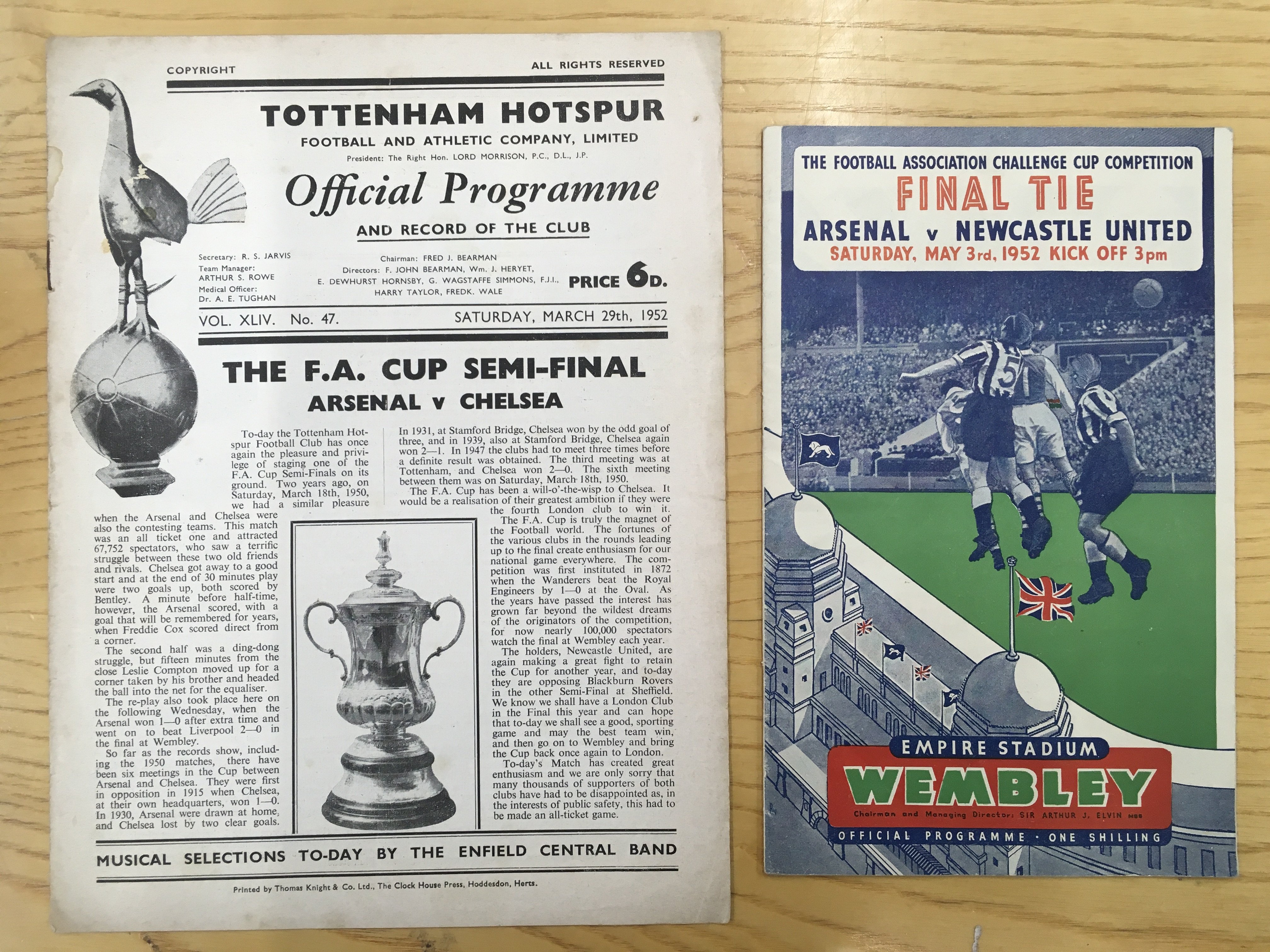 1952 FA Cup Final + Semi Final Football Programme: Arsenal v Newcastle final in excellent condition with no team changes and Arsenal v Chelsea semi final at Tottenham dated 29/3 which is fair. (2)