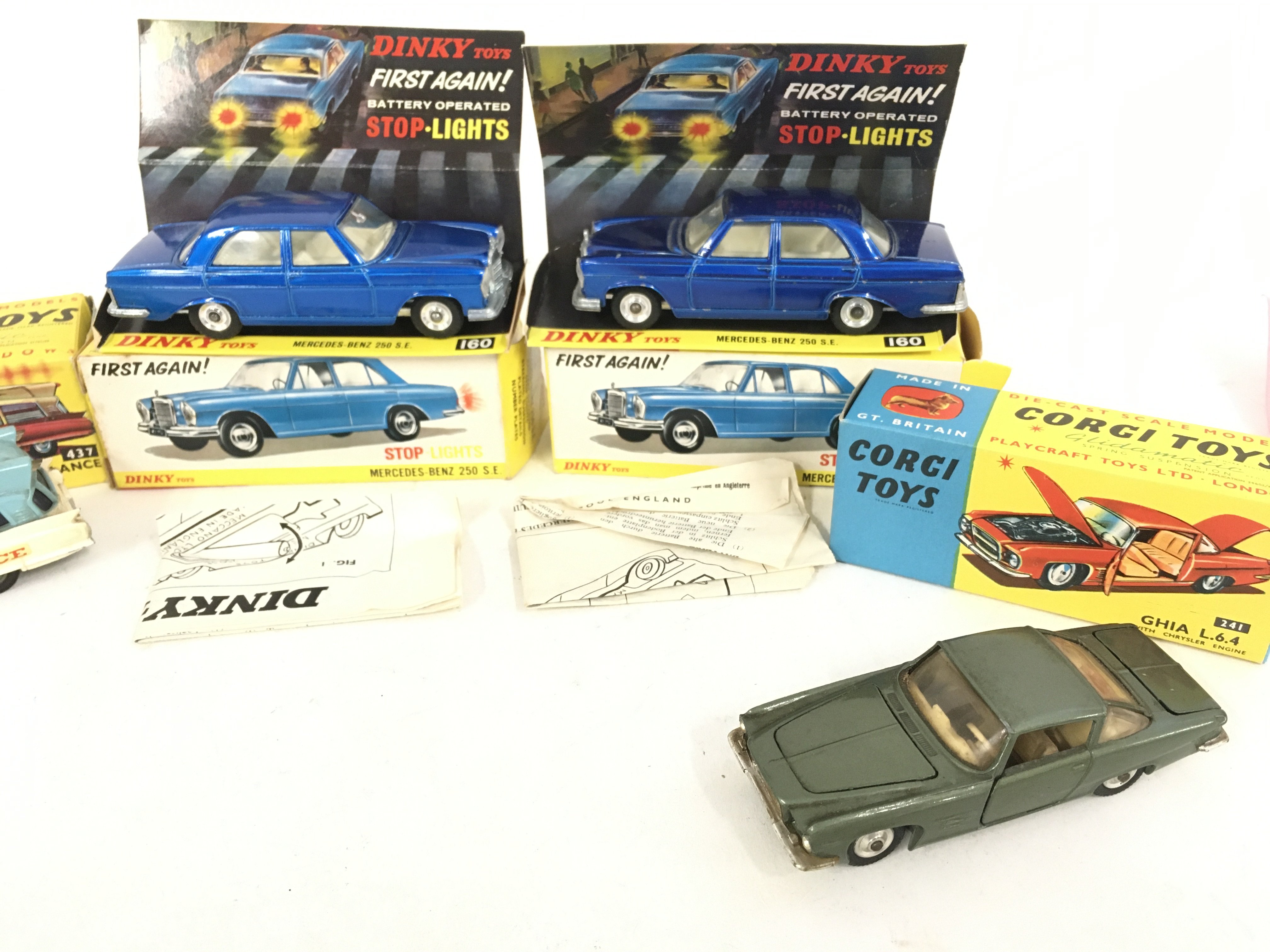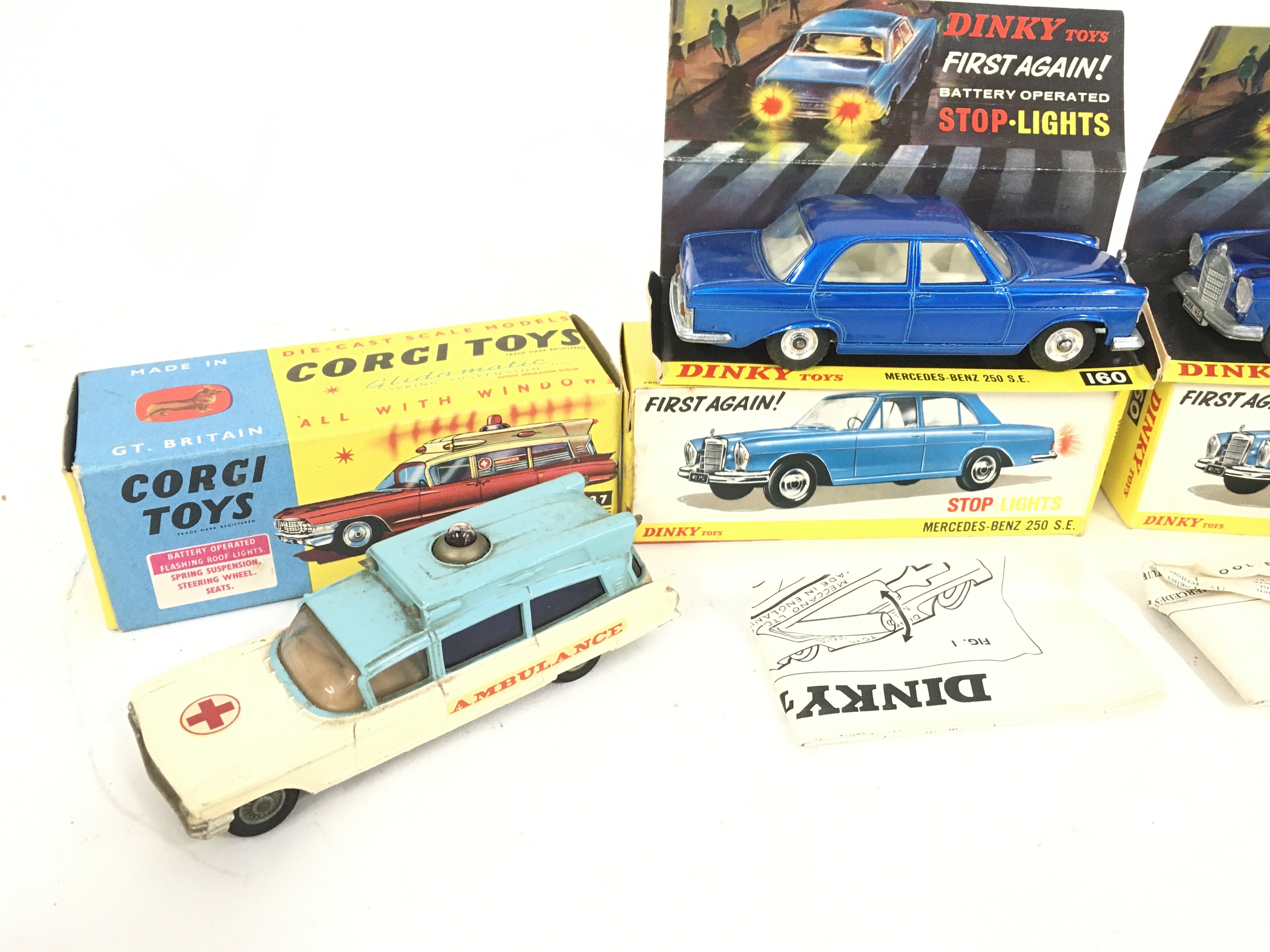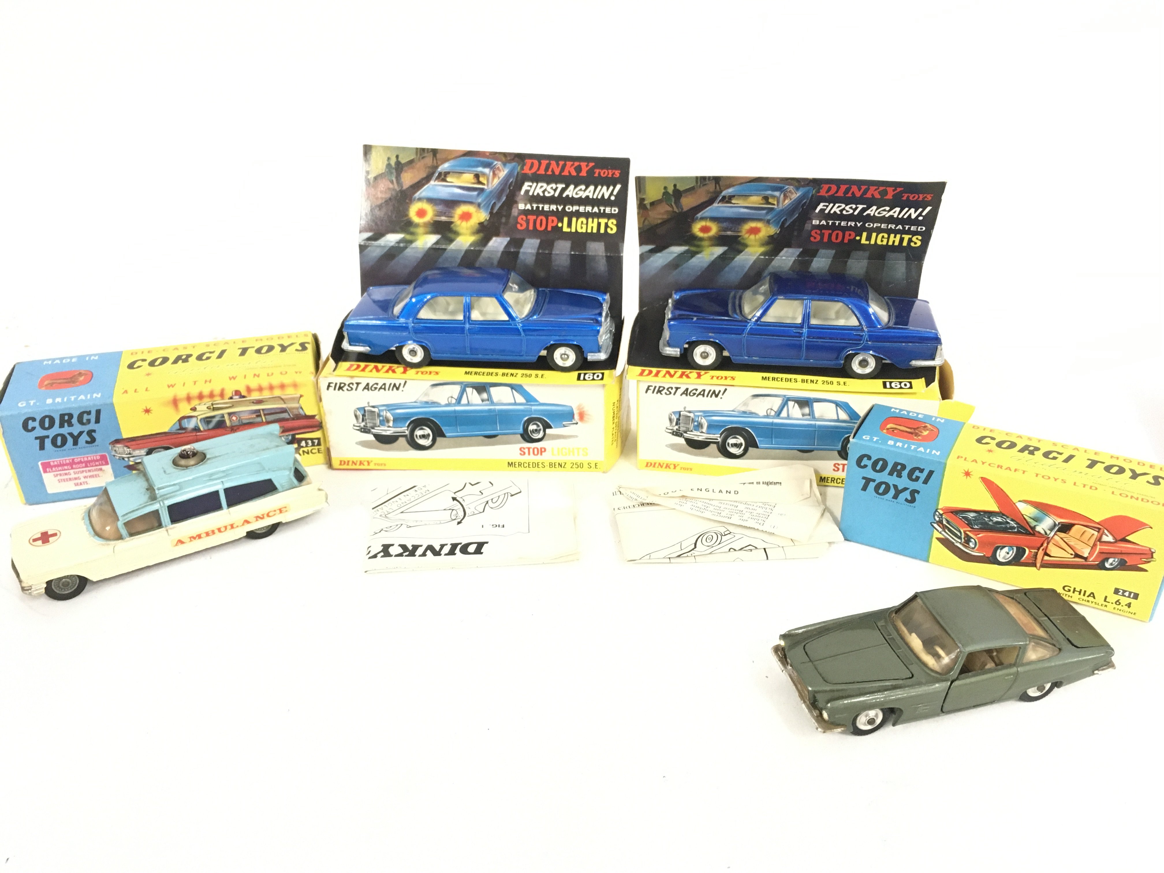 2 X Boxed Dinky Mercedes-Benz 250 S.E. #160 Both Have Battery Covers Missing. A Corgi Superior Ambulance #437 and a Ghia L.6.4 #251.