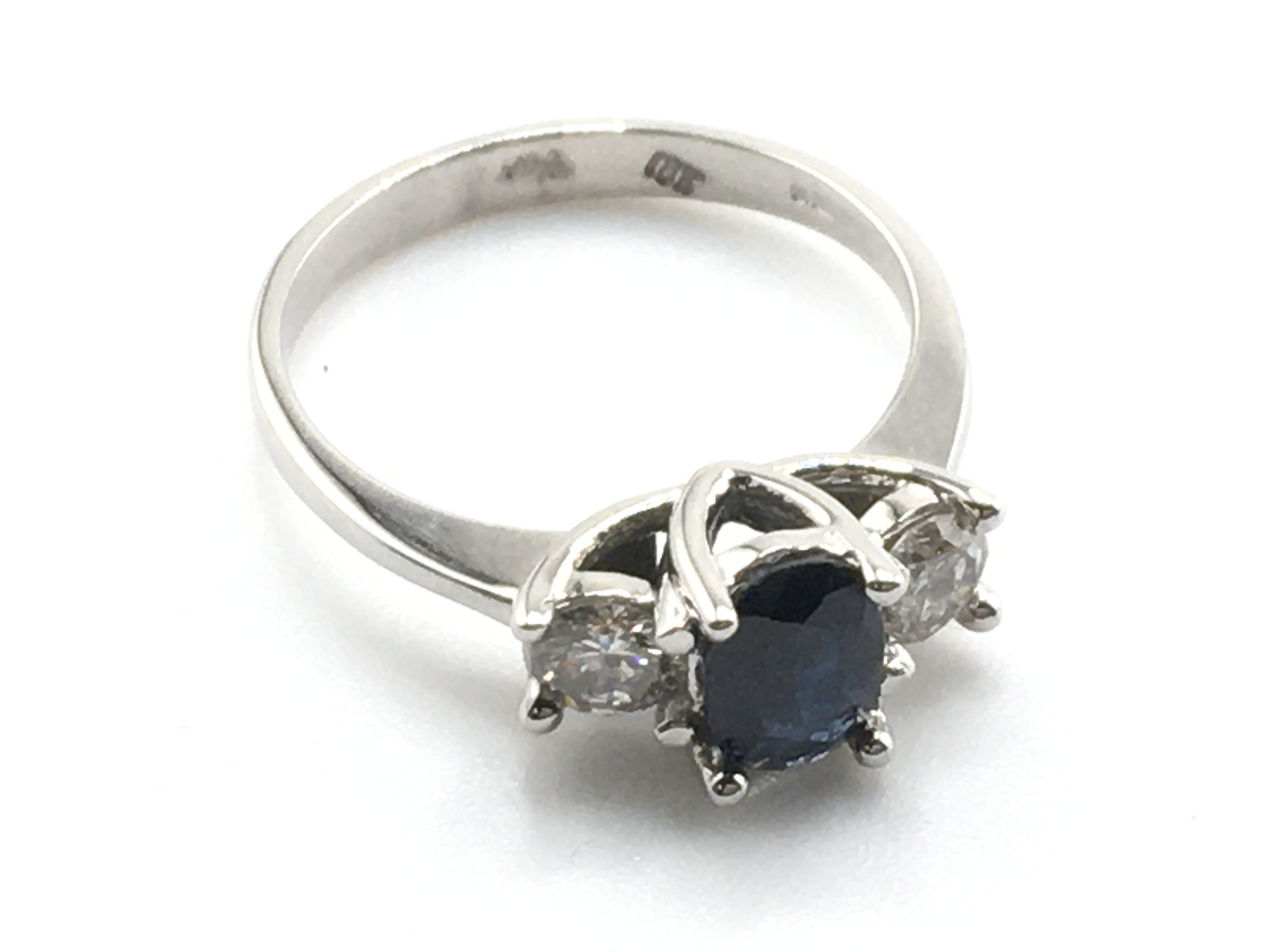 An 18ct white gold oval-cut sapphire and RBC diamond trilogy ring. Sapphire 0.85ct approx. Diamonds 0.40ct approx. Ring Size M/N. Ring weight 3.6g. Postage category a