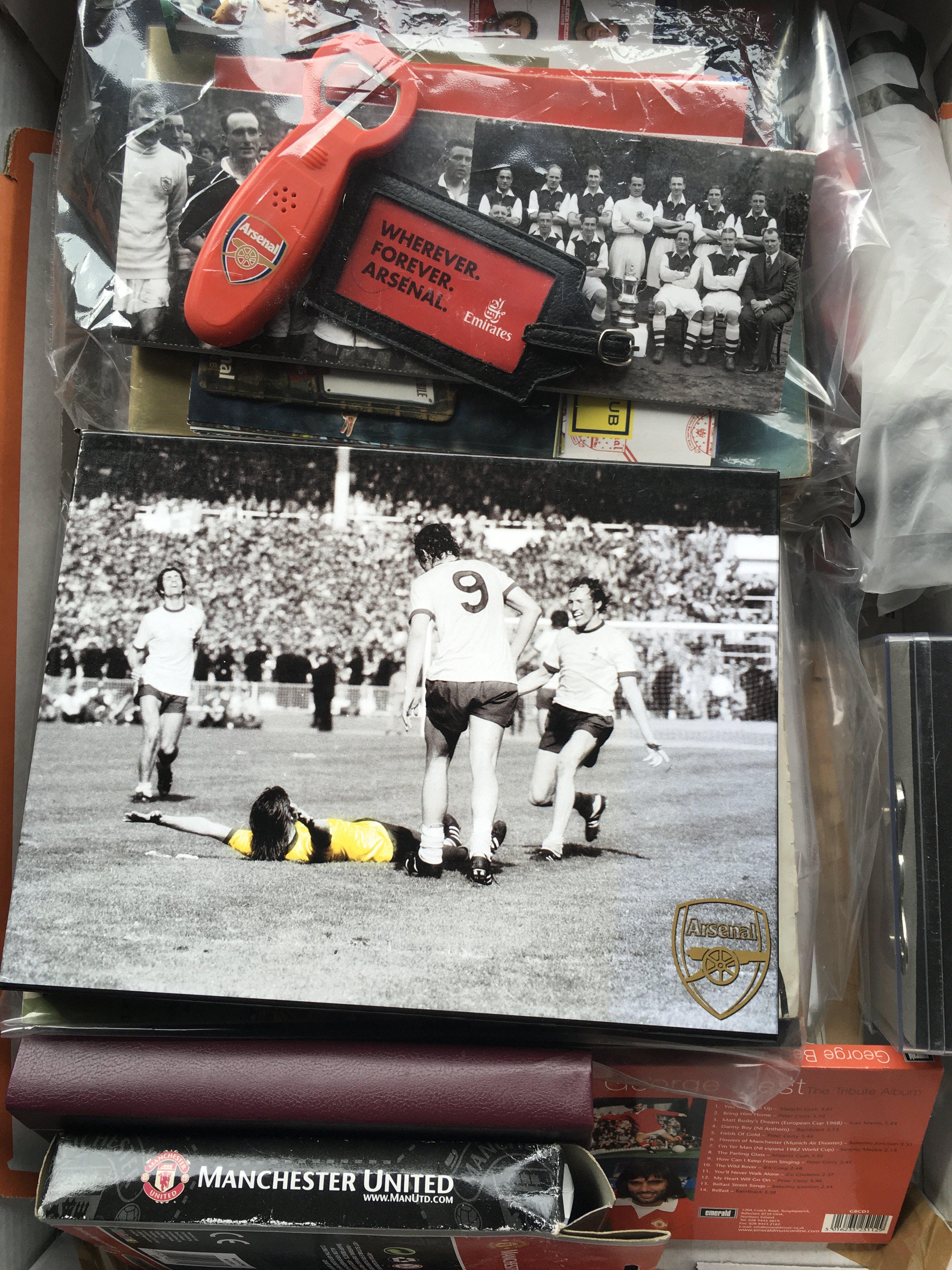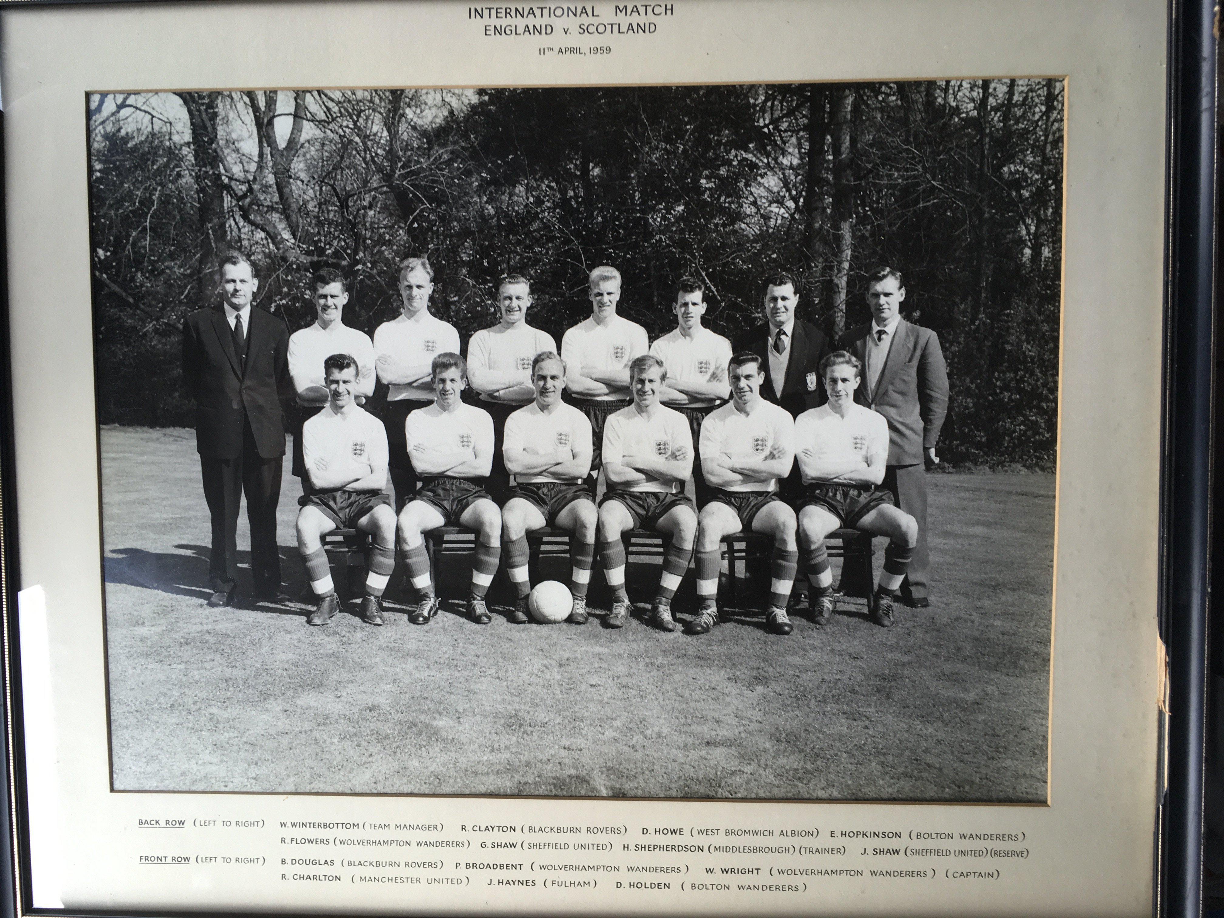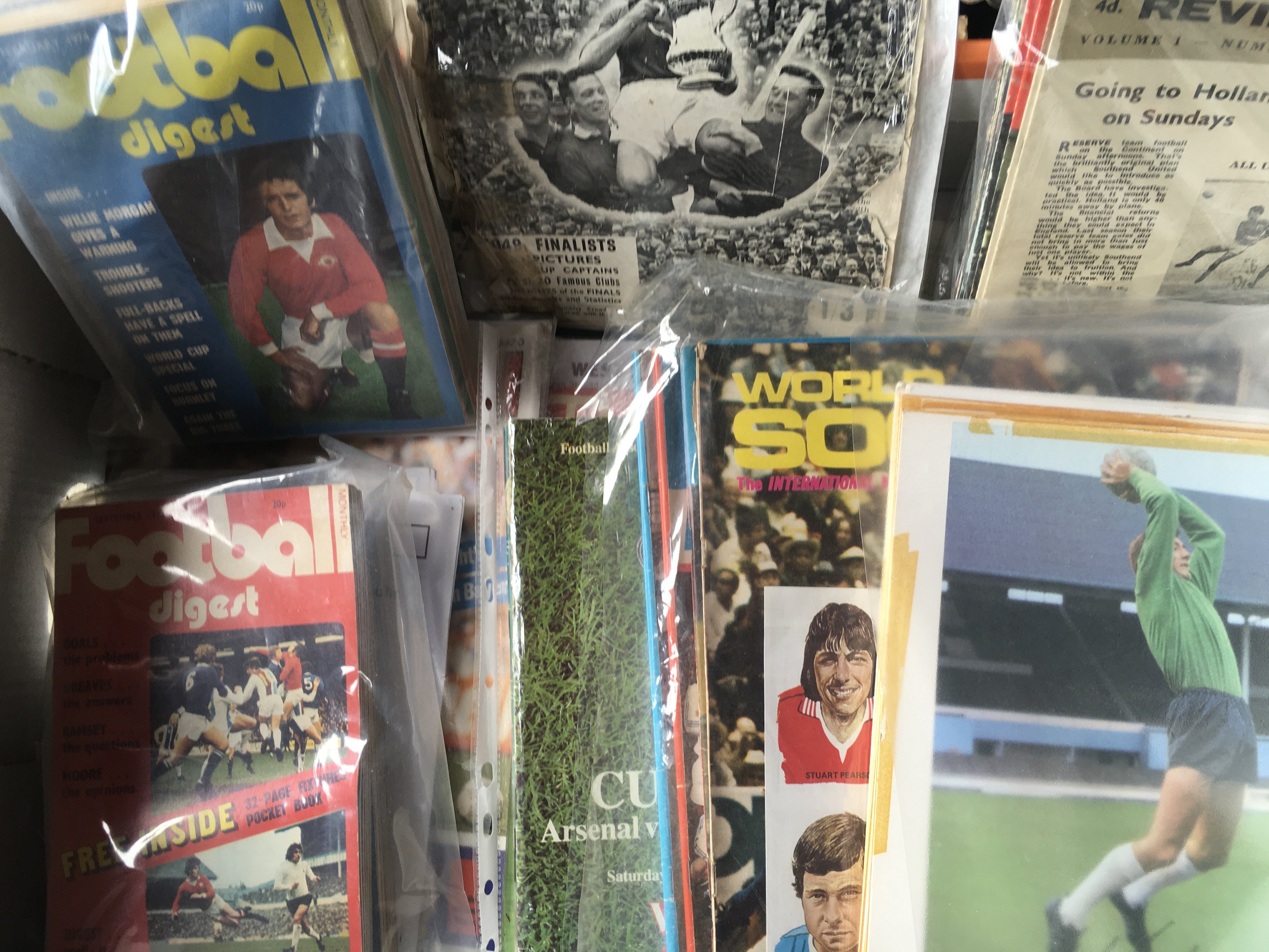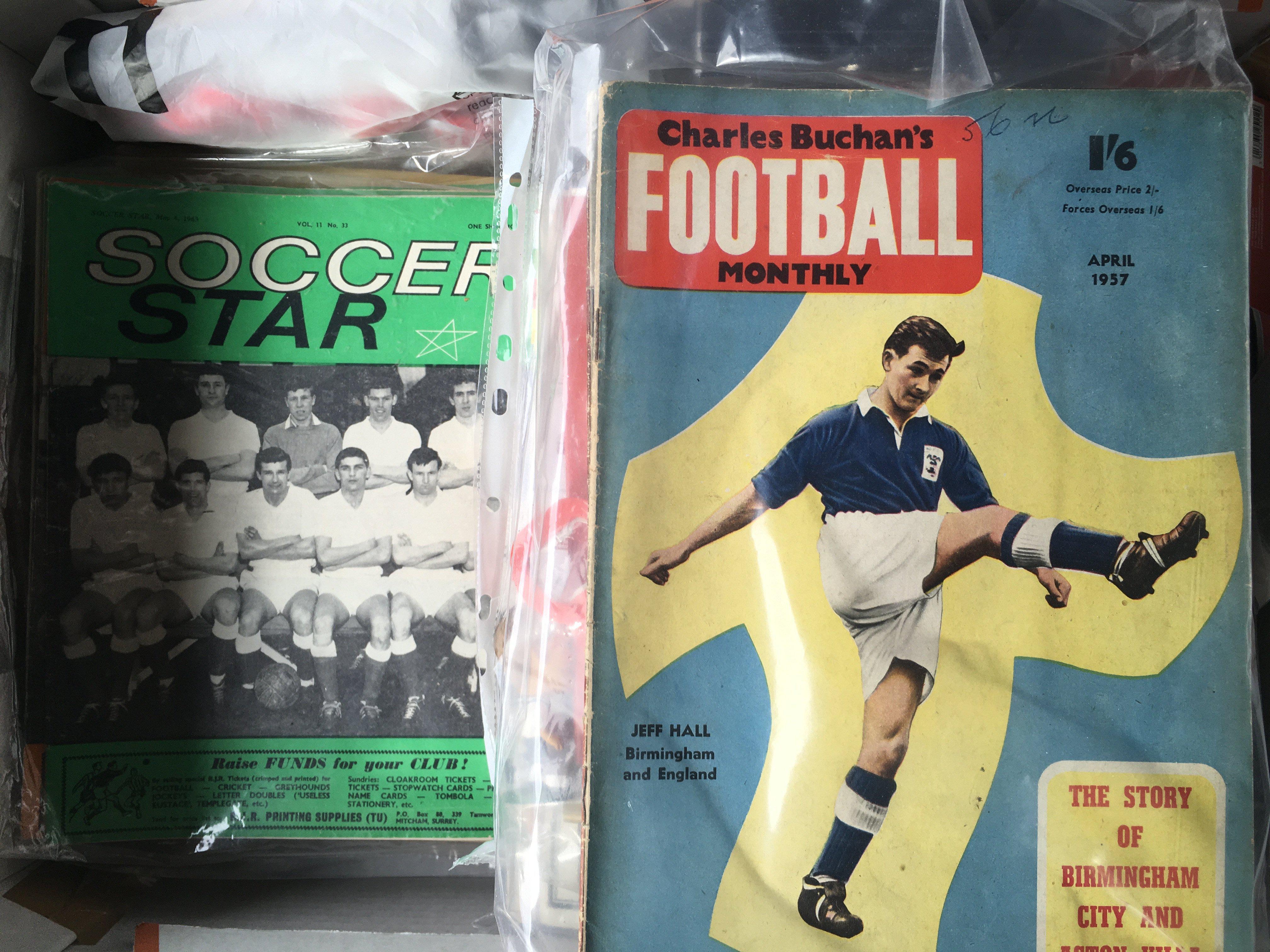 Miscellaneous Football Memorabilia Box: Includes coin sets, reserve sheets, Typhoo cards, wall charts, World Soccer Magazines, FA Cup brochures and much more. There is an original large framed 1959 England team group for match v Scotland removed from training ground in poor frame. Not for posting.