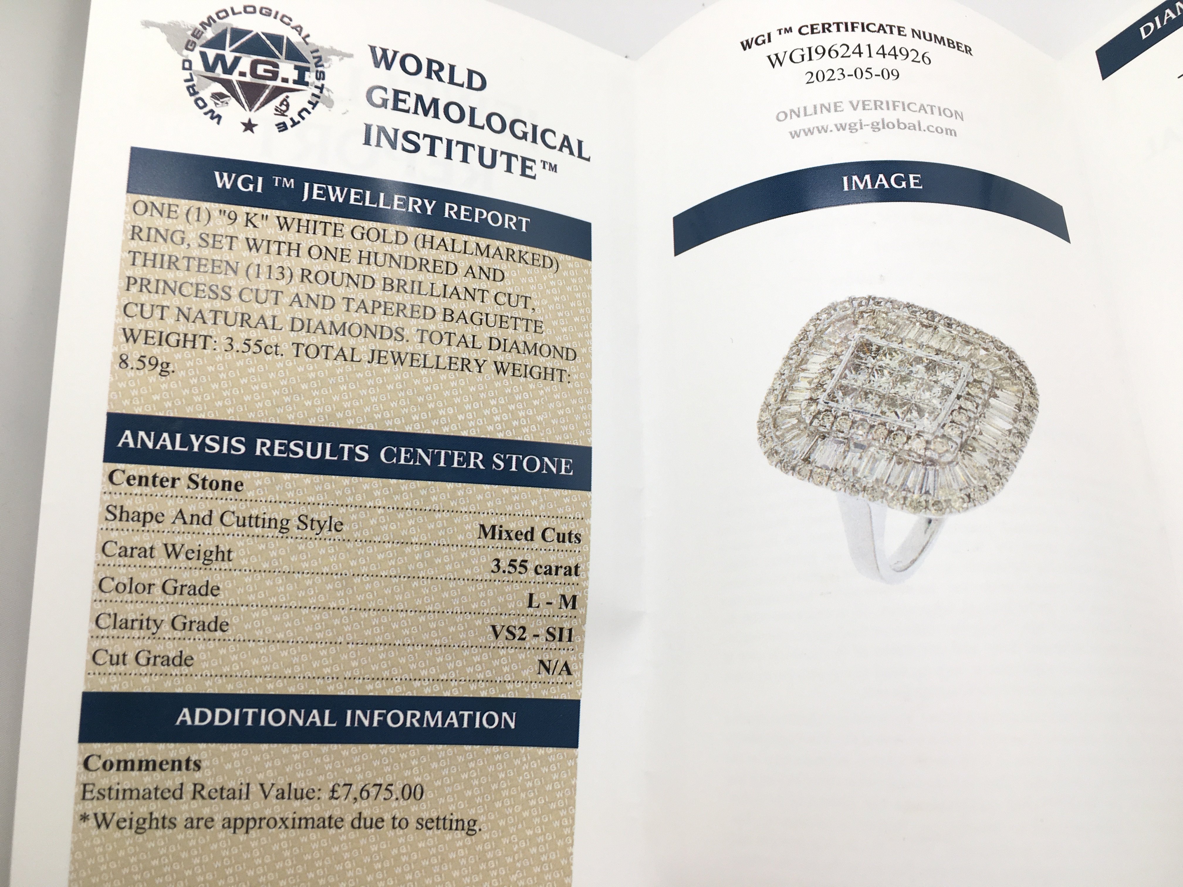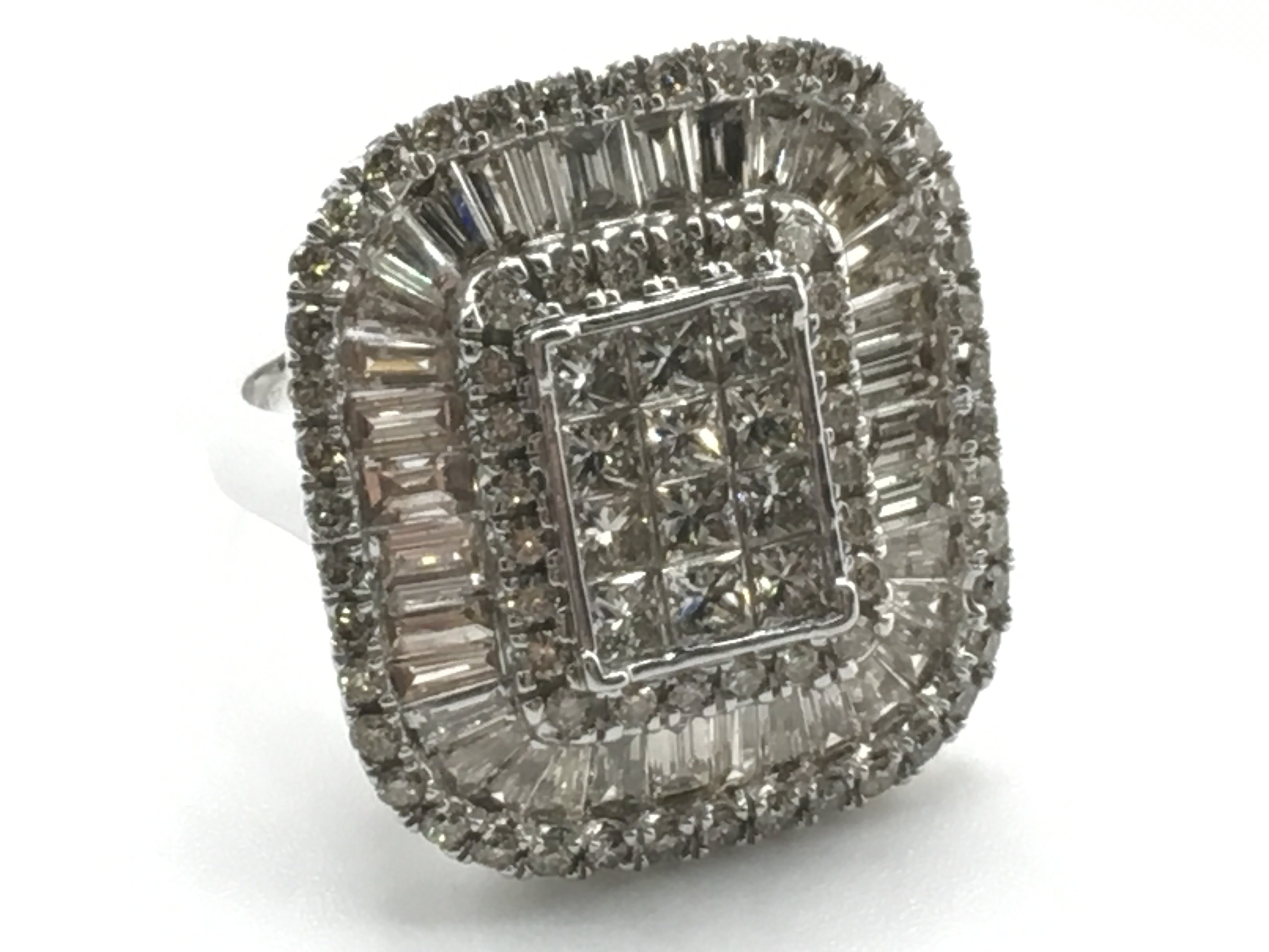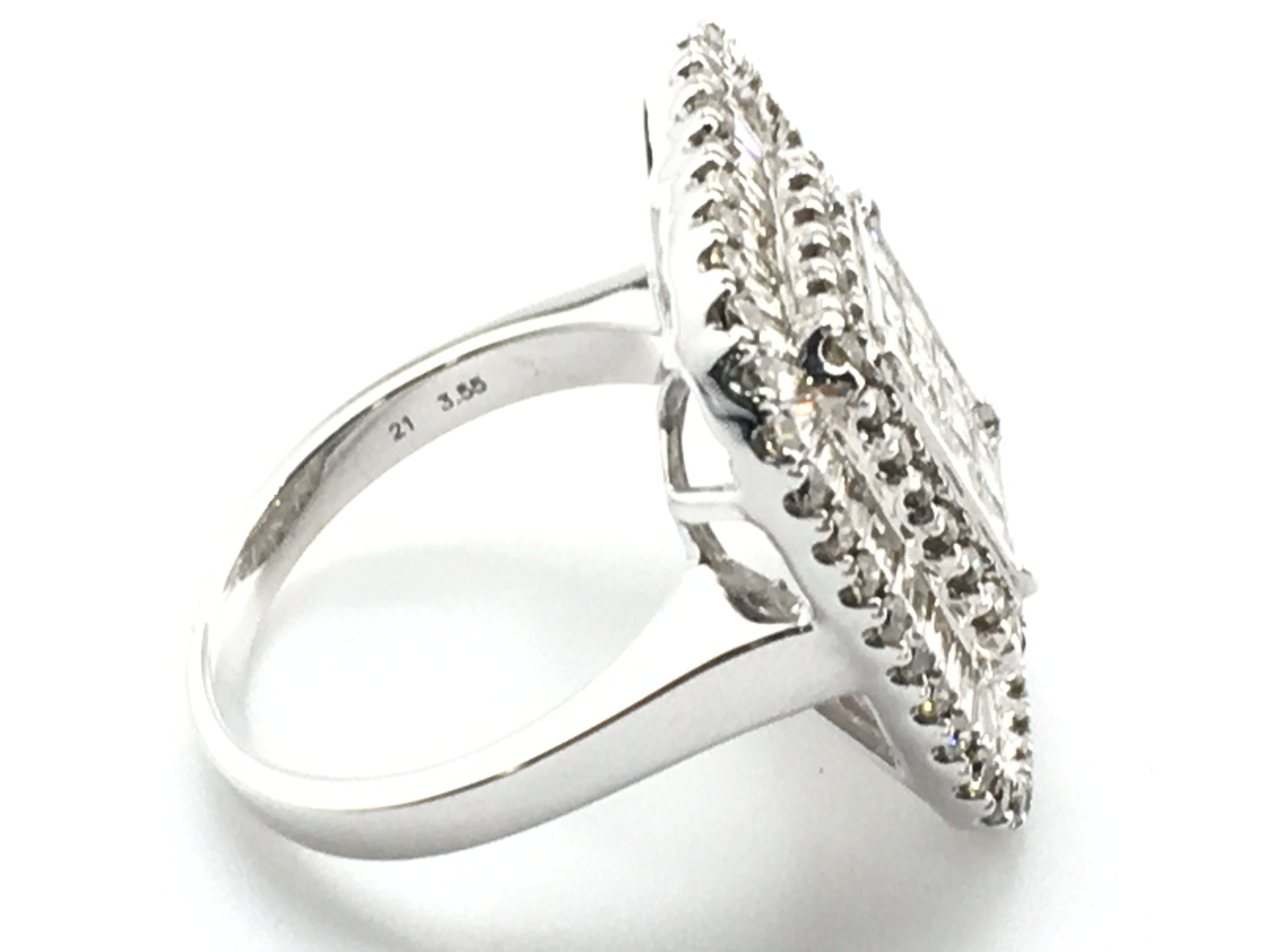 A certificated large 9ct white gold cocktail ring set with baguette and RBC diamonds. Diamonds 3.55ct. Cer no. WGI9624144926. Size N. Ring weight 8.7g. Postage category A