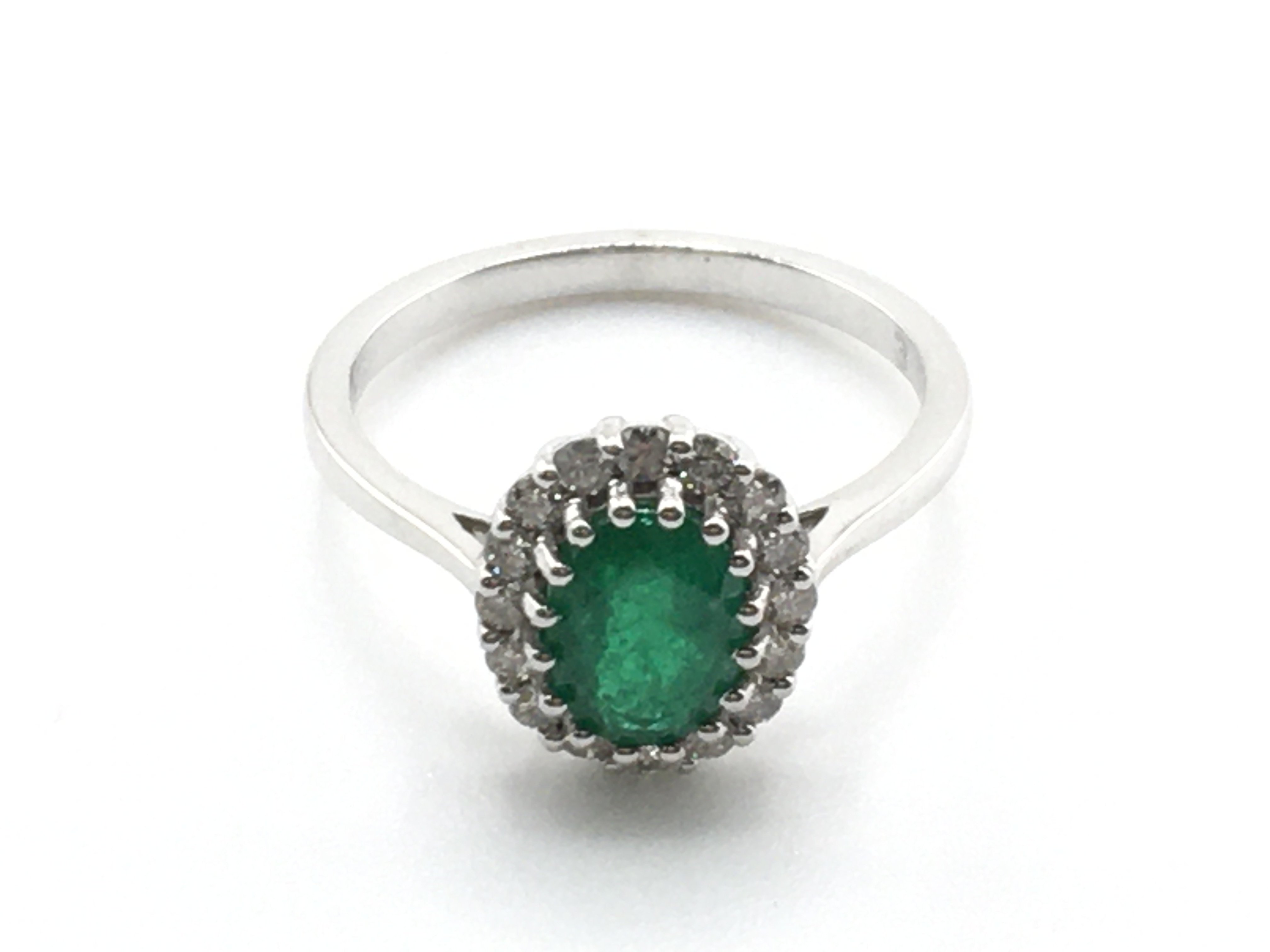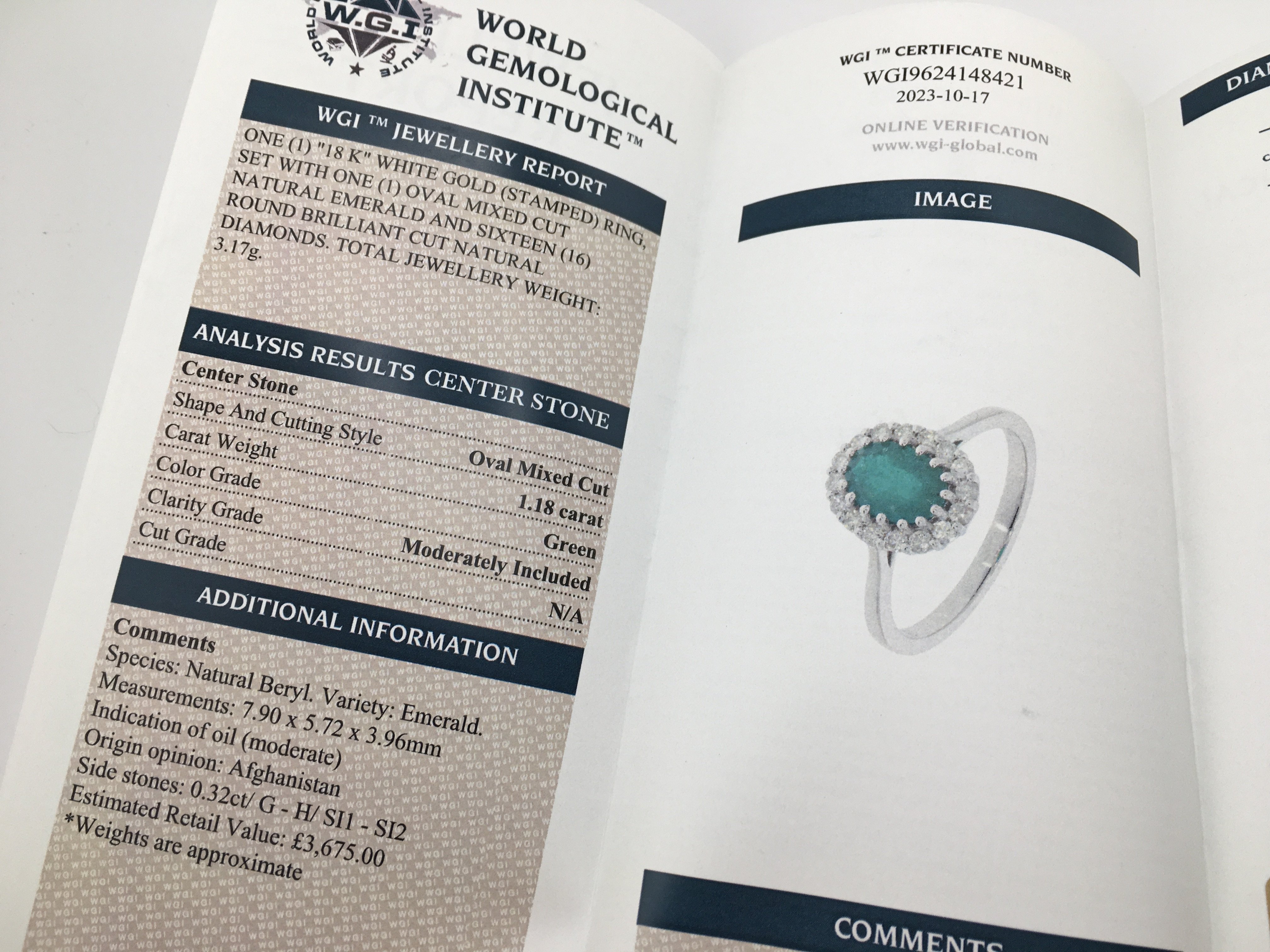 A certificated 18ct white gold emerald and diamond cluster ring, oval-cut diamond 1.18ct. RBC diamonds 0.32ct. Cert no. WGI9624148421. Size N. weight 3.2g. Postage category A