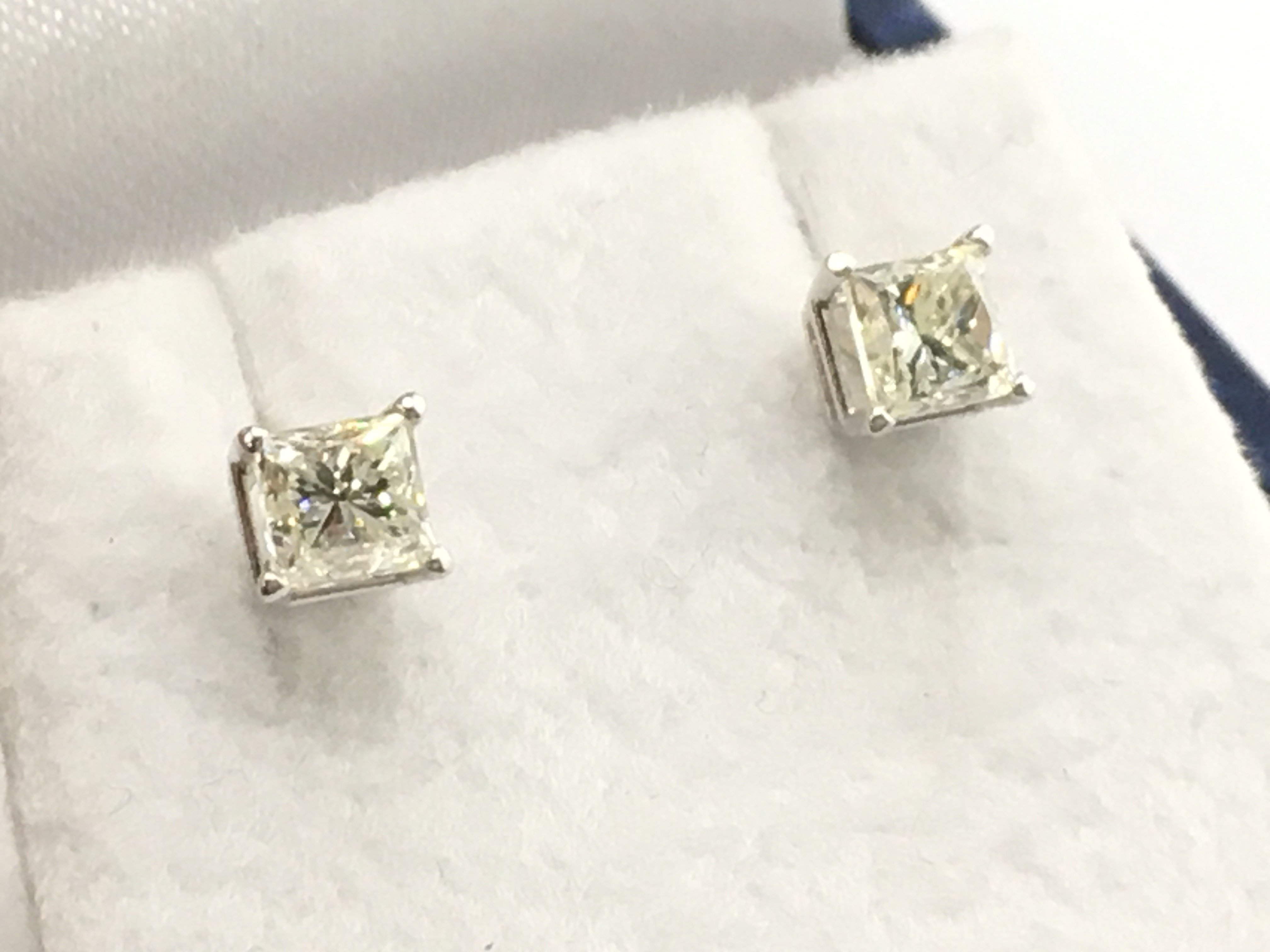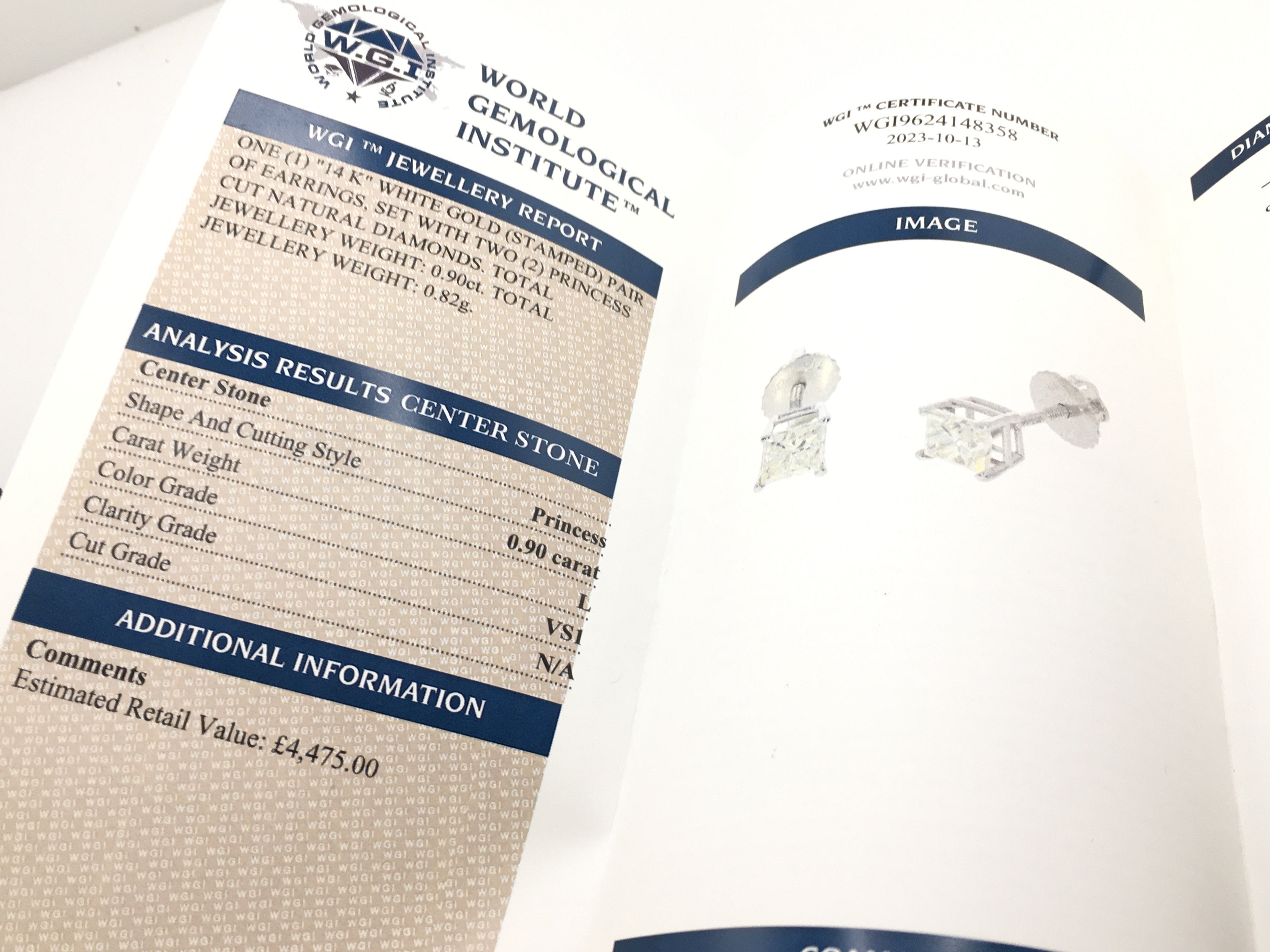 A certificated pair of 14ct white gold princess cut diamond solitaire studs with screw back butterflies, boxed. Diamonds 0.90ct/ VS. Cert no.WGI9624148358. Total weight 0.8g. Postage category A