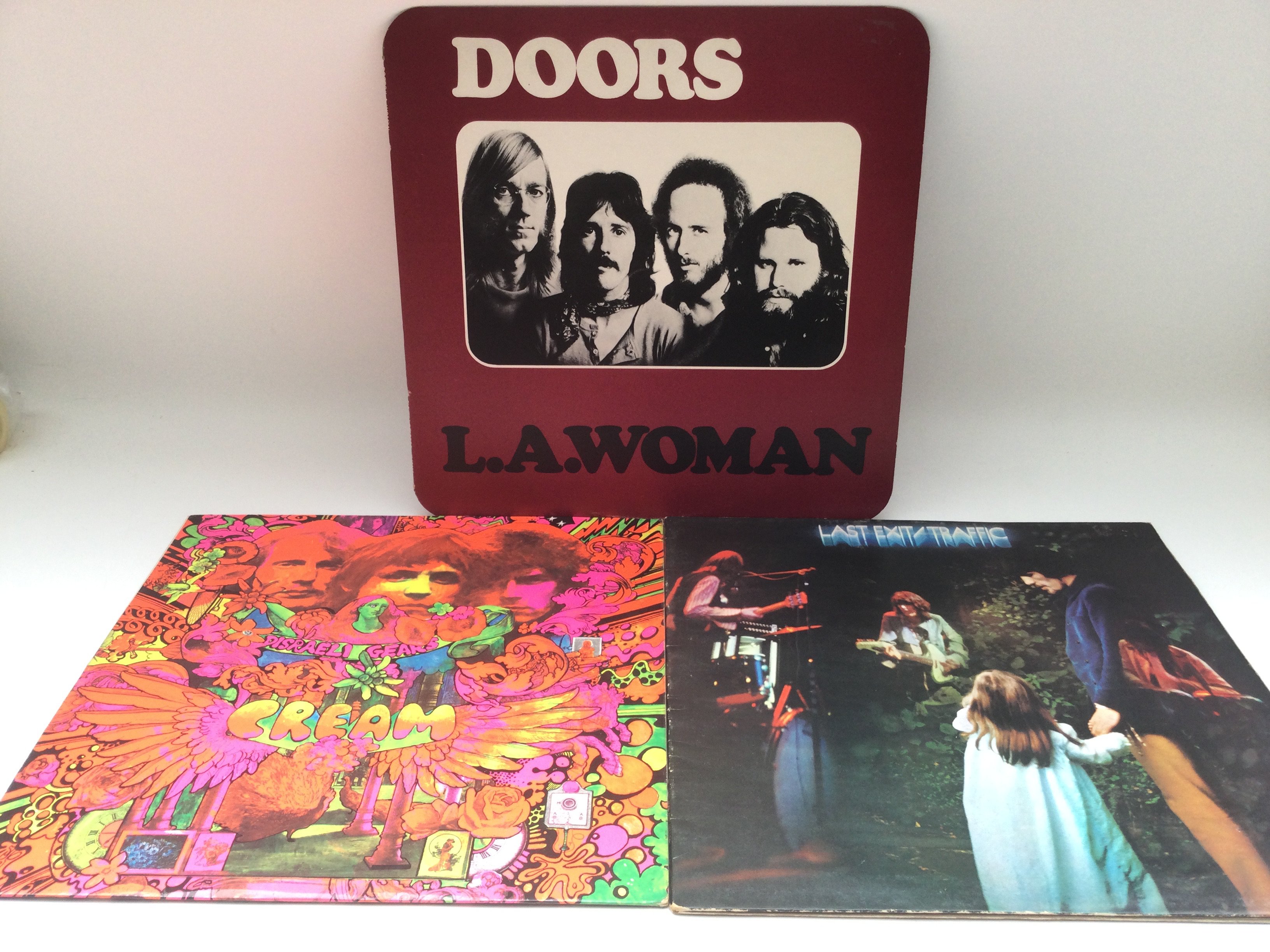 A first UK pressing of 'Last Exit' by Traffic, 'Disraeli Gears' by Cream and 'L.A. Woman' by The Doors. Condition generally Ex.