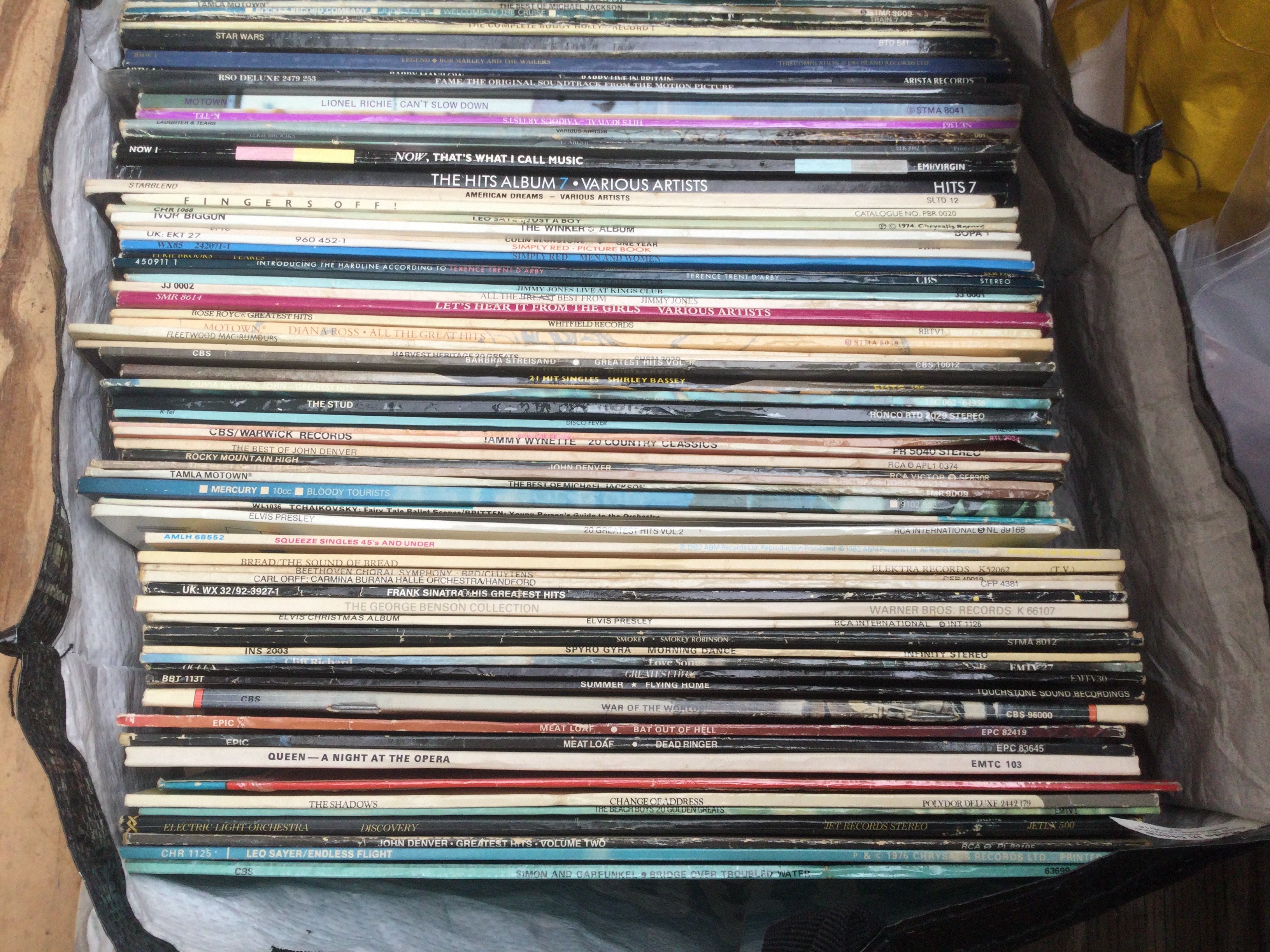 A bag of LPs by various artists including Queen, Meat Loaf, Bob Marley and others.