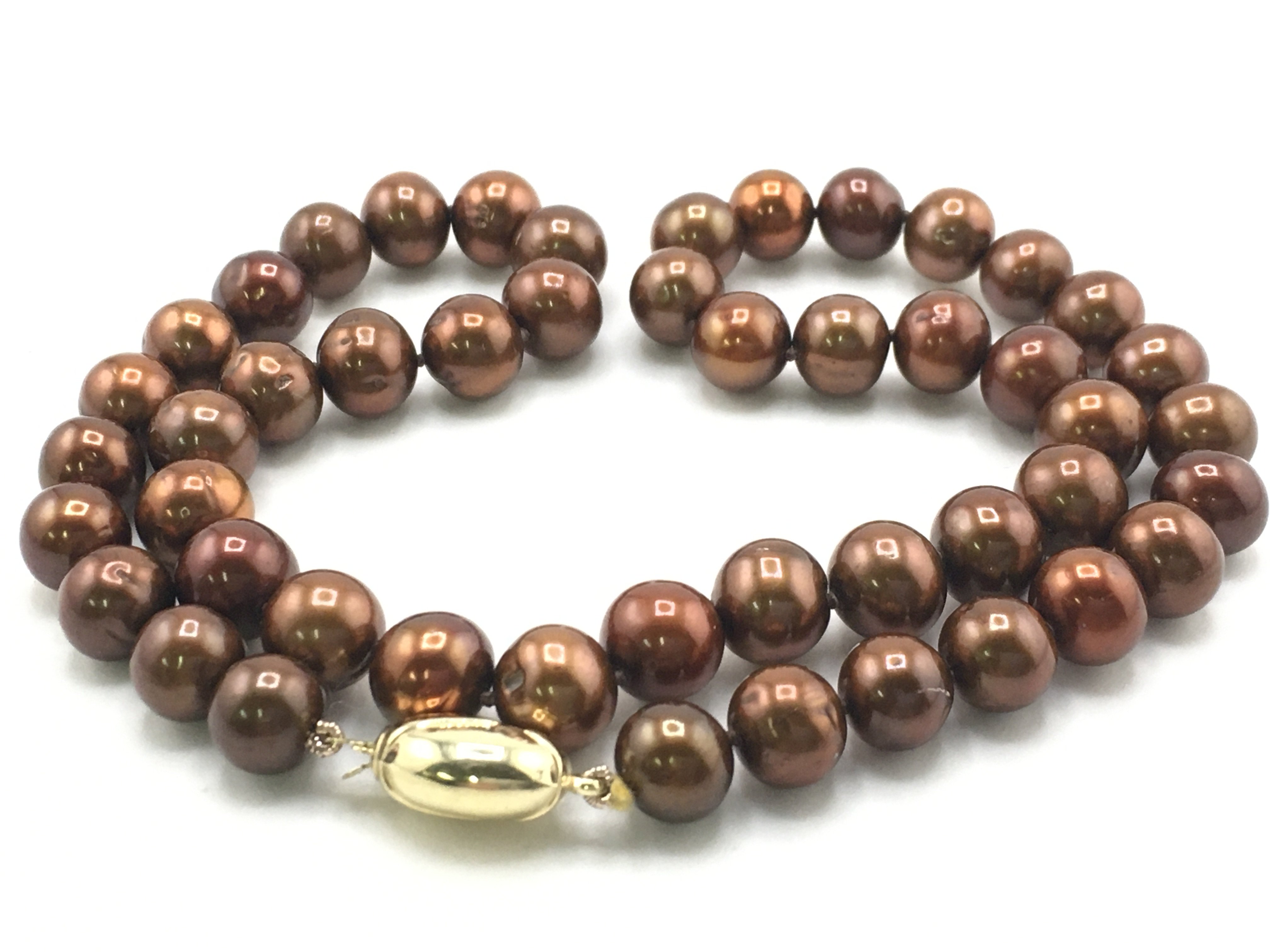 A necklace strung with cocoa freshwater cultured pearls, with a 9ct yellow gold coffee bean clasp. Postage category A