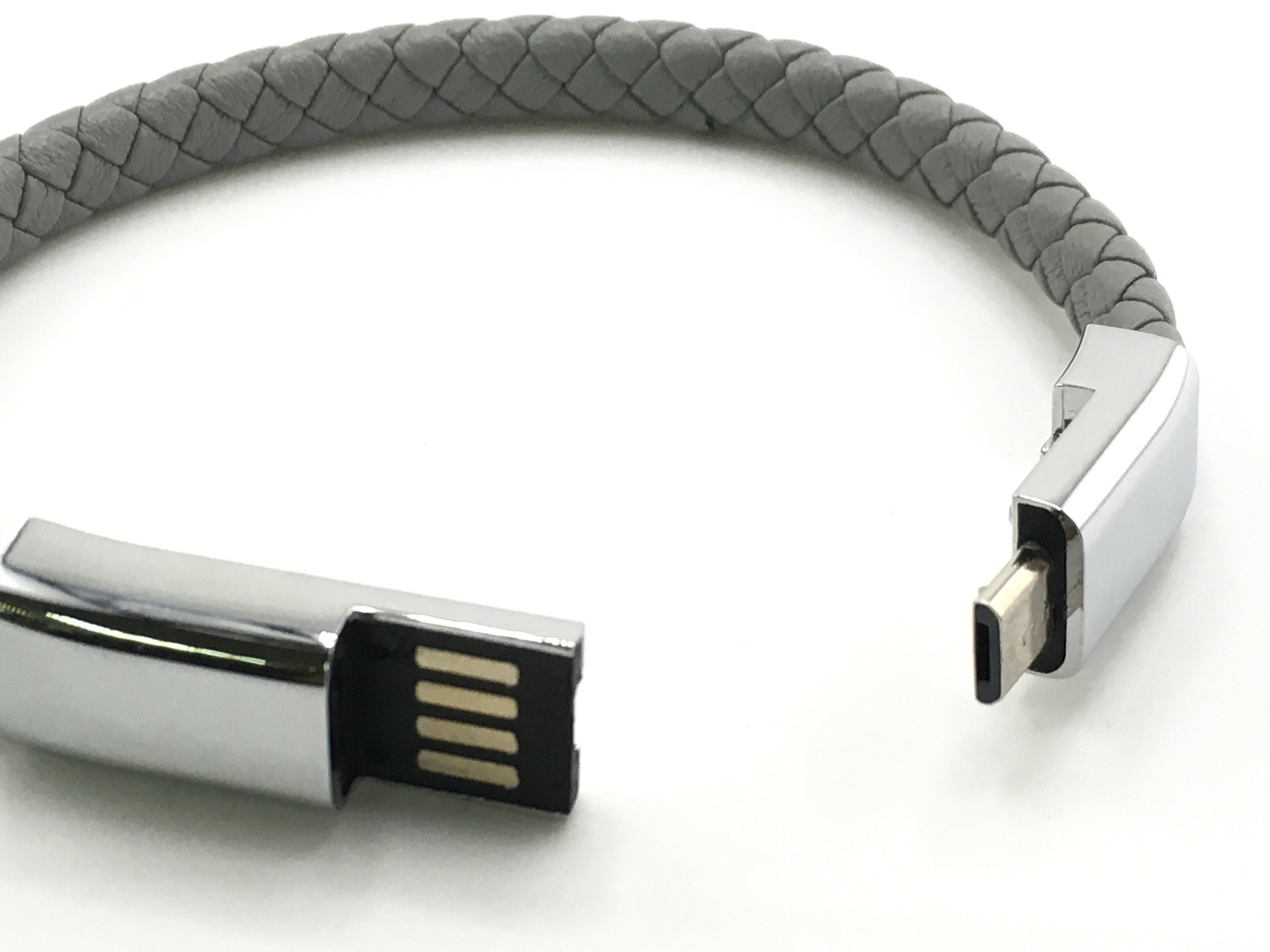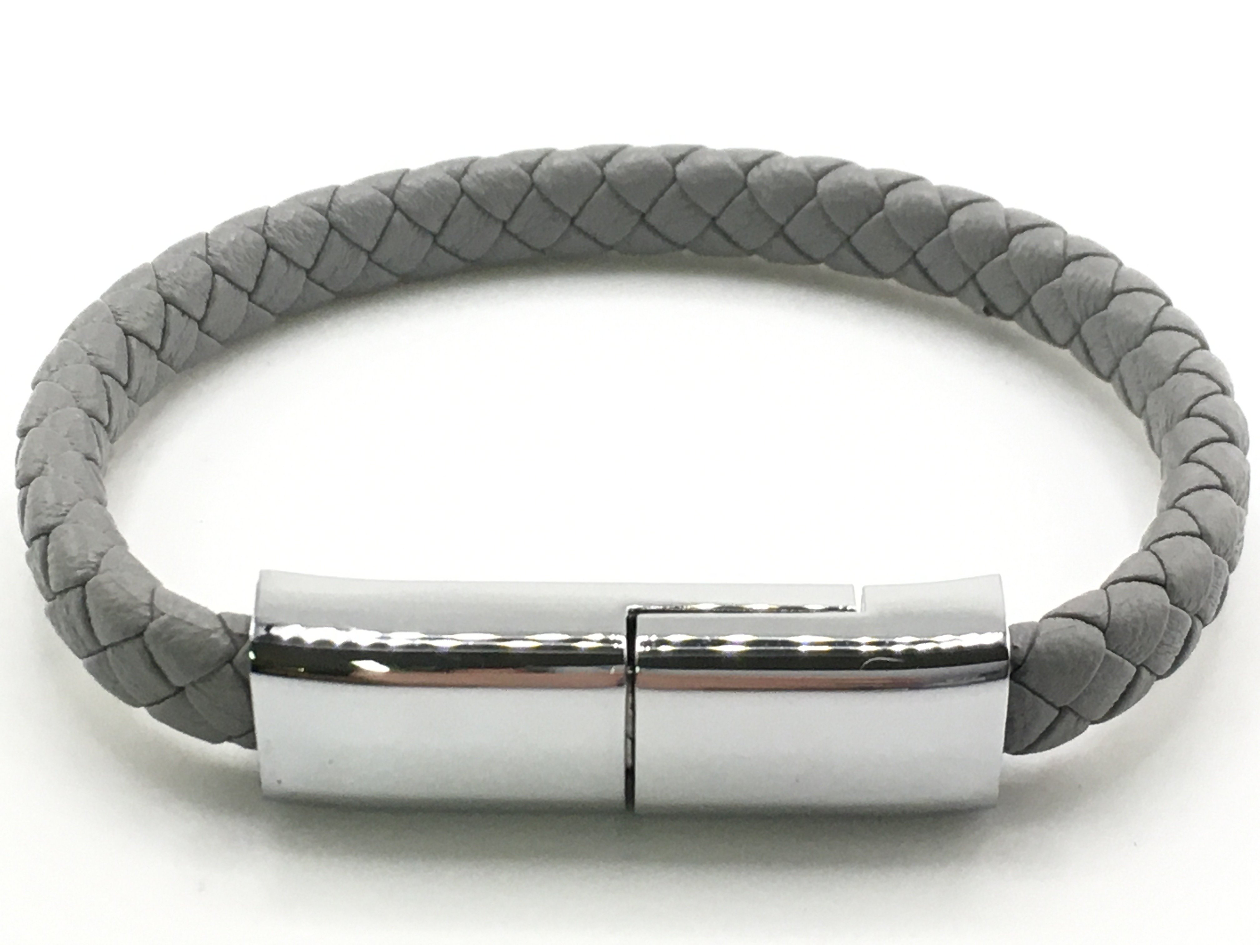 A grey leather effect rose-style bracelet with stainless steel centre opening USB style clasp. Postage category a