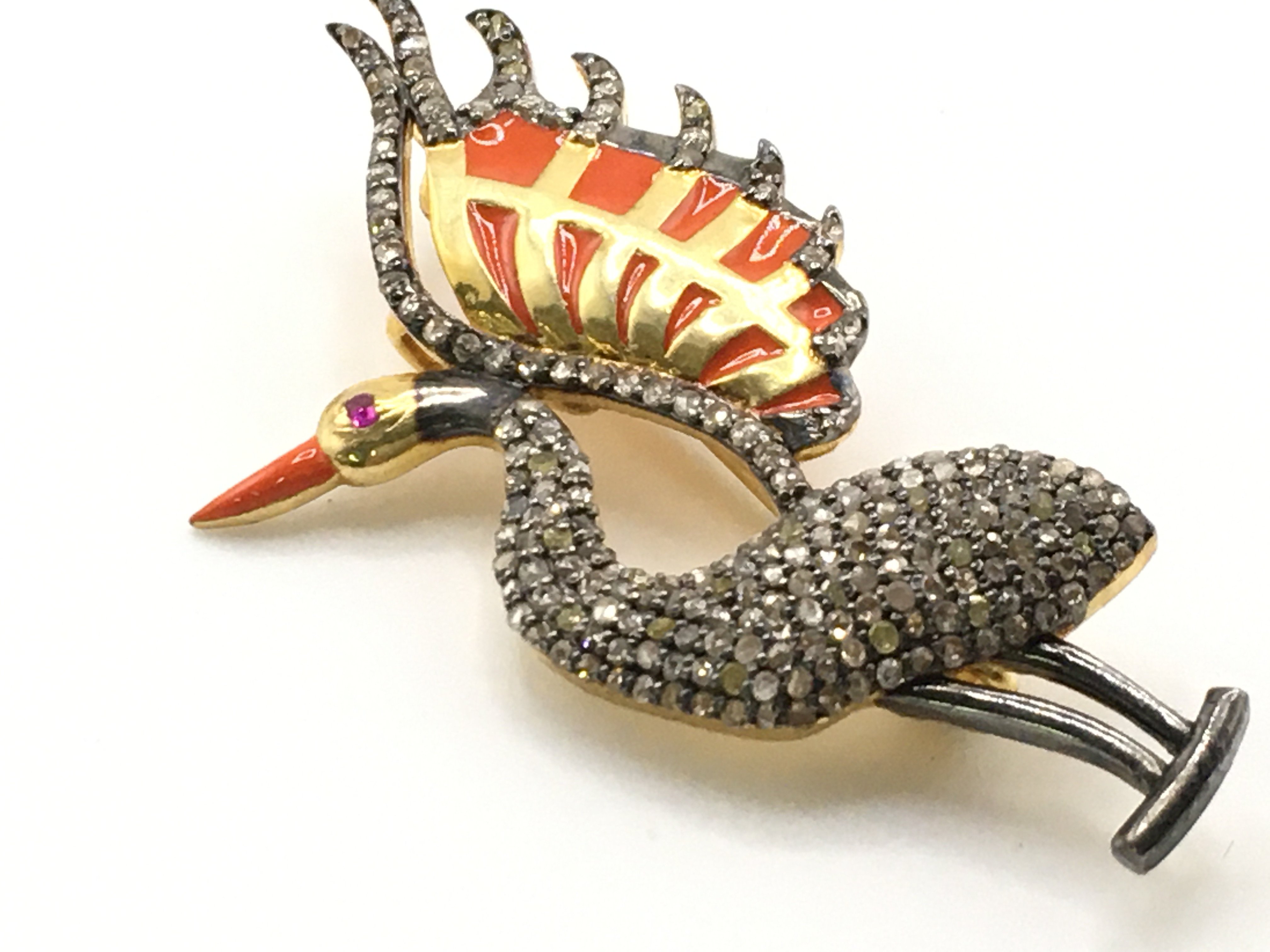 A silver gilt wading bird brooch inlaid with rich orange enamel and set with rose-cut diamonds, with a ruby eye. Diamonds 1.61ct, ruby 0.03ct
