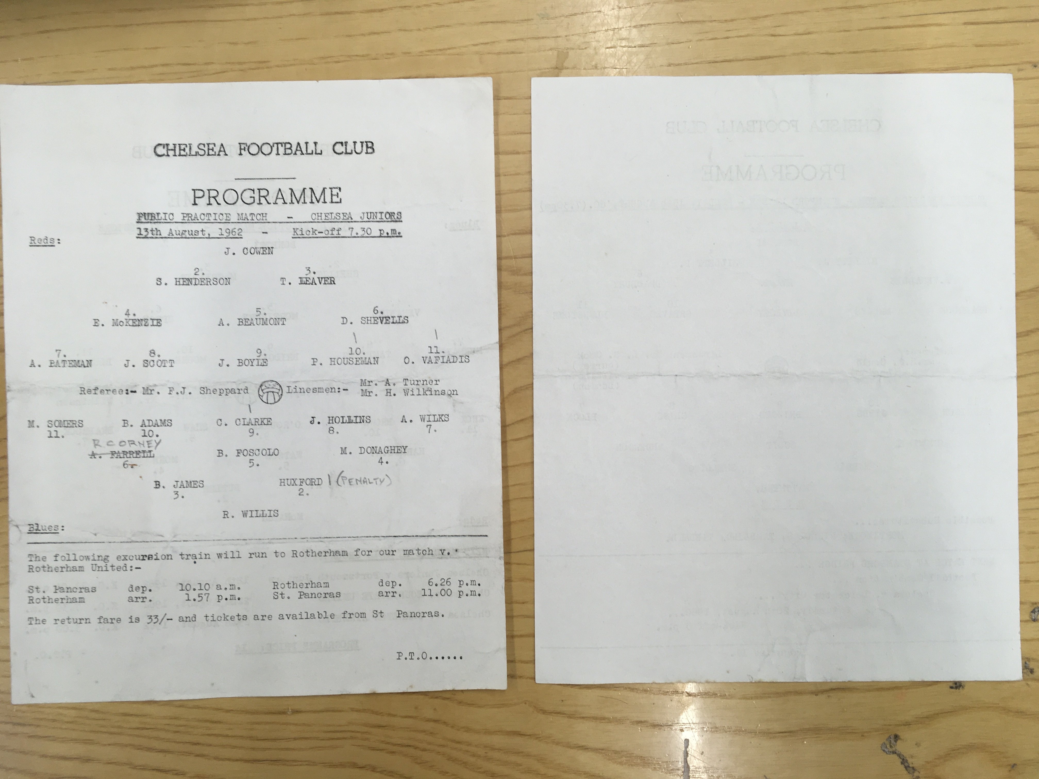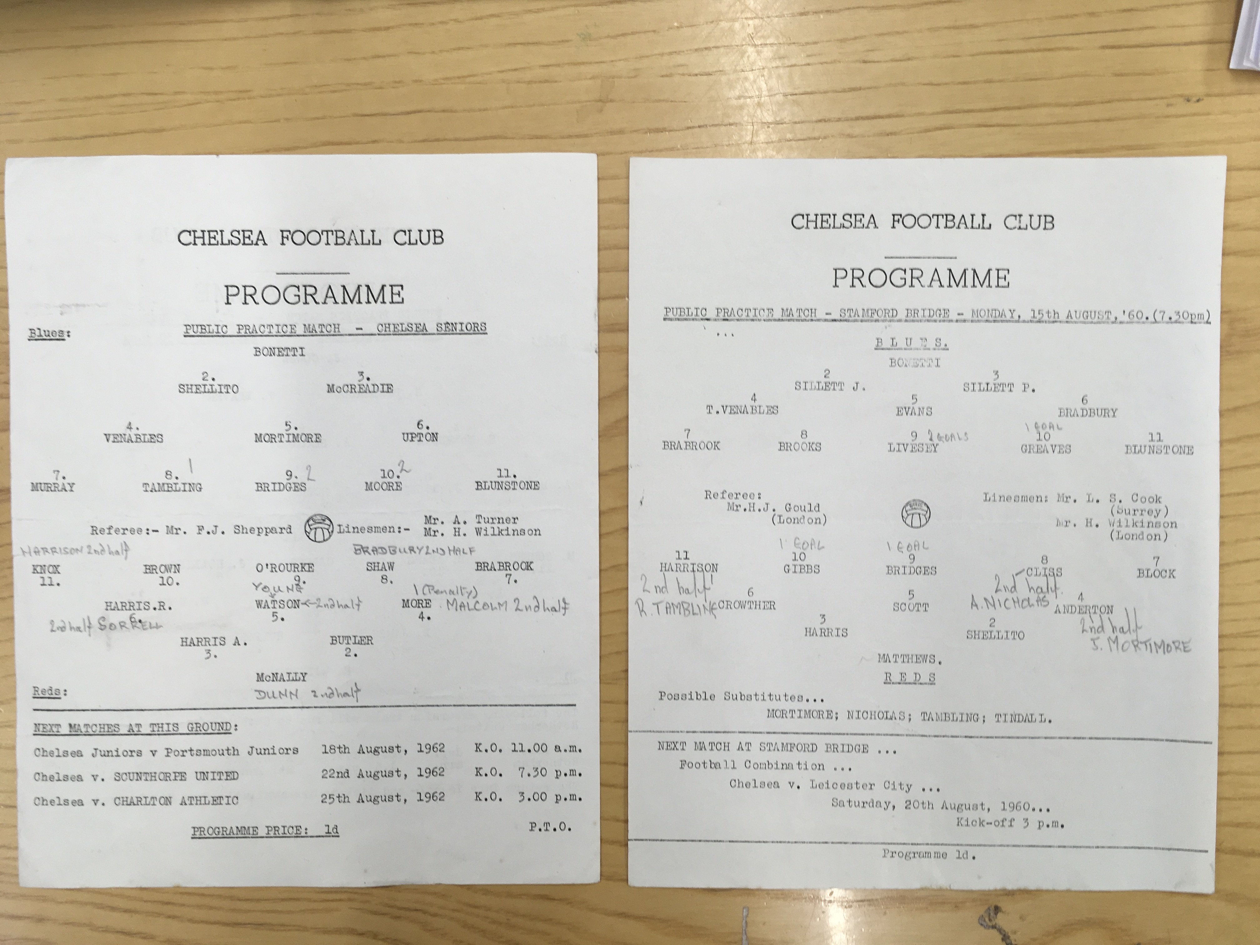 1960 + 1962 Chelsea Practice Match Football Programmes: 1960 Blues v Reds dated 15/8/60 and and two sided 1962 which has Seniors one side and Juniors the other dated 13/8/62. Both single sheets very good with pencilled team changes. (2)
