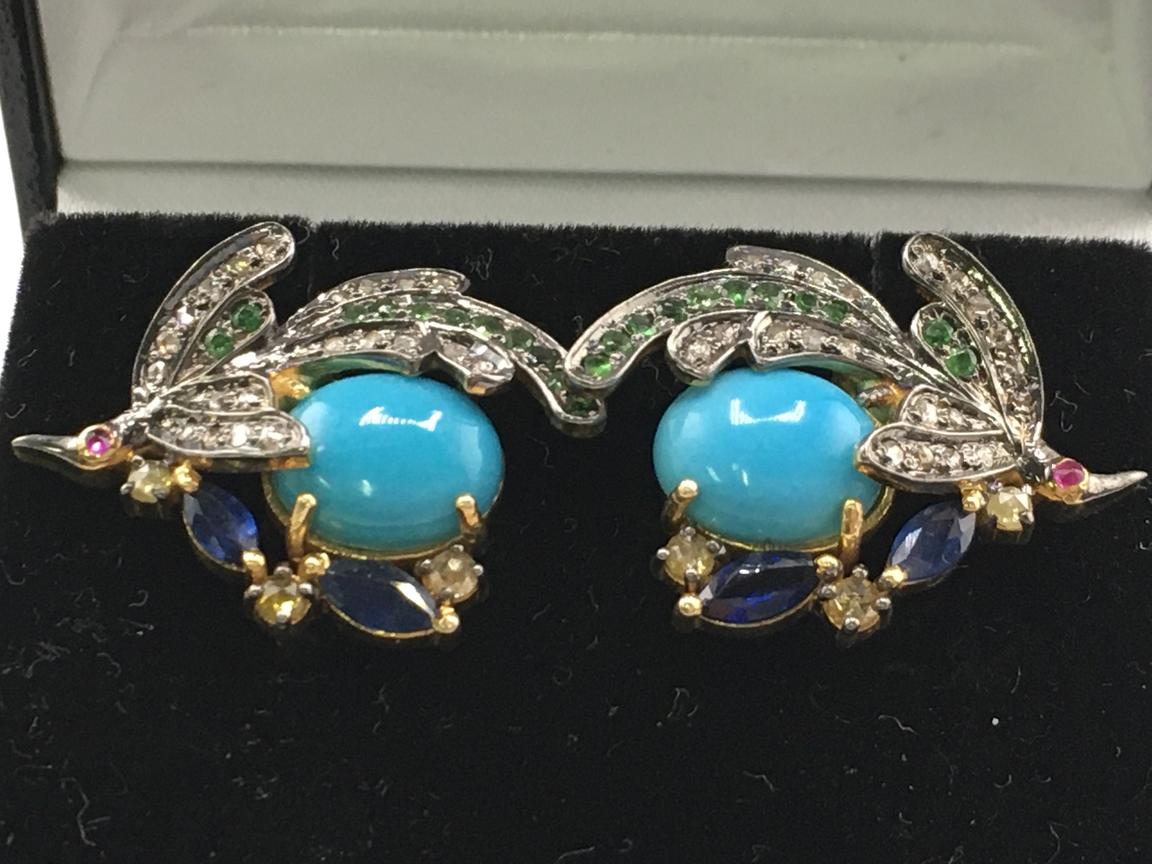 A pair of exotic bird of paradise earrings in silver gilt, set with cabochon turquoise, marquise-cut sapphires, round cut emeralds, rubies and diamonds. Turquoise 4.23ct. Sapphires 0.78ct. Emeralds 0.28ct. Diamonds 0.67ct. Postage category a