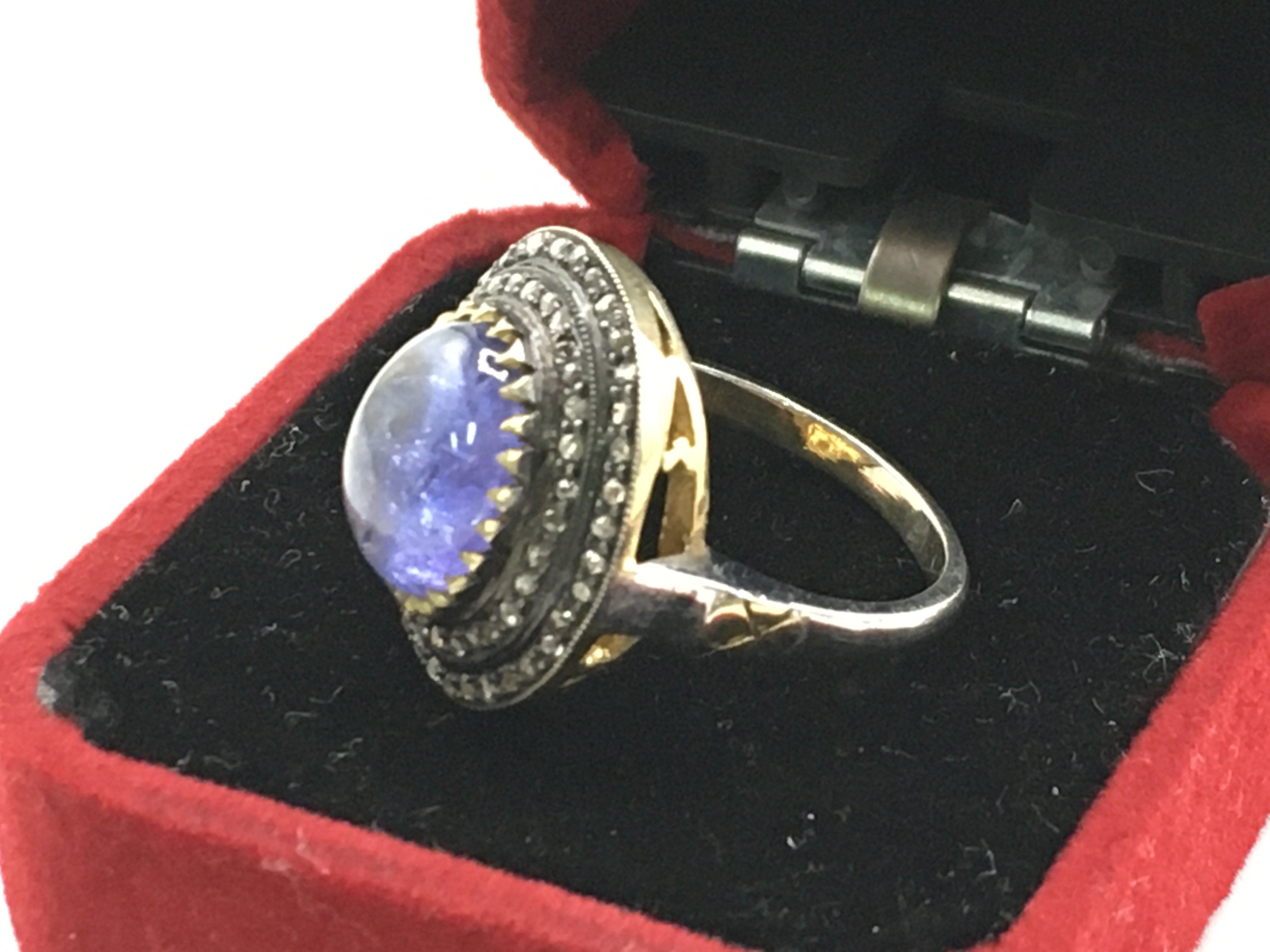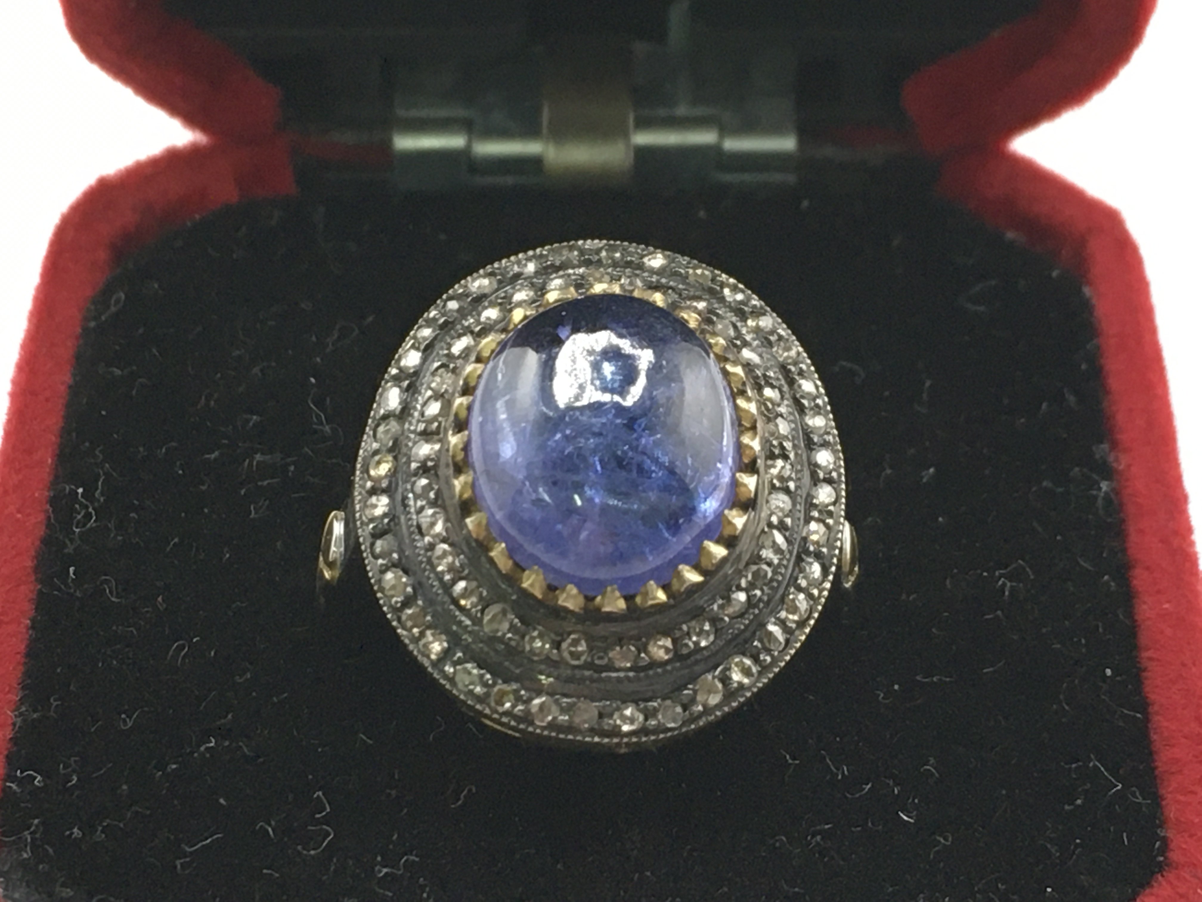 A cabochon tanzanite and diamond cluster ring. Tanzanite 5.38ct, diamonds 0.52Ct. Size Q. Postage category a