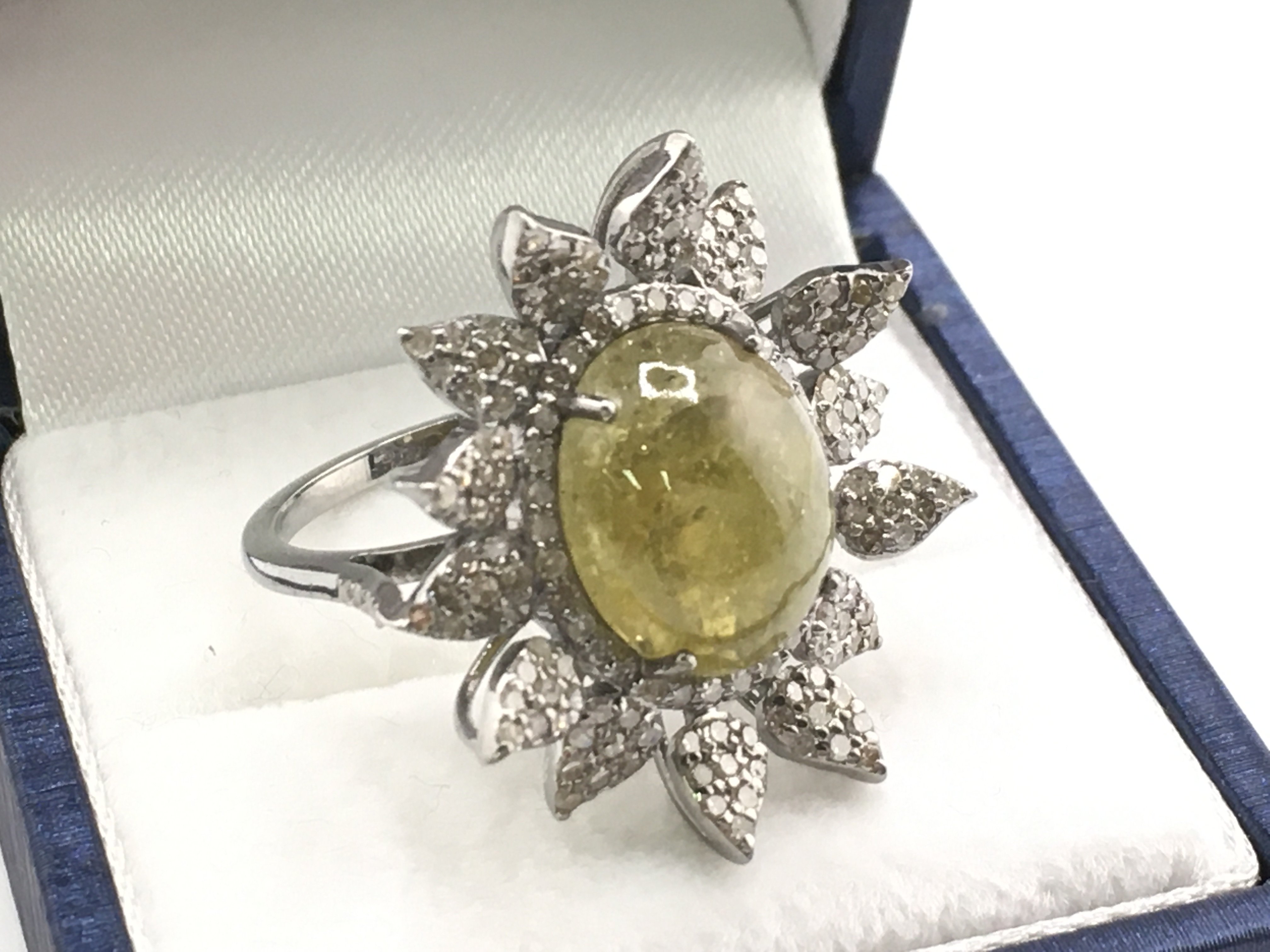 A floral style ring set with a central oval cabochon green tourmaline, with surrounding diamond-set leaves in white metal. Tourmaline 7.18ct. Diamonds 1.11ct. Postage category a