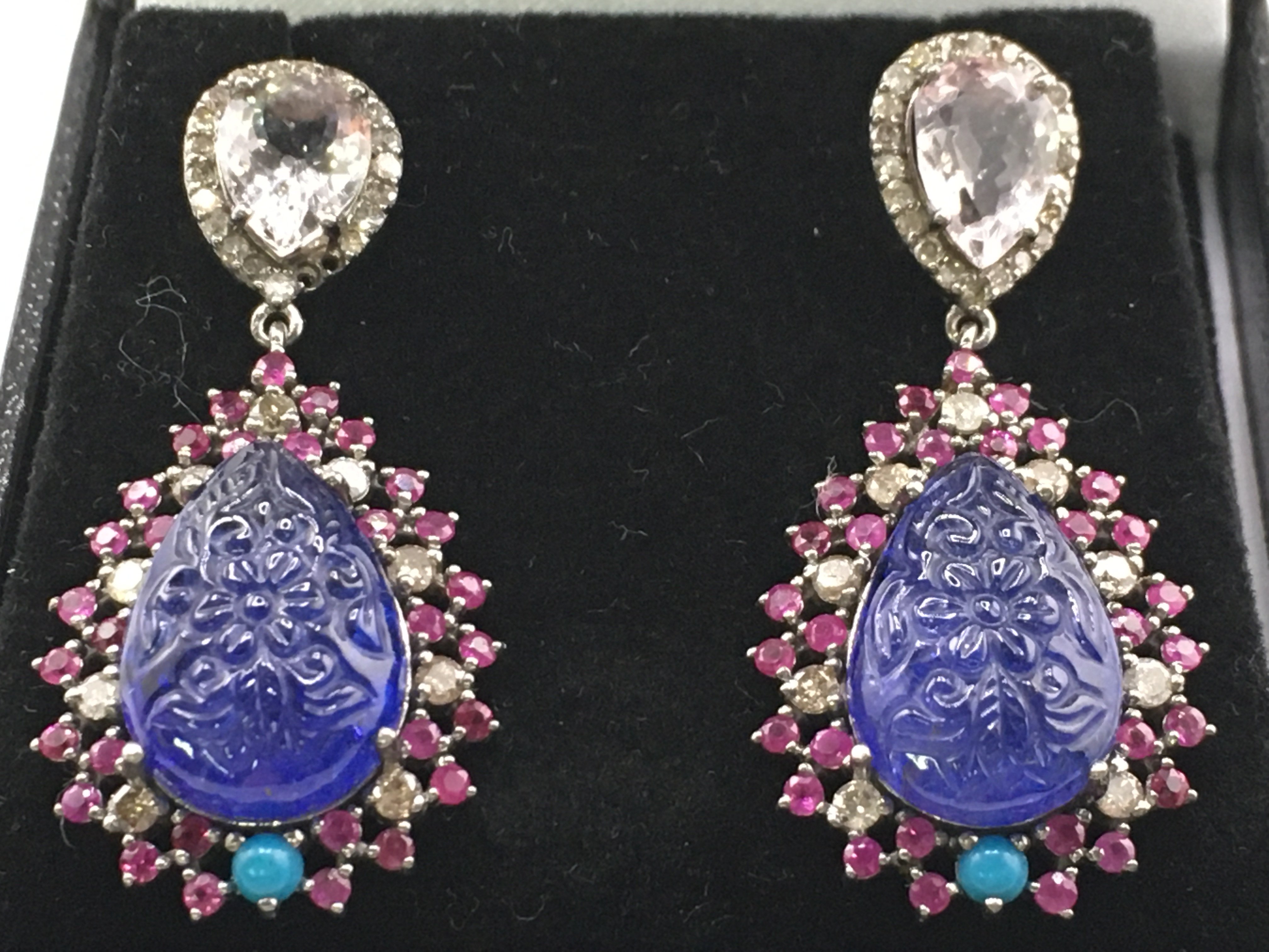 A pair of large drop earrings set with pear shaped carved tanzanites, turquoise, morganites, rubies and diamonds, stamped 14k with 9ct white gold backs. Tanzanites 27.19ct, morganites 3.63ct, diamonds 1.15ct, ruby 1.85ct. Total weight 13.4g Postage category a