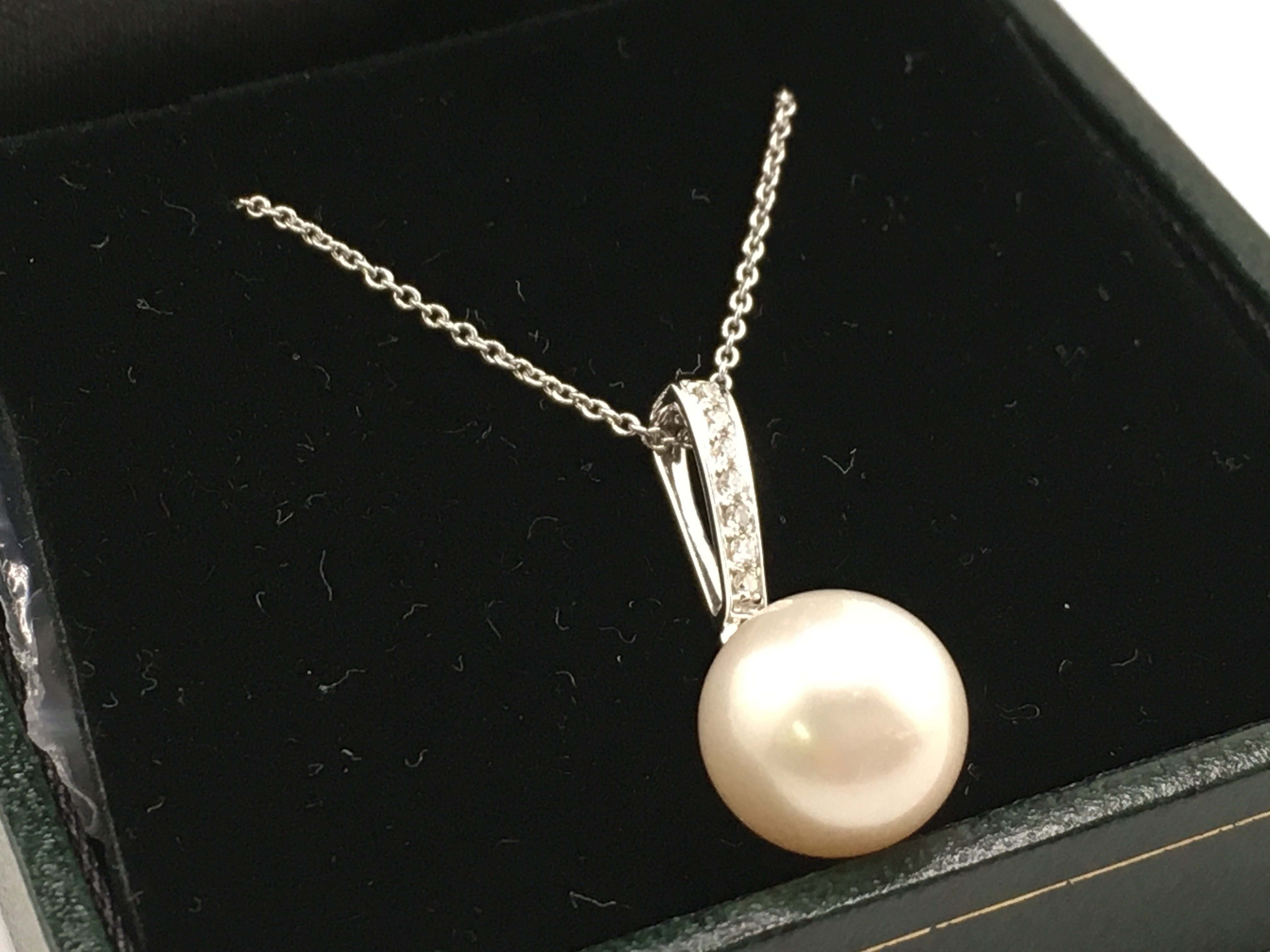 A 9 carat white gold round freshwater pearl and diamond pendant on a 9ct white gold chain. Diamonds 0.07ct. 3.3g total weight. Postage category a