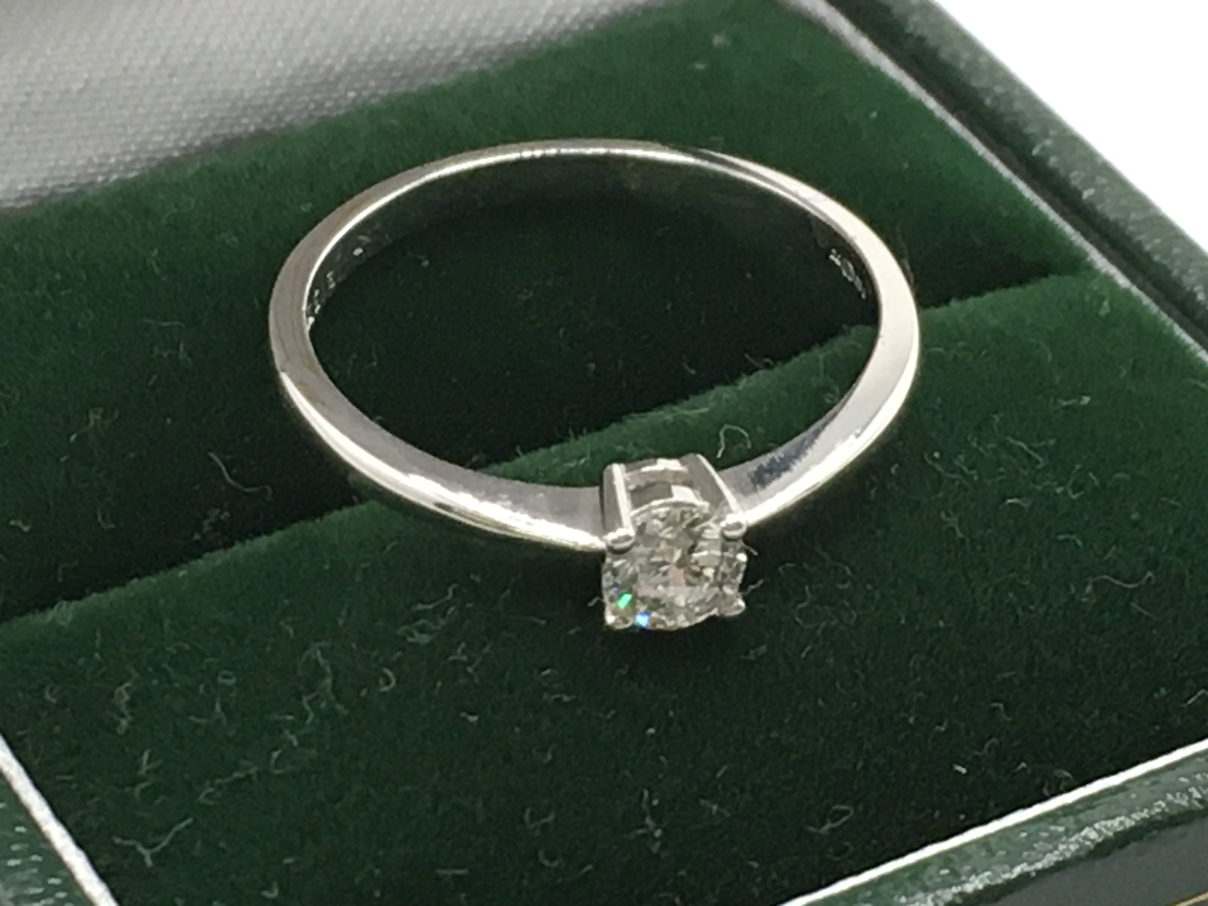 A 9ct white gold RBC diamond solitaire ring, diamond 0.25ct. Size N, 1.6g. Postage category a