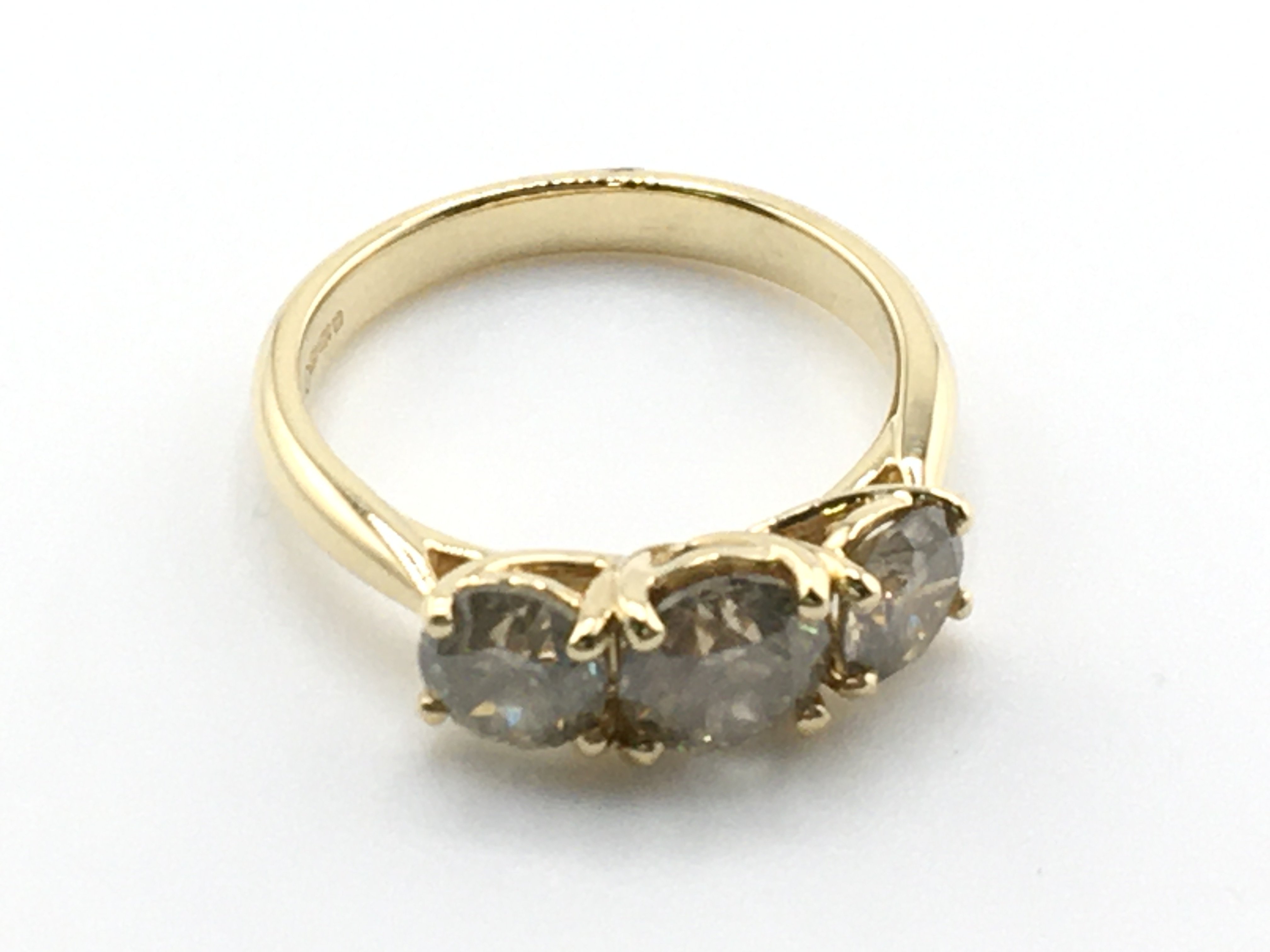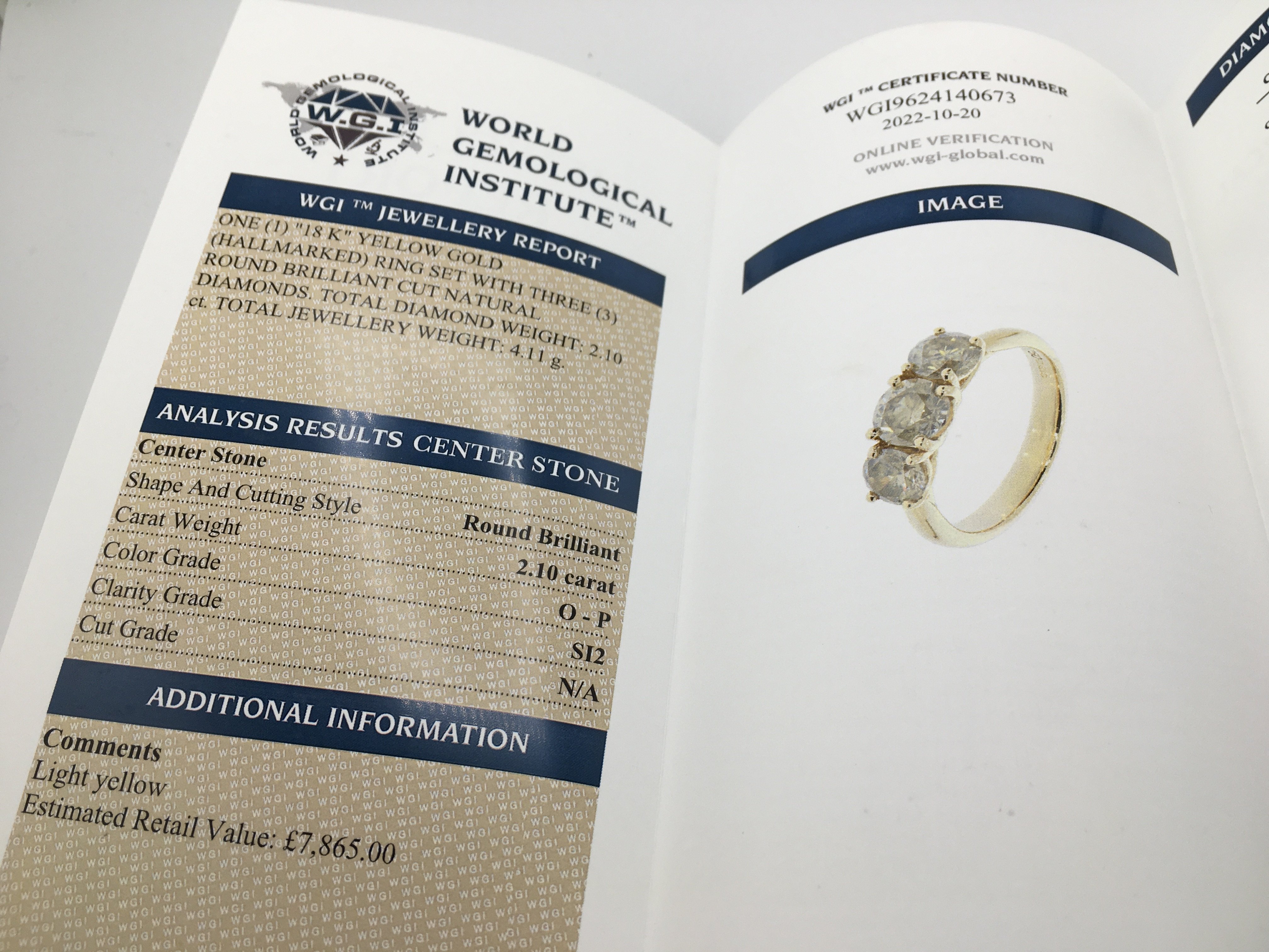 A certificated 18ct yellow gold trilogy ring, diamonds 2.10ct, cert no WGI9624140673. Ring size M, 4.1g. Postage category a