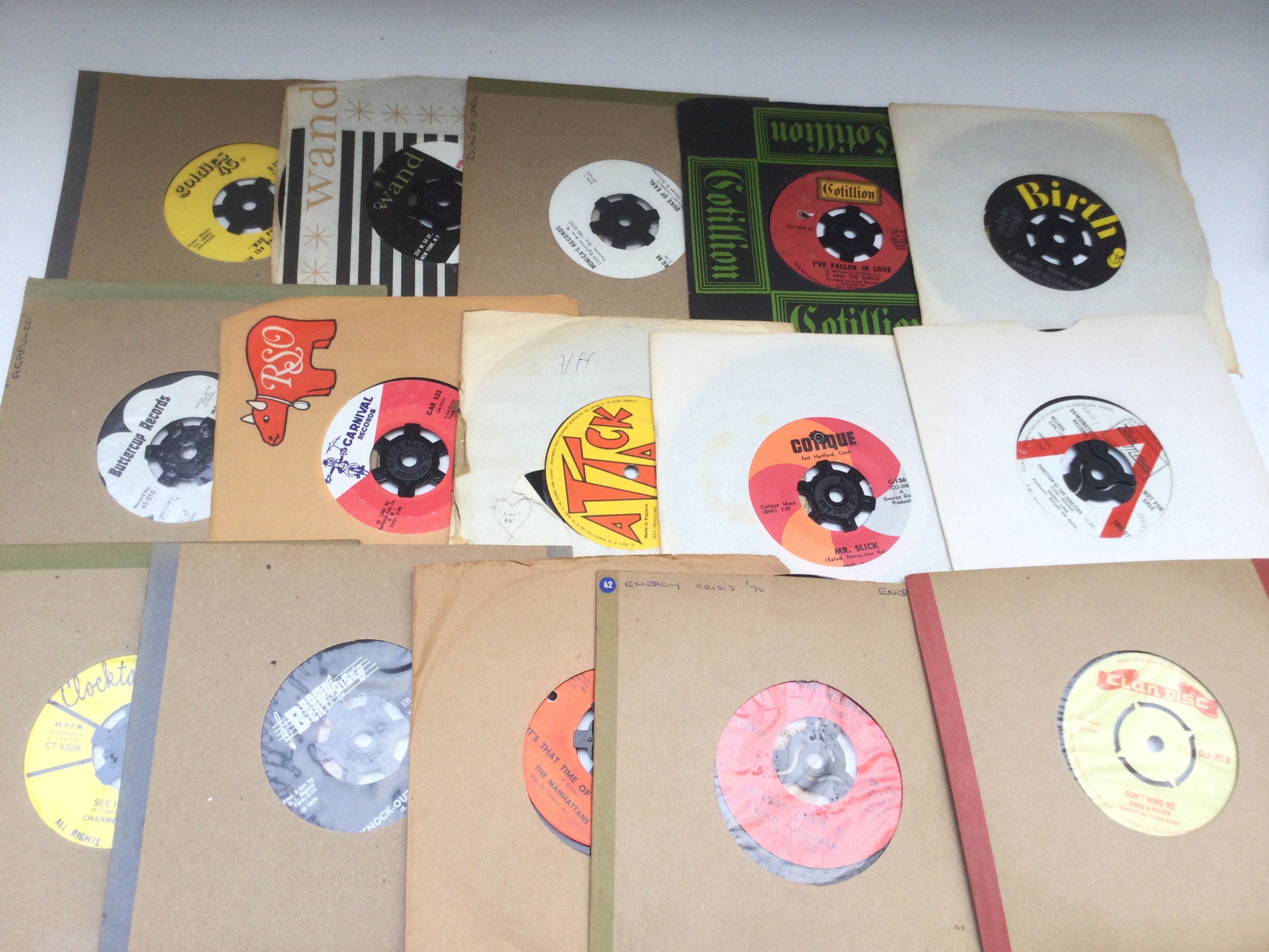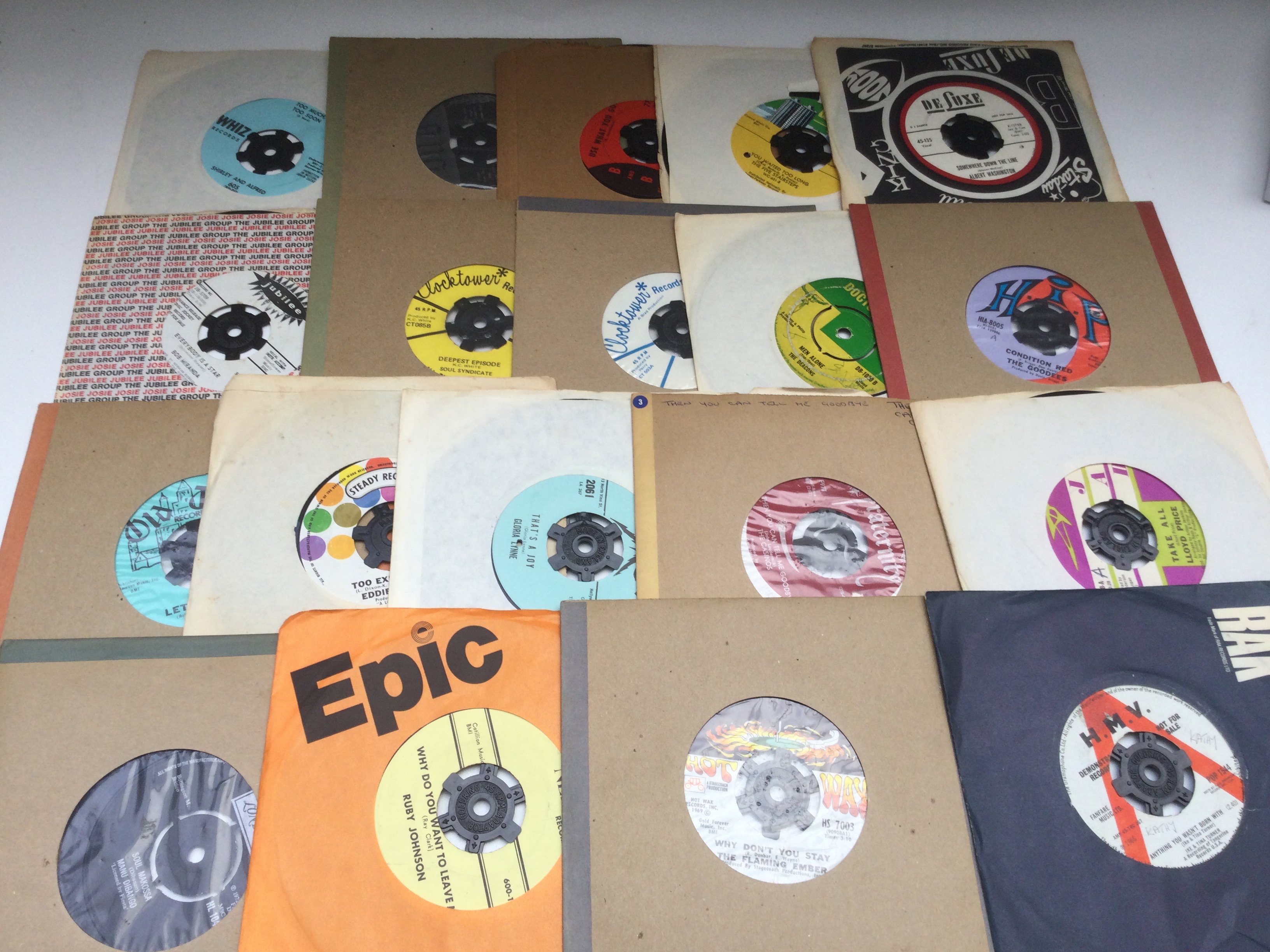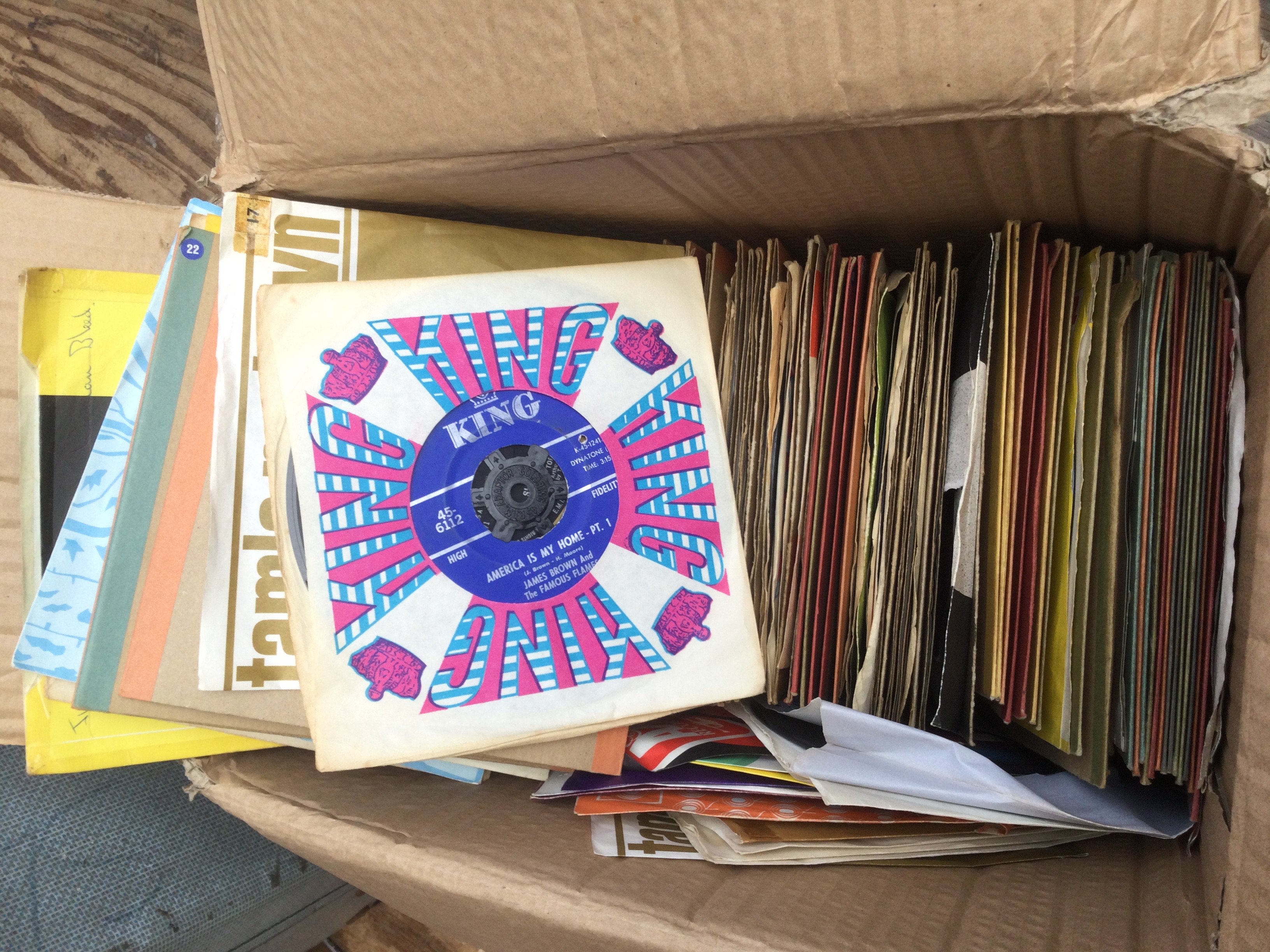 A box of soul, funk and reggae 7" singles by various artists including James Brown, Ike and Tina Turner, Upsetters and many more. Includes some demo discs.