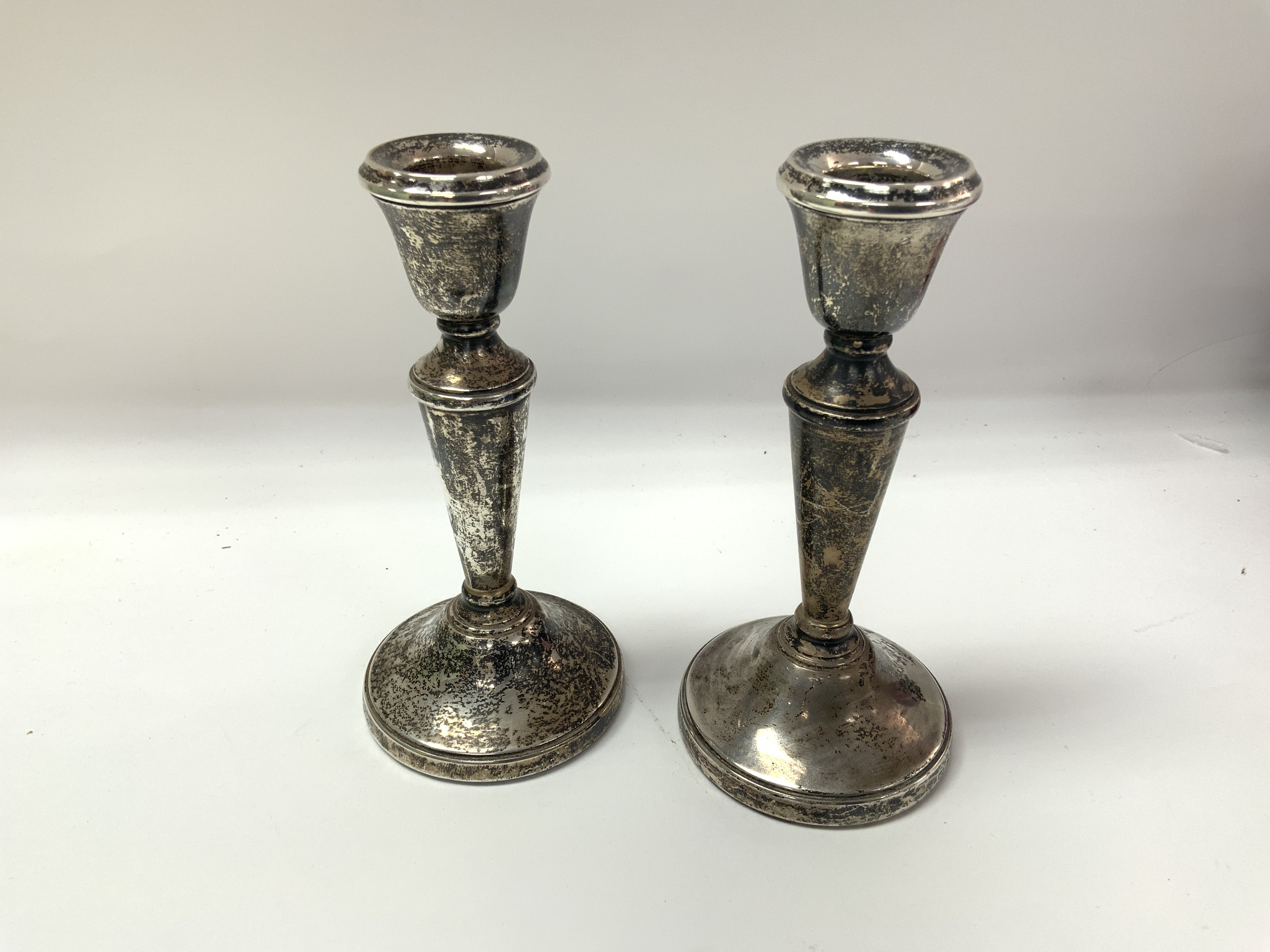A pair of sterling silver candlesticks with Birmingham hallmarks. Approx height 14cm.